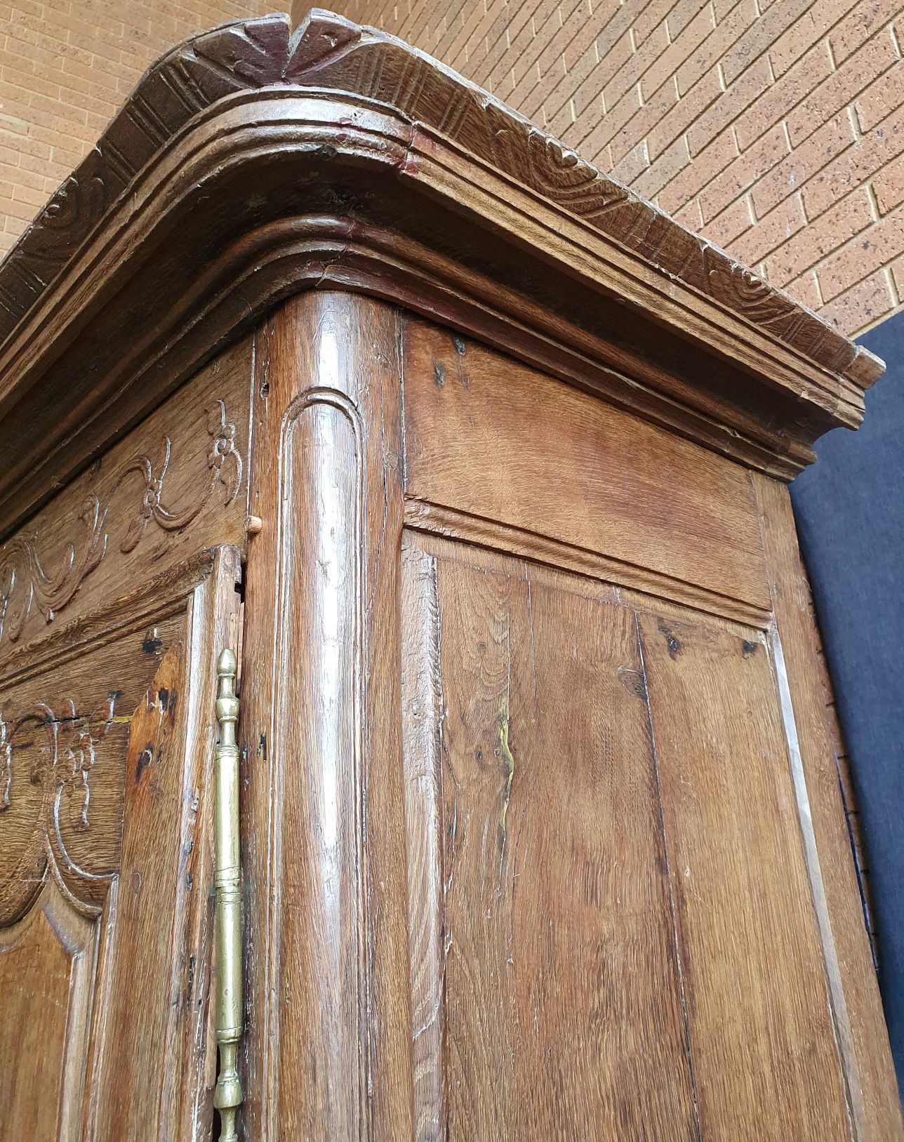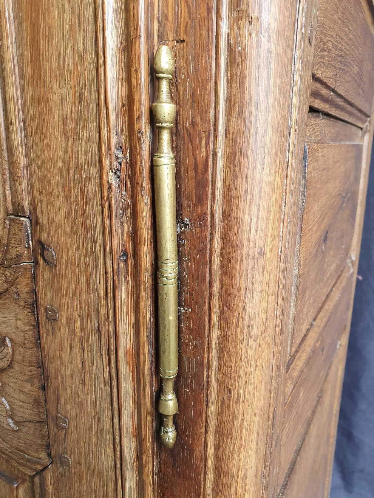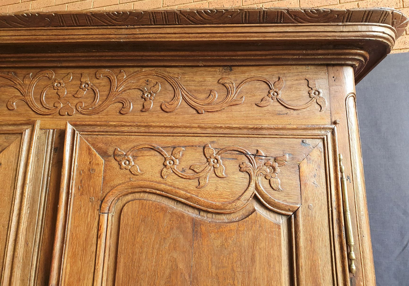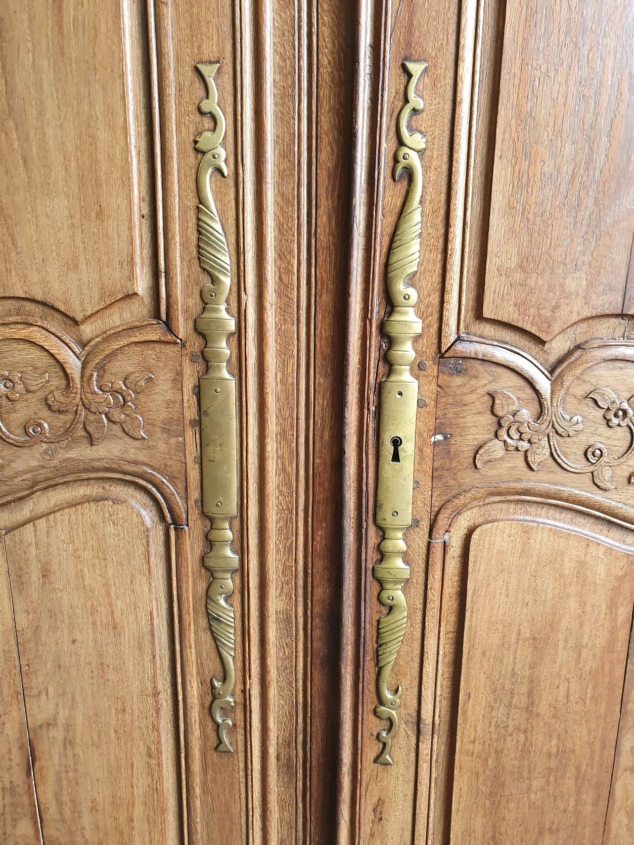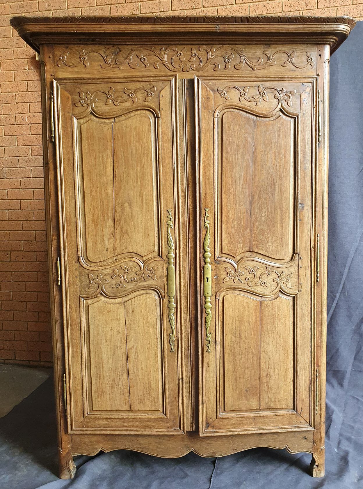 An 18th century French solid oak two-door 'Armoire de Mariage', haut-relief and bas-relief carved, internally fitted with shelves. Traditionally given as a gift to a newly-wed couple, this 'marriage' Armoire is decorated with allegorical motifs, including trellises of Spring flowers (for Youthfulness, fertility). Retaining a very nicely faded and well-burnished original patination. The rear and interiors show the adze and bow-saw toolmarks of its early construction techniques. France, circa 1770.