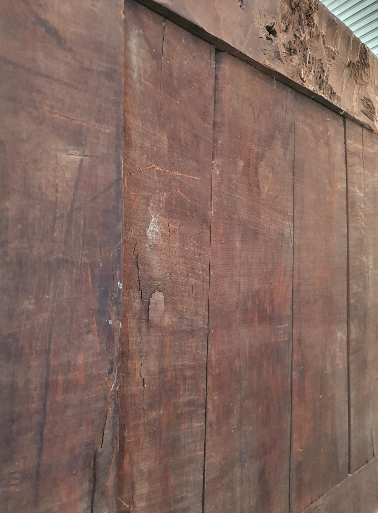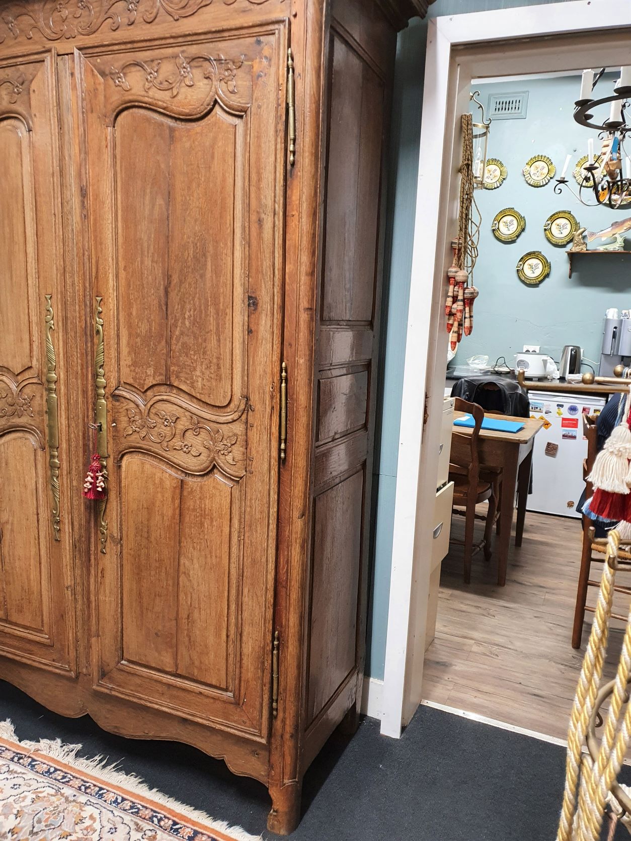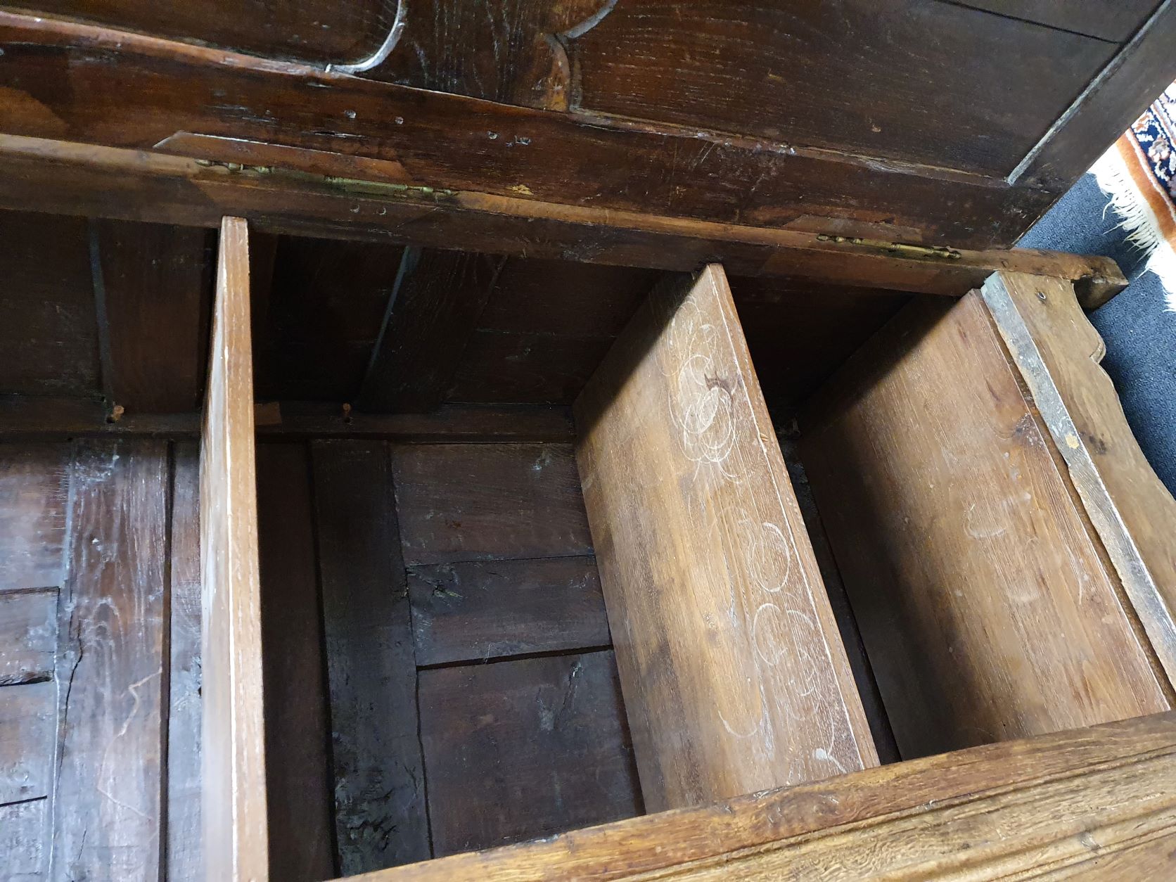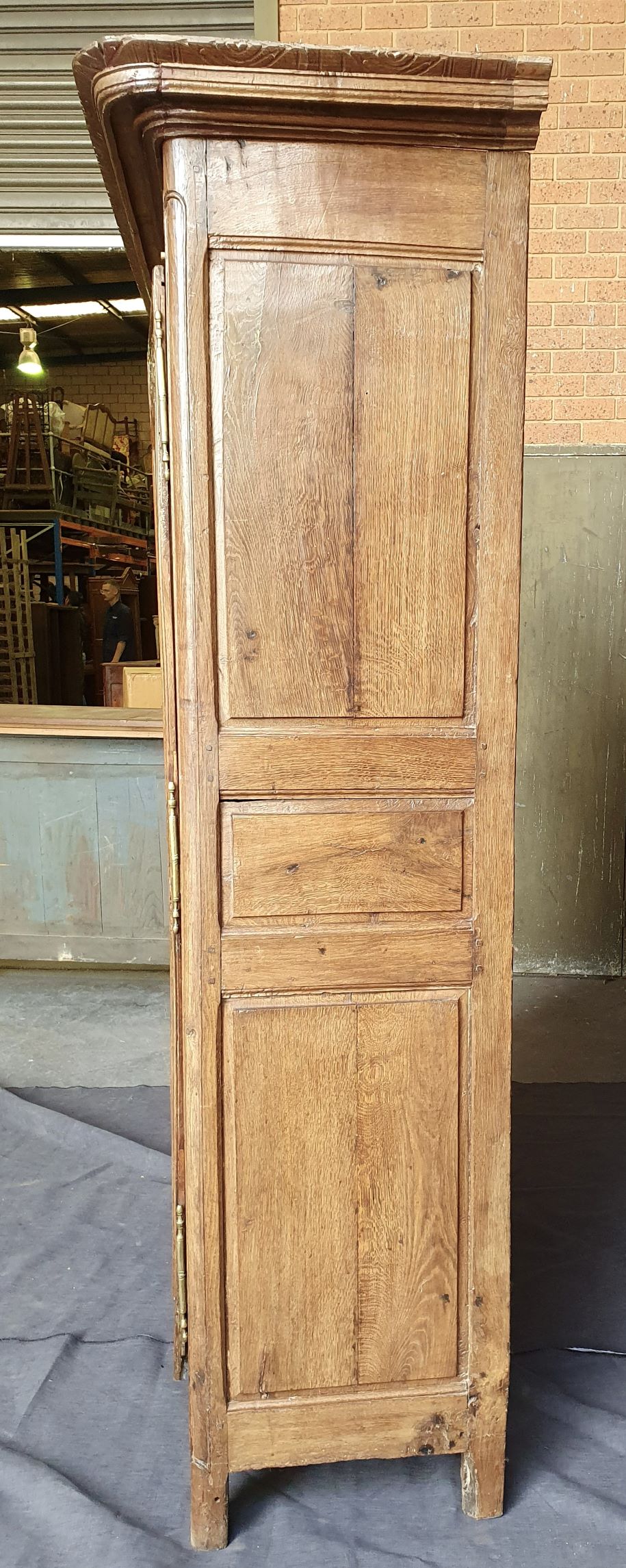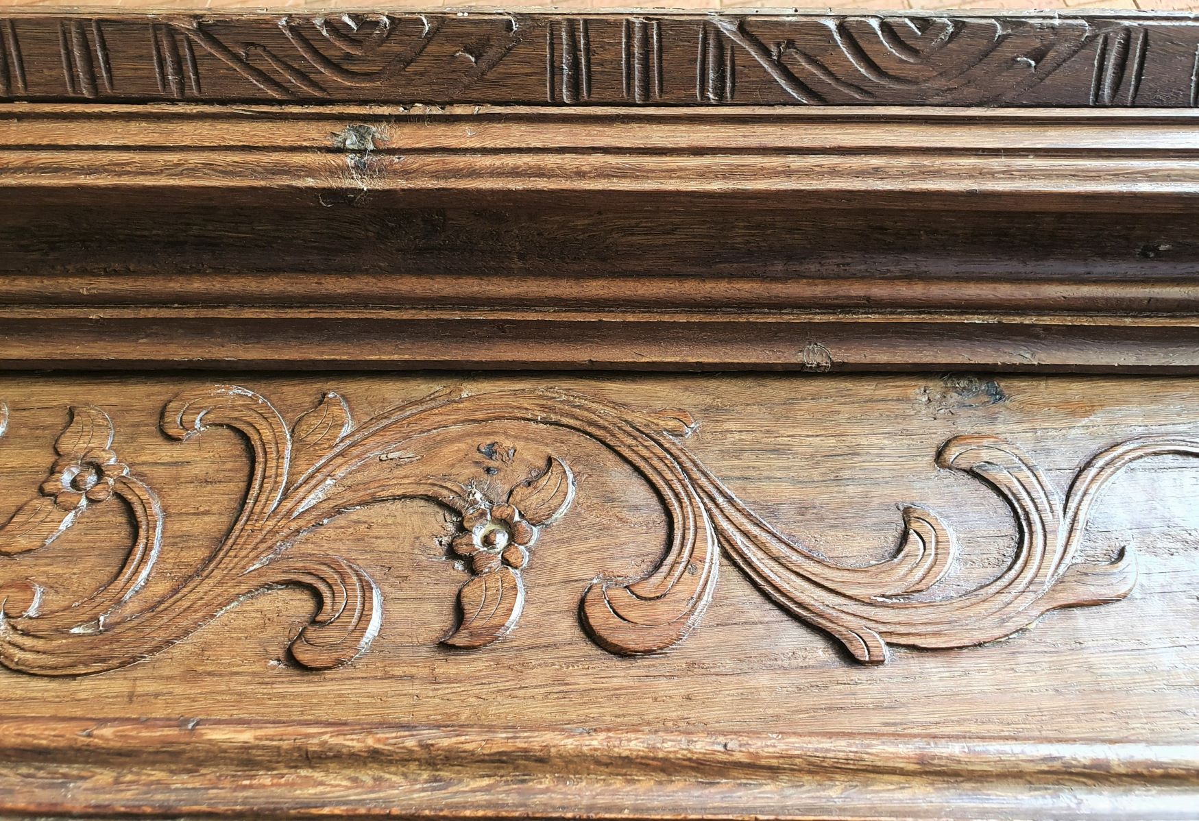 An 18th century French solid oak two-door 'Armoire de Mariage', haut-relief and bas-relief carved, internally fitted with shelves. Traditionally given as a gift to a newly-wed couple, this 'marriage' Armoire is decorated with allegorical motifs, including trellises of Spring flowers (for Youthfulness, fertility). Retaining a very nicely faded and well-burnished original patination. The rear and interiors show the adze and bow-saw toolmarks of its early construction techniques. France, circa 1770.