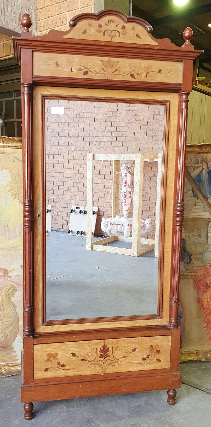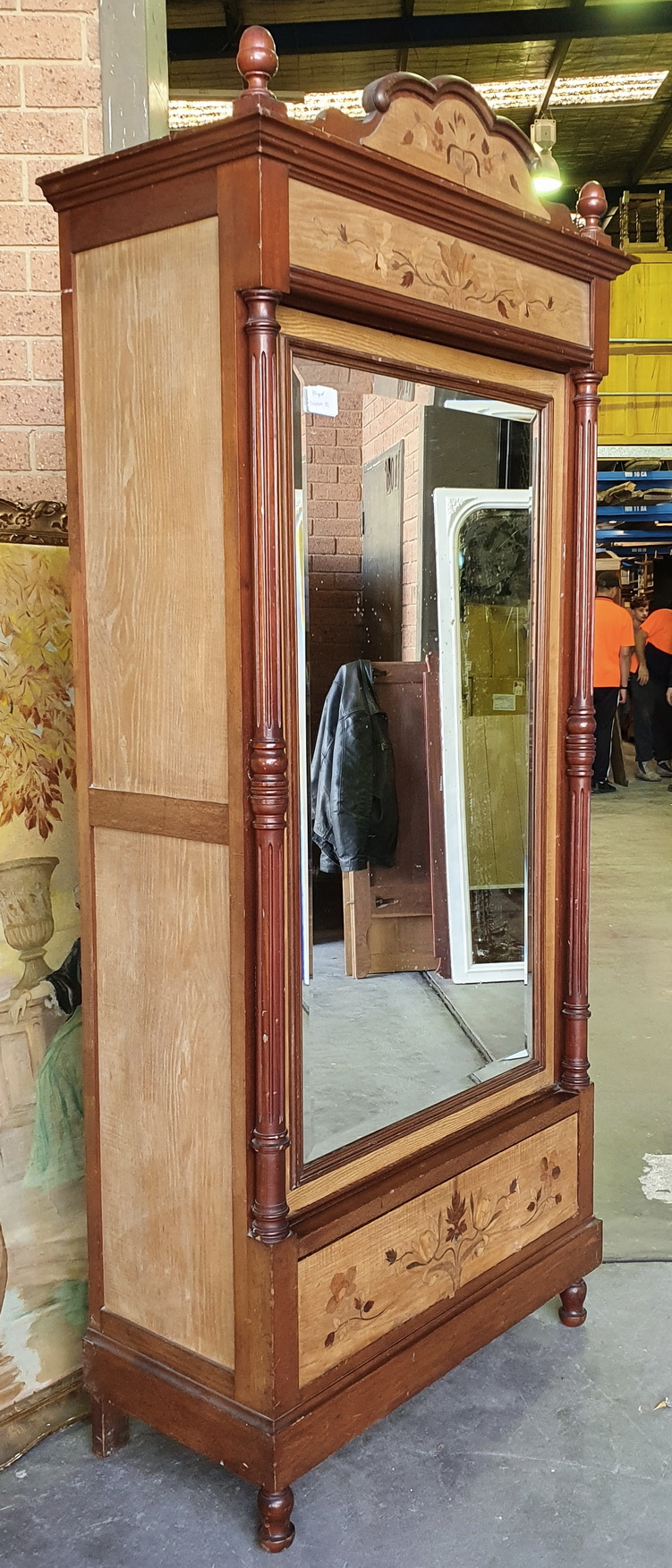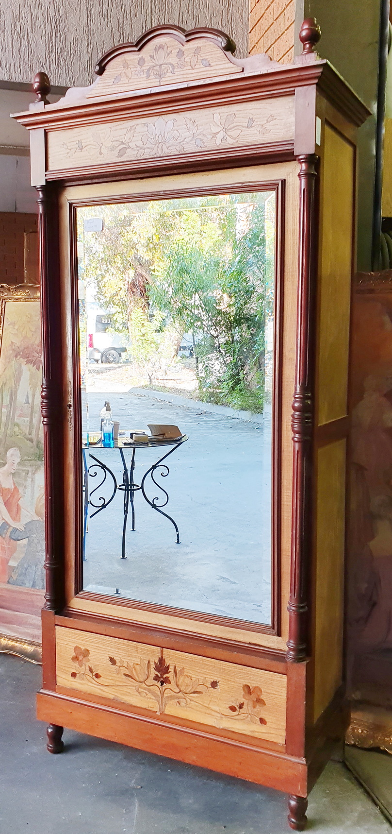 A 19th century French Art Nouveau period, inlaid elm and mahogany Armoire, fitted with a shaped and inlaid pediment with acorn-shaped finials above a single door, retaining its original bevelled mirror plate. A drawer is fitted to the plinth. Please note the high quality and colours of the floral and foliate Art Nouveau style inlays. Internally fitted with the original adjustable-height shelves, on request our workshop is able to fit a hanging bar to this armoire. Area of Paris, circa 1890.