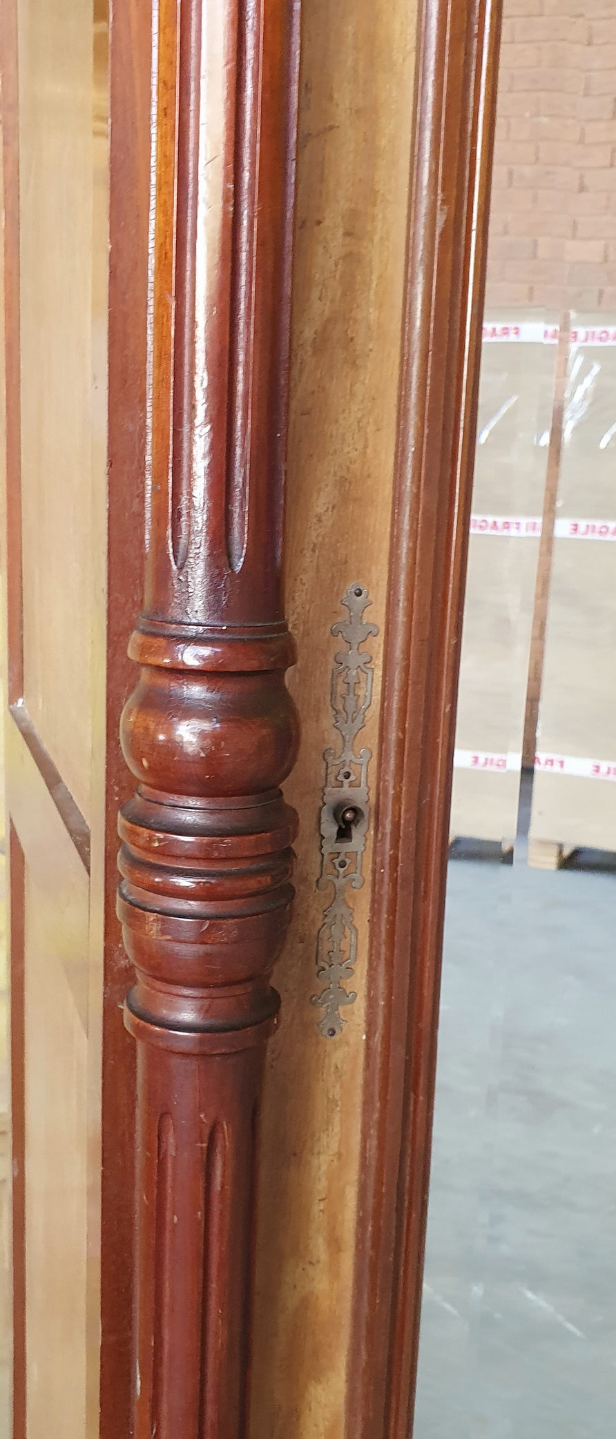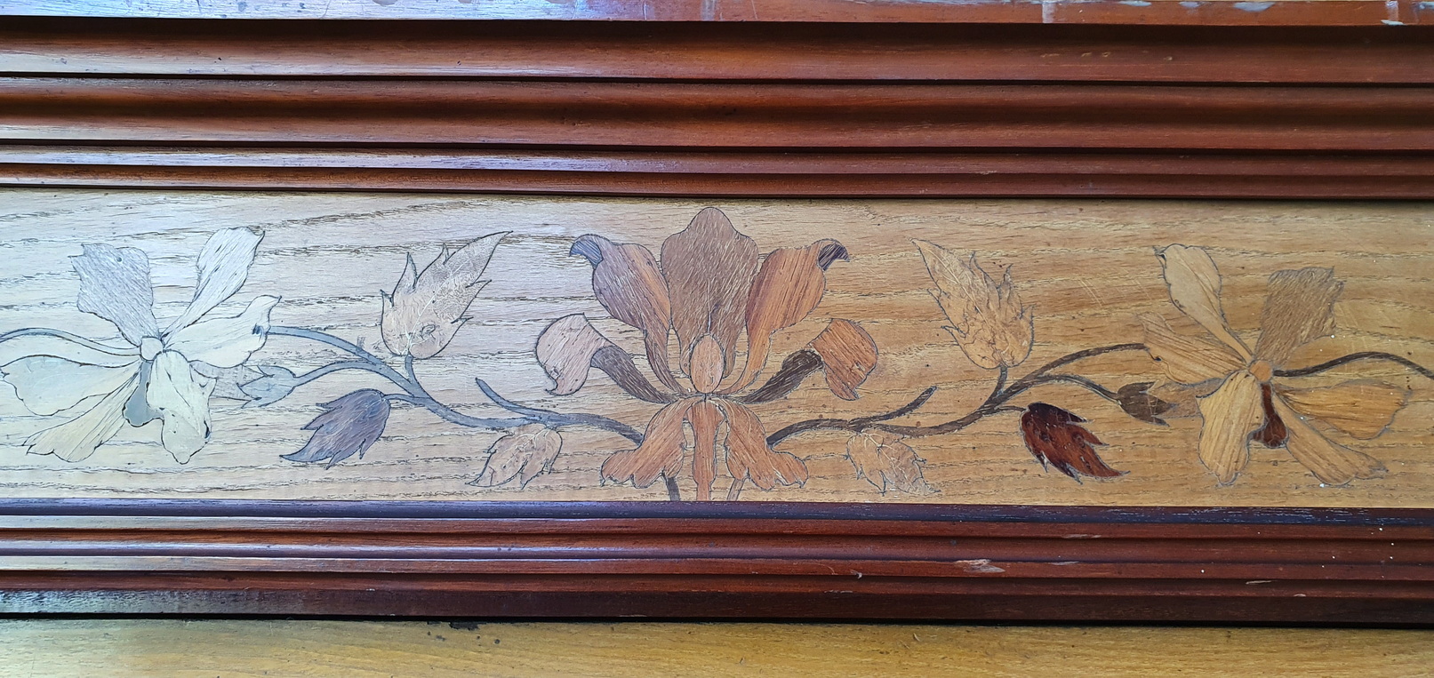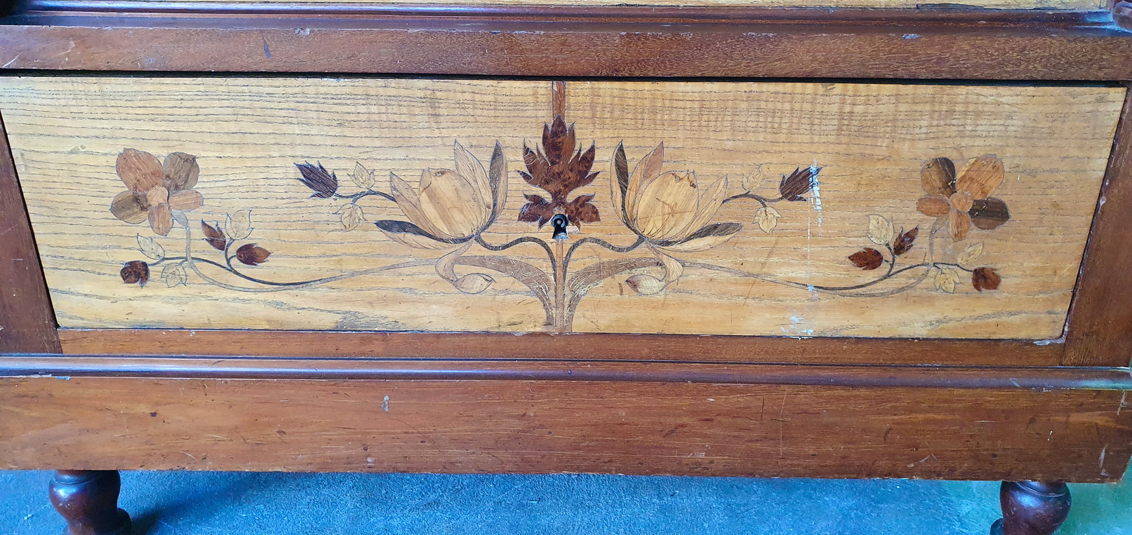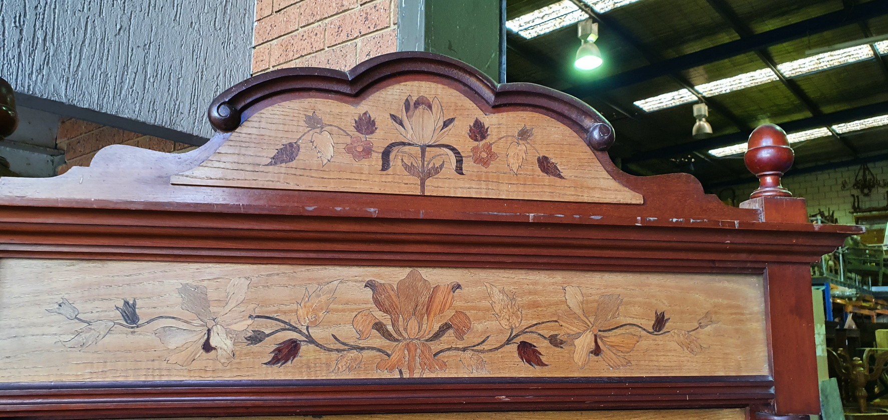 A 19th century French Art Nouveau period, inlaid elm and mahogany Armoire, fitted with a shaped and inlaid pediment with acorn-shaped finials above a single door, retaining its original bevelled mirror plate. A drawer is fitted to the plinth. Please note the high quality and colours of the floral and foliate Art Nouveau style inlays. Internally fitted with the original adjustable-height shelves, on request our workshop is able to fit a hanging bar to this armoire. Area of Paris, circa 1890.