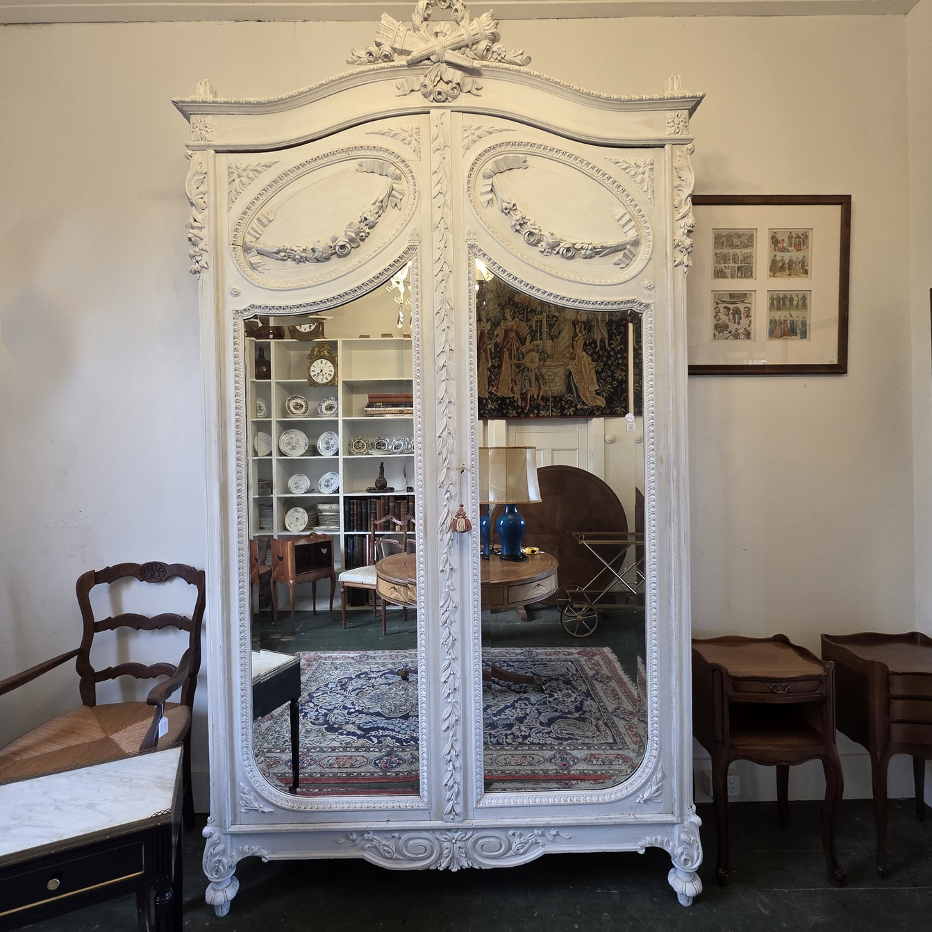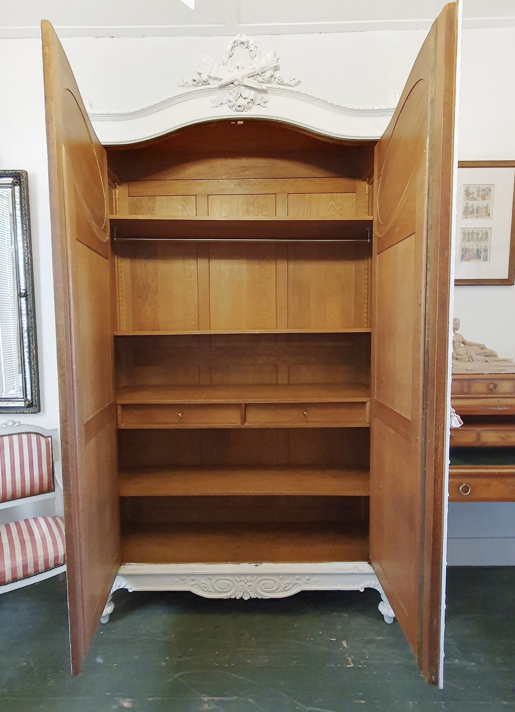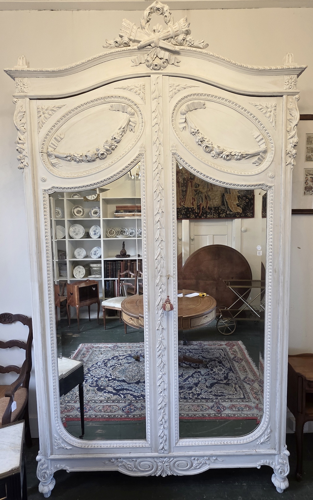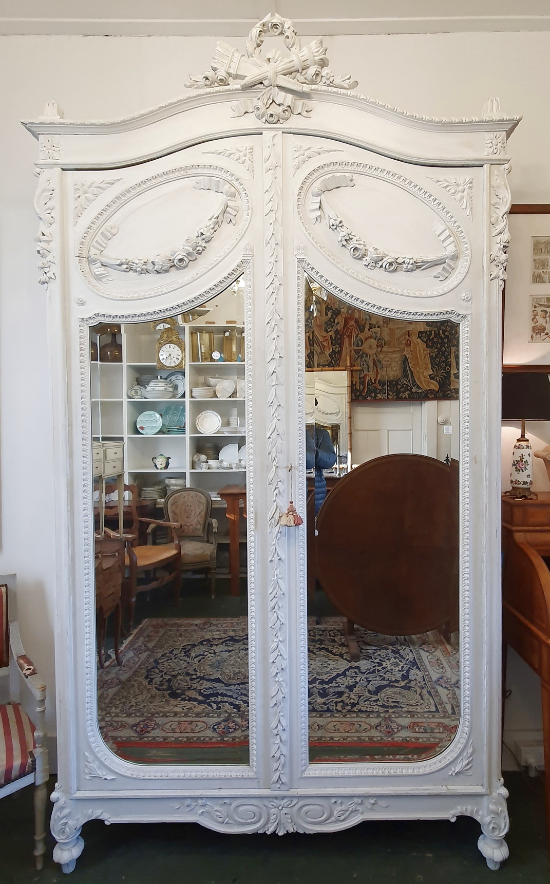 A 19th century French Louis XVI style Armoire decorated with haut-relief carved oval medallions and with carved Neoclassical elements including paterae, gadrooned mouldings, acanthus leaf garlands, and festooned with trellises of flowers and with knotted ribbons. The doors retain their original, shaped and bevelled mirrors. The elegantly curved 'Chapeau de Gendarme' pediment is fitted with finials and is decorated with a central crest displaying a quiver of arrows crossed with a flaming torch. These are Louis XVI allegories for a 'piercing intelligence' and for a 'burning passion'): the well-wishes for a successful home. The solid oak interiors retain the original, adjustable-height oak shelves, one of which is fitted with a suspended hanging-bar and another shelf is fitted with two lockable drawers. Area of Paris, circa 1880.