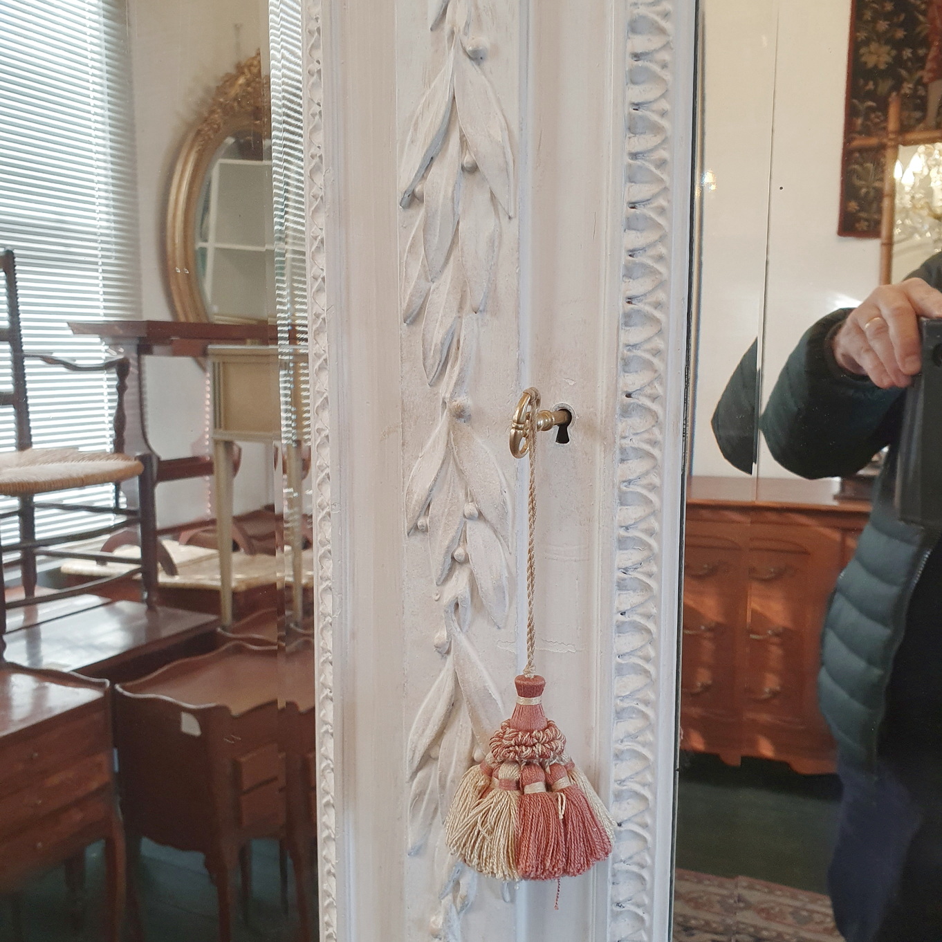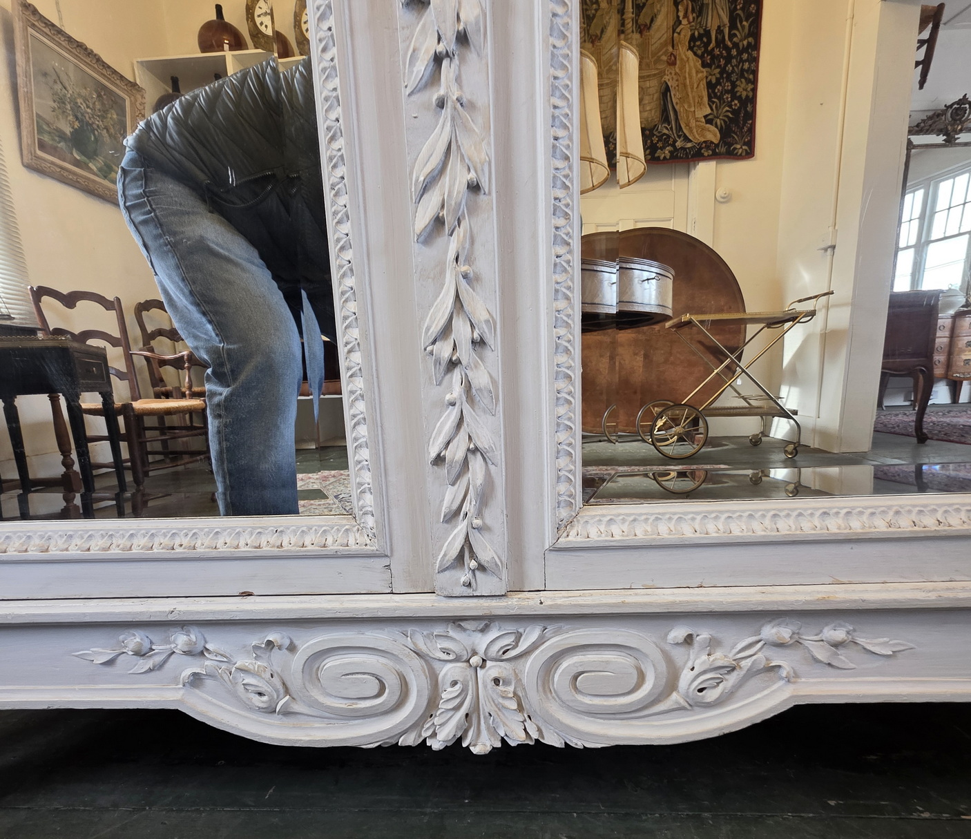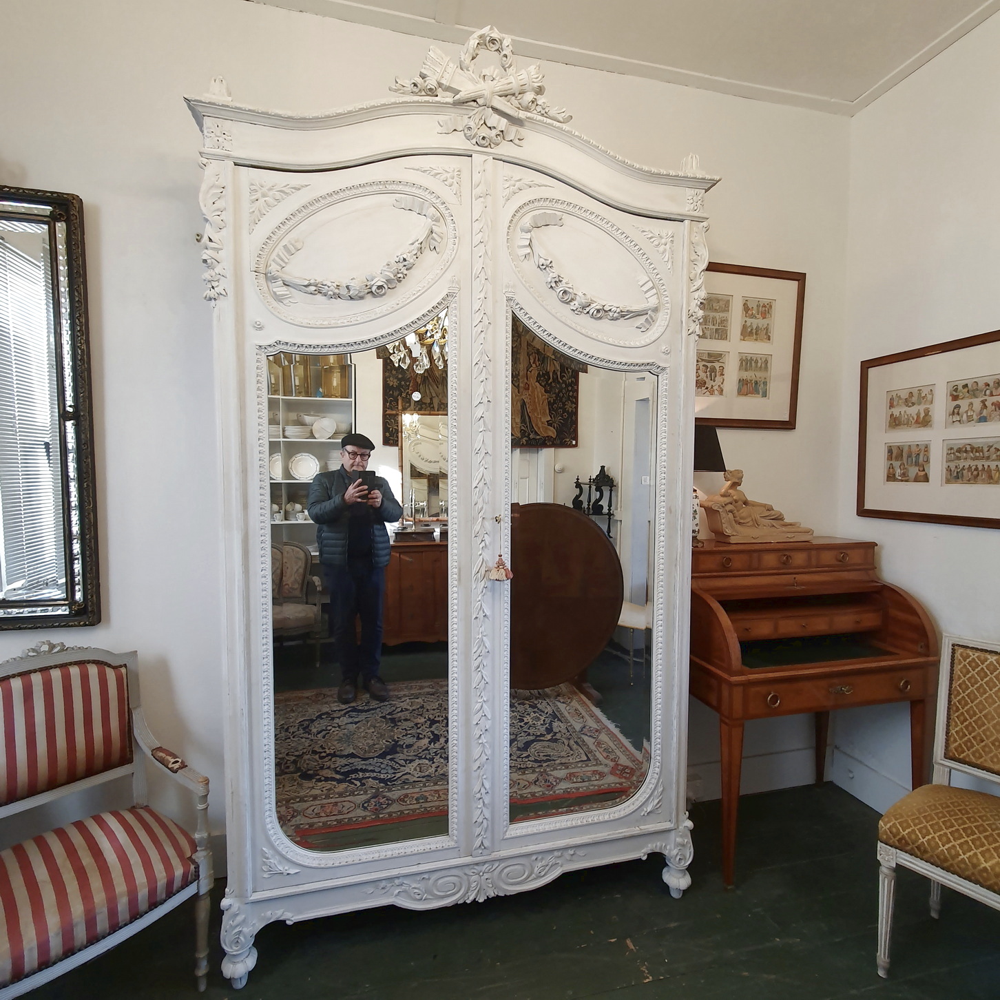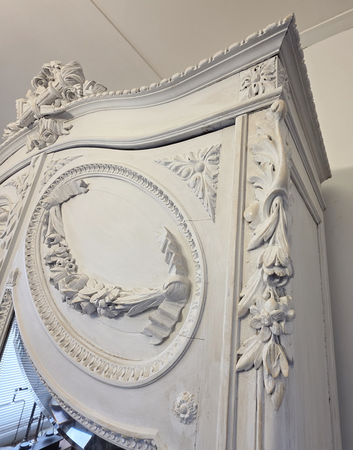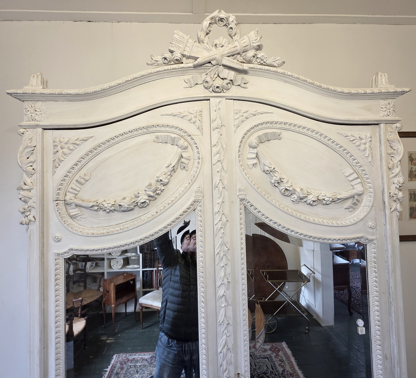 A 19th century French Louis XVI style Armoire decorated with haut-relief carved oval medallions and with carved Neoclassical elements including paterae, gadrooned mouldings, acanthus leaf garlands, and festooned with trellises of flowers and with knotted ribbons. The doors retain their original, shaped and bevelled mirrors. The elegantly curved 'Chapeau de Gendarme' pediment is fitted with finials and is decorated with a central crest displaying a quiver of arrows crossed with a flaming torch. These are Louis XVI allegories for a 'piercing intelligence' and for a 'burning passion'): the well-wishes for a successful home. The solid oak interiors retain the original, adjustable-height oak shelves, one of which is fitted with a suspended hanging-bar and another shelf is fitted with two lockable drawers. Area of Paris, circa 1880.