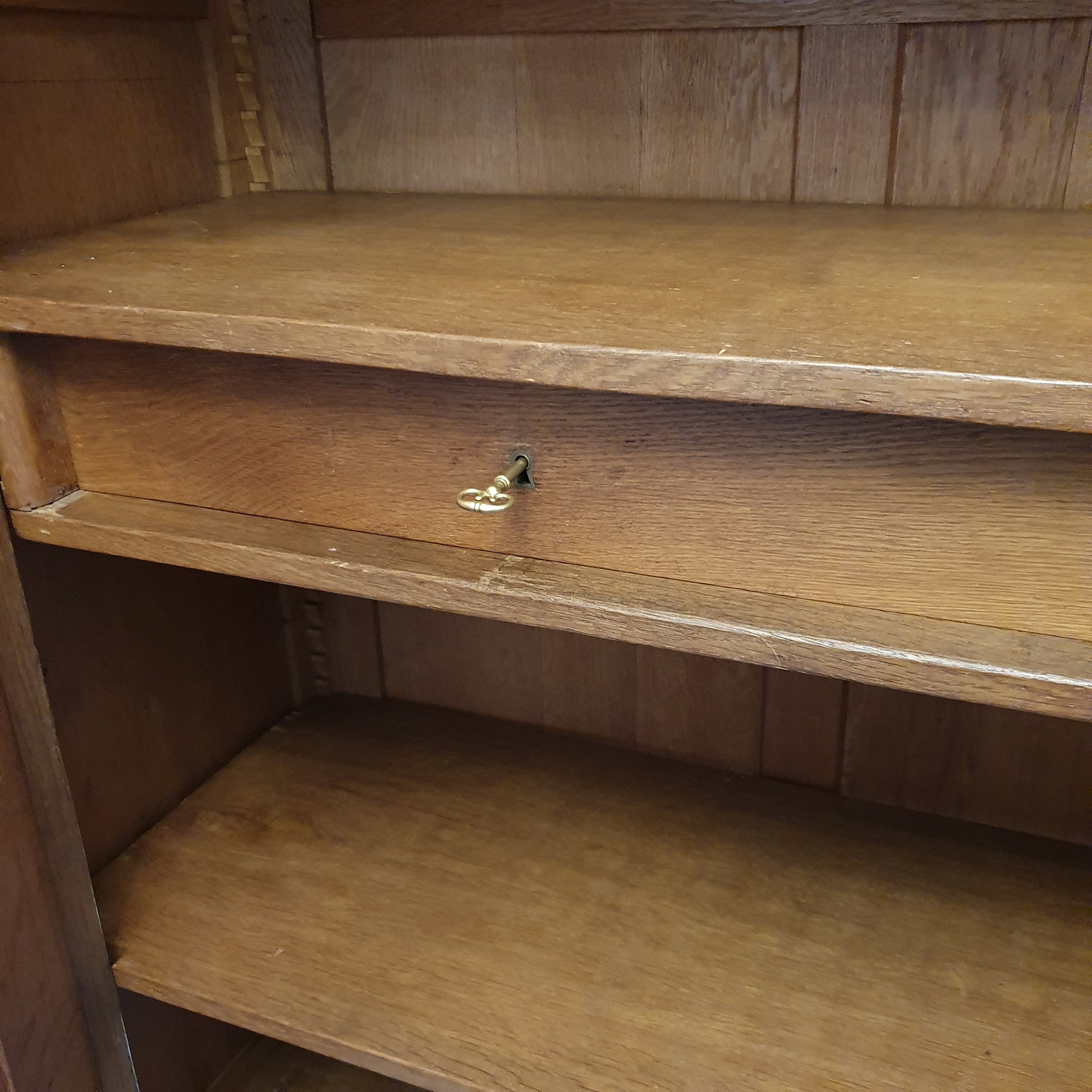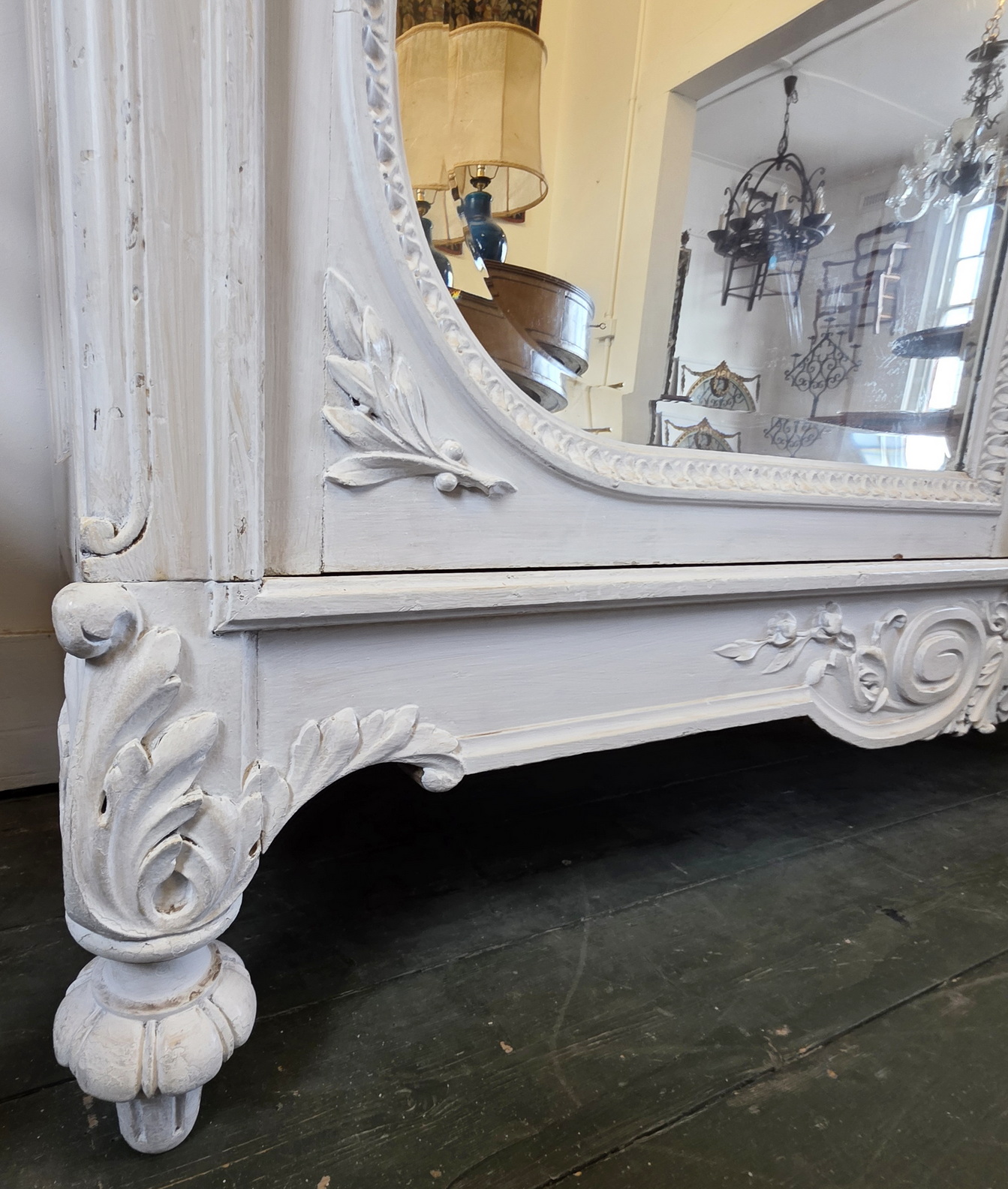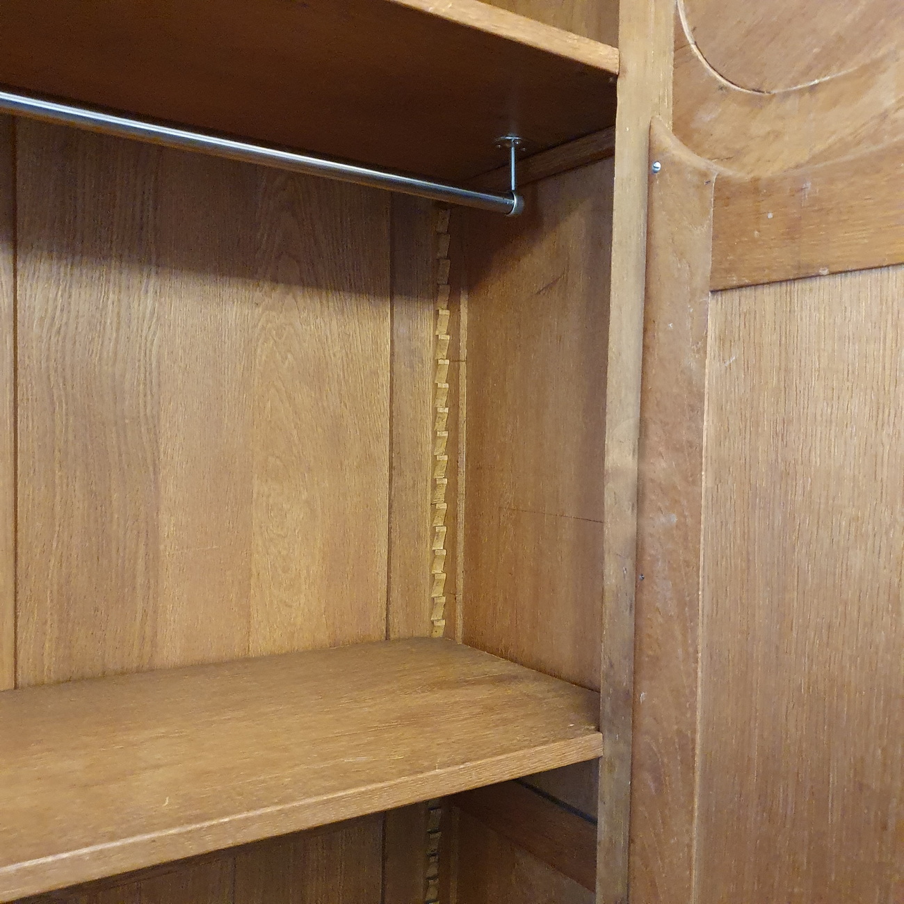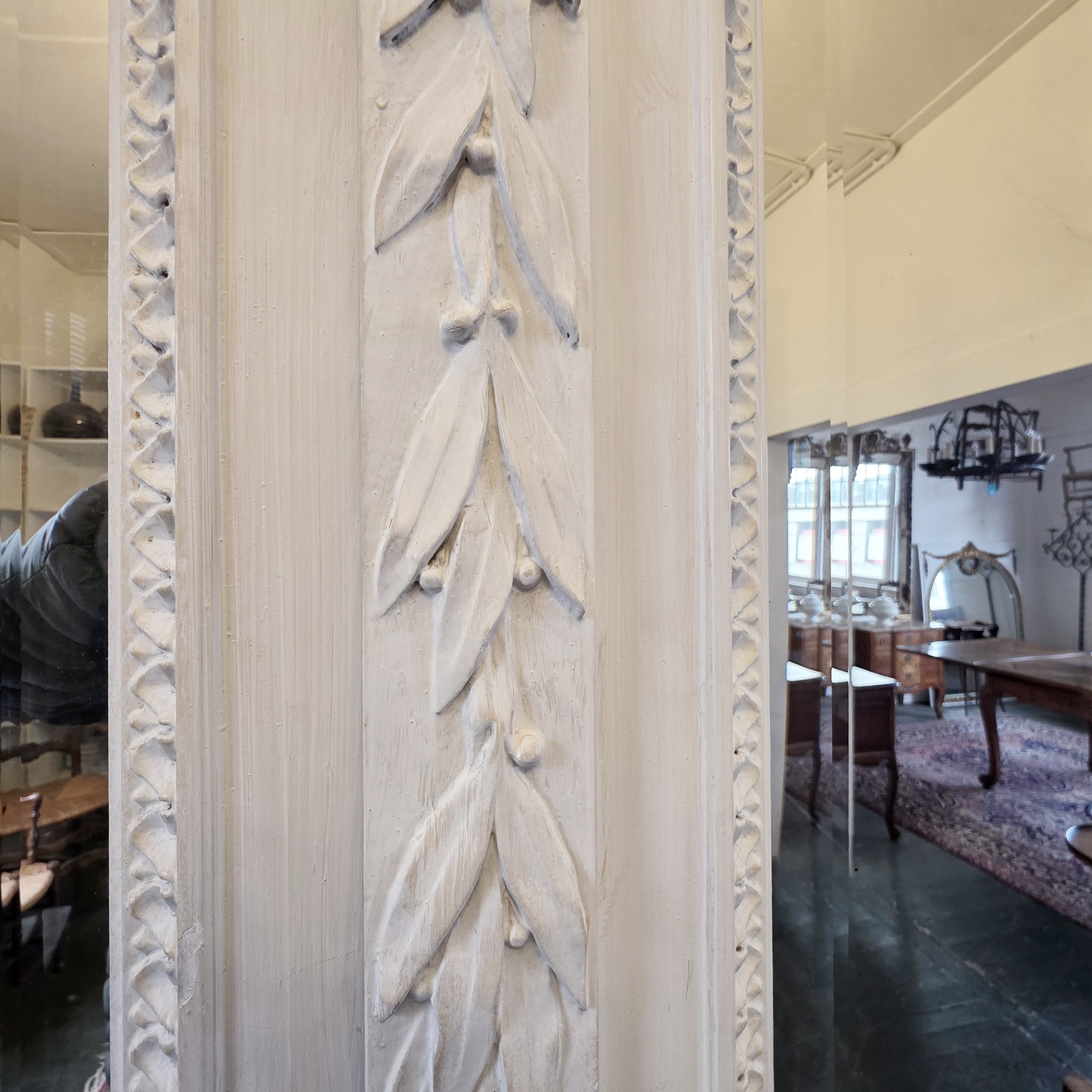 A 19th century French Louis XVI style Armoire decorated with haut-relief carved oval medallions and with carved Neoclassical elements including paterae, gadrooned mouldings, acanthus leaf garlands, and festooned with trellises of flowers and with knotted ribbons. The doors retain their original, shaped and bevelled mirrors. The elegantly curved 'Chapeau de Gendarme' pediment is fitted with finials and is decorated with a central crest displaying a quiver of arrows crossed with a flaming torch. These are Louis XVI allegories for a 'piercing intelligence' and for a 'burning passion'): the well-wishes for a successful home. The solid oak interiors retain the original, adjustable-height oak shelves, one of which is fitted with a suspended hanging-bar and another shelf is fitted with two lockable drawers. Area of Paris, circa 1880.