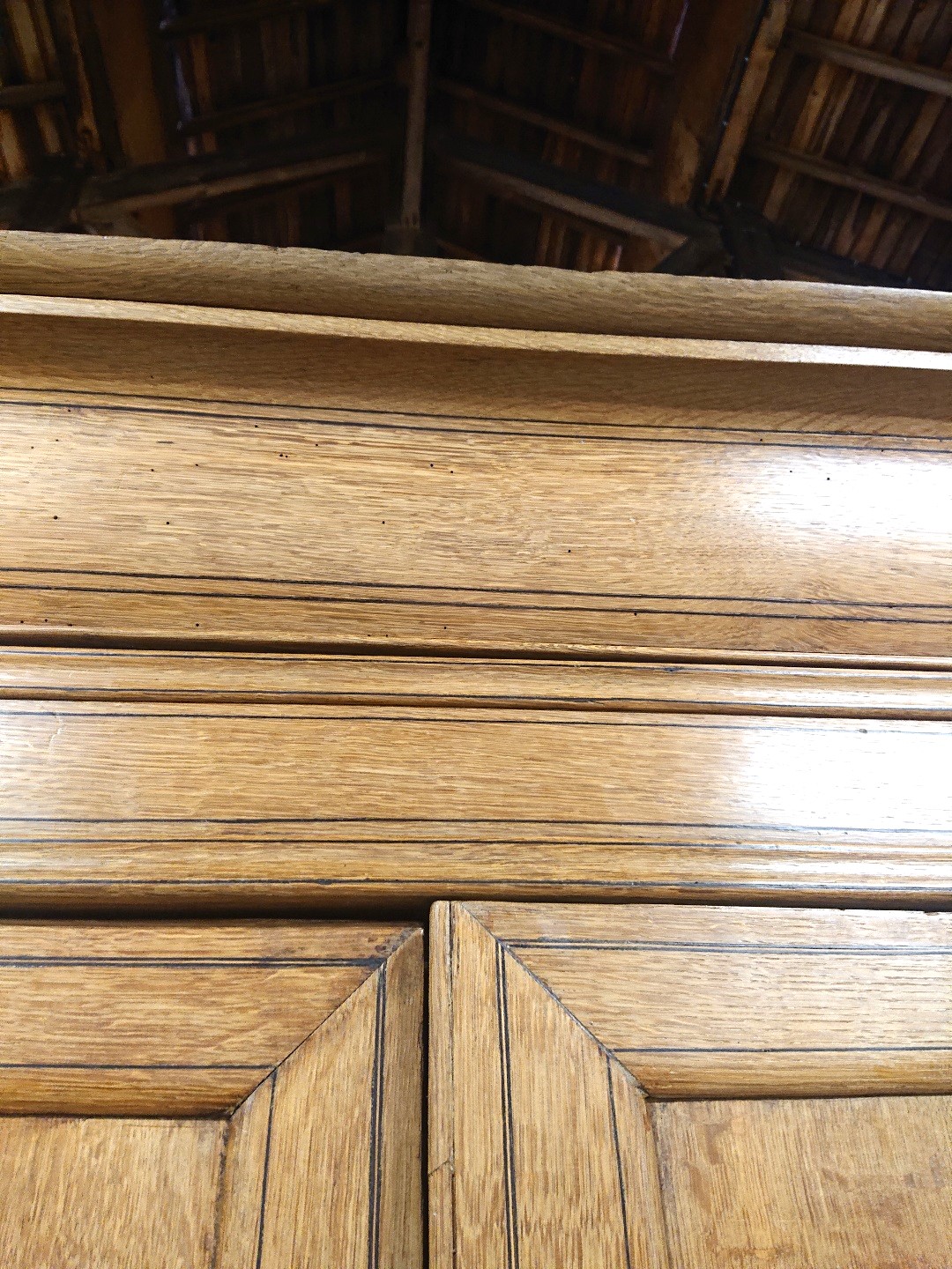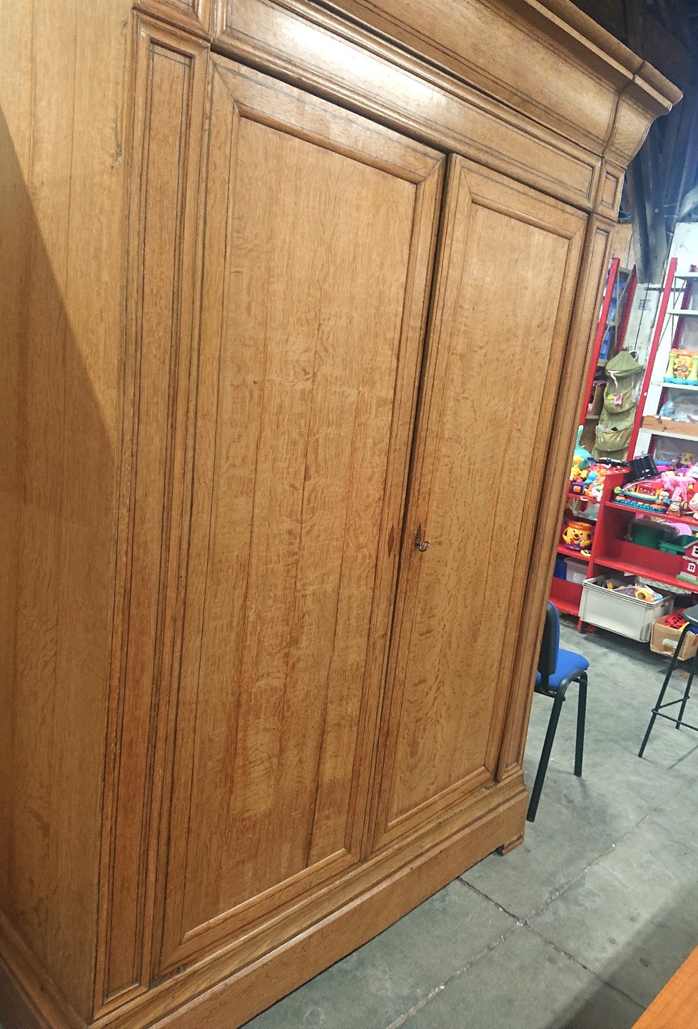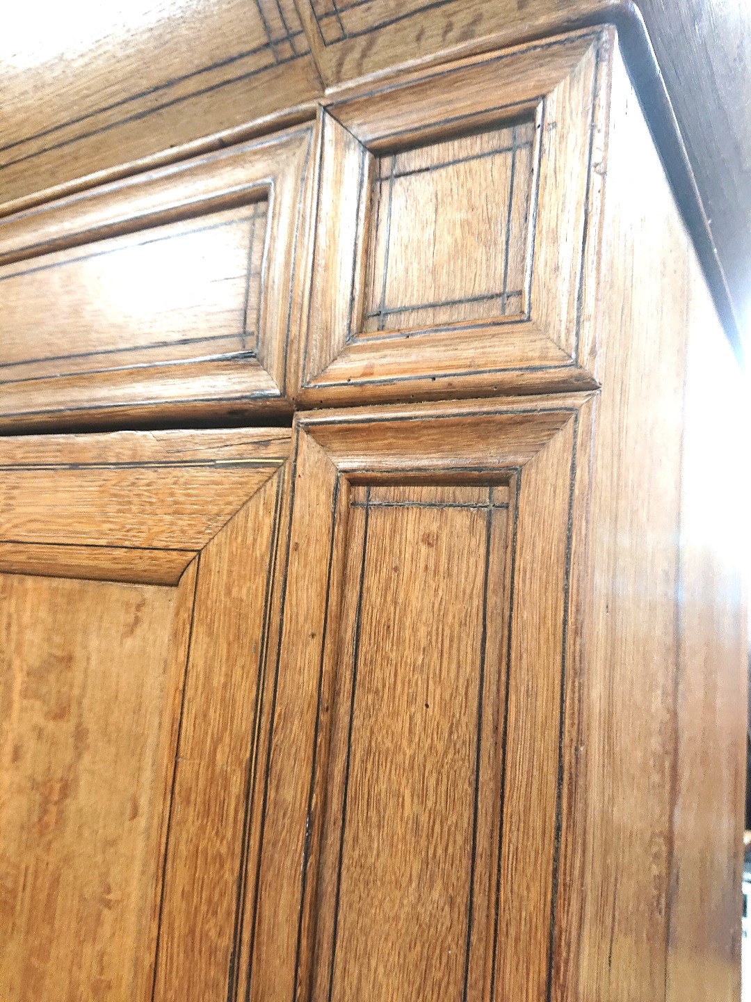 A large, fine and elegant, early 19th century French Charles X period, solid oak Armoire of wonderfully simple and Classical proportions, the blond oak facade decorated with finely inlaid ebony stringing and with ebony escutcheons. Internally fitted with shelves, and retaining its original luminous patination. Please note the design, which is a simplified follow-on from the previous Napoleonic Empire style, and is a precursor of the later German Biedermeier style. Area of Paris, circa 1820.