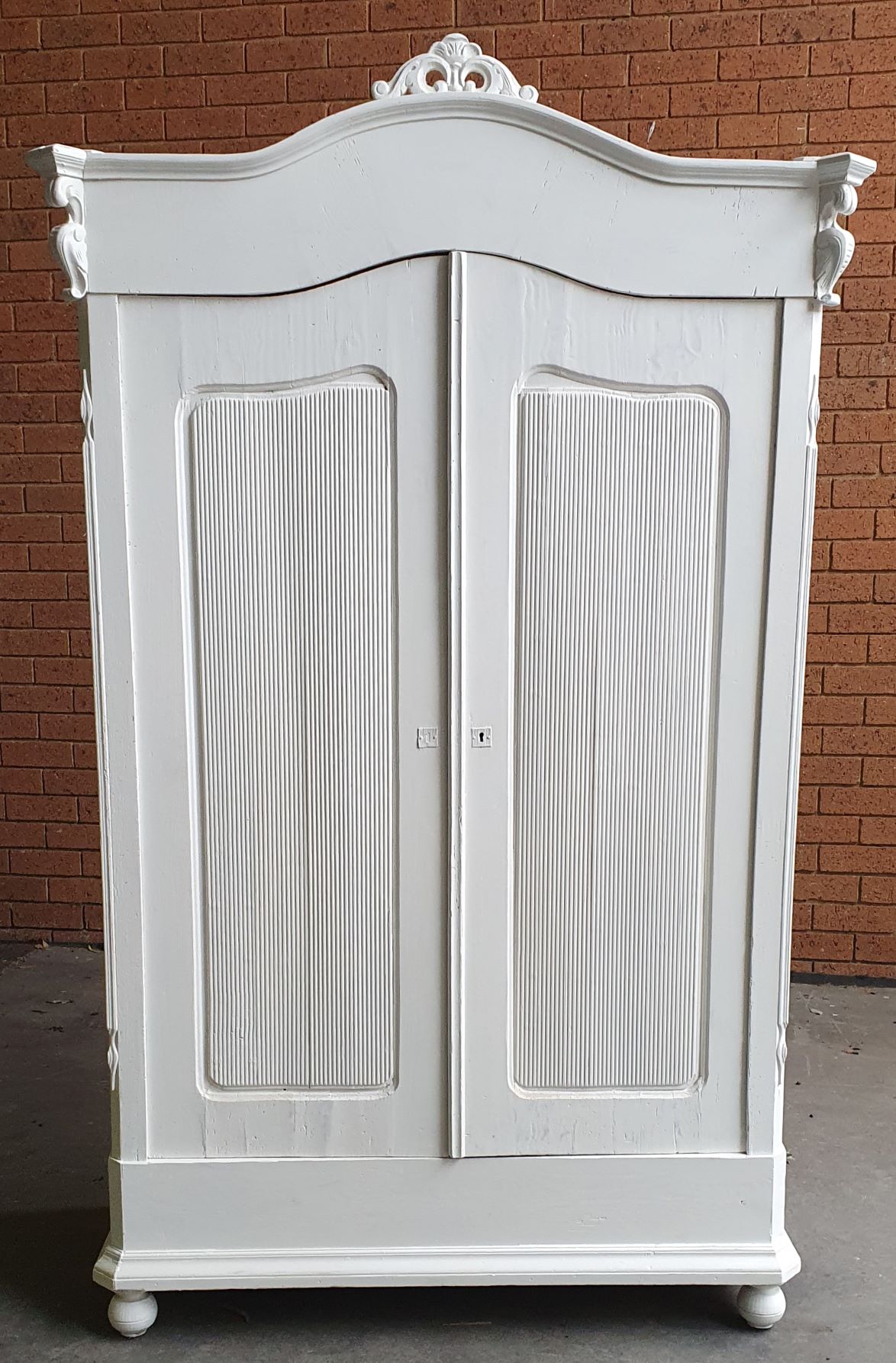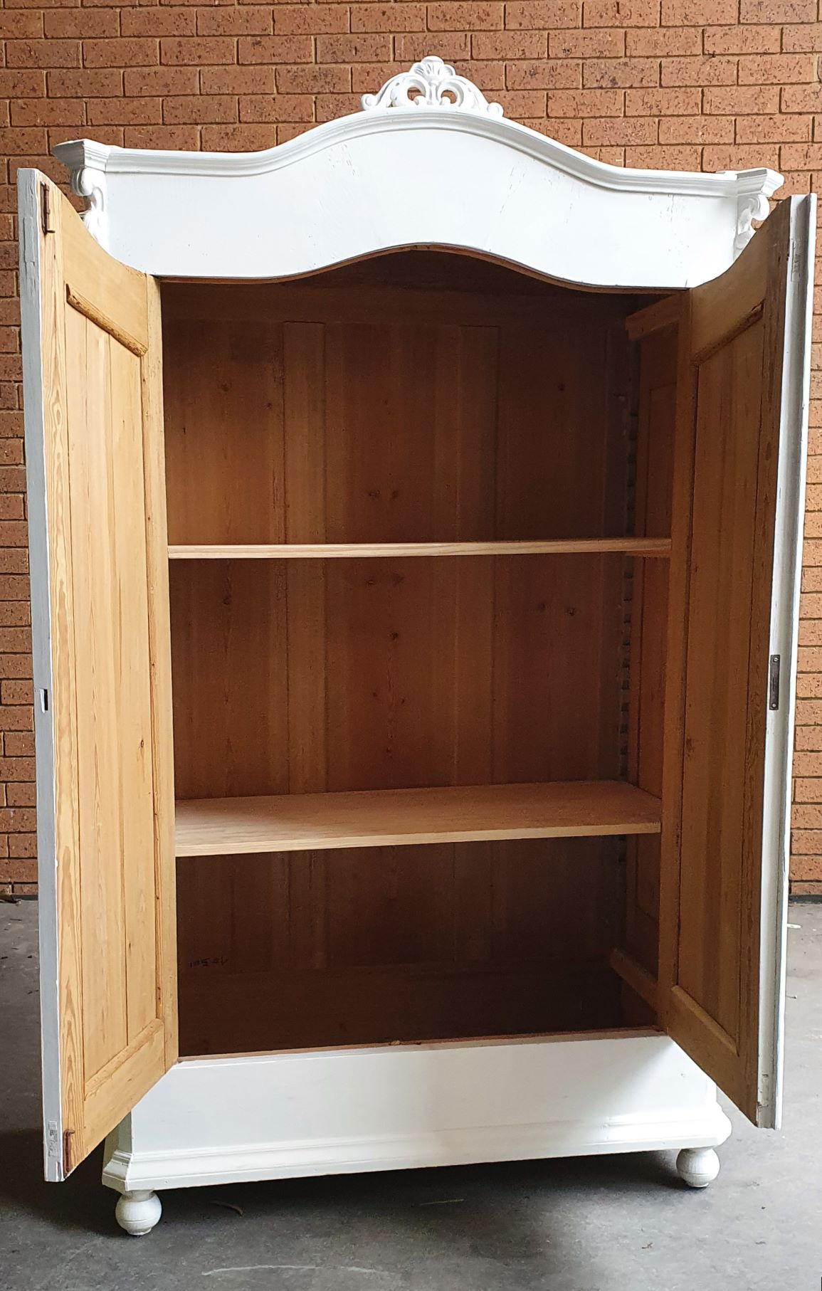 A 19th century French Louis XV style painted pine Armoire, the two doors opening fully, to reveal adjustable height shelves internally. Please note the smaller proportions of this Armoire and the wonderful "Chapeau de Gendarme" pediment. This Armoire is of a size ideal for a child's bedroom. Area of Eastern France, circa 1880.
