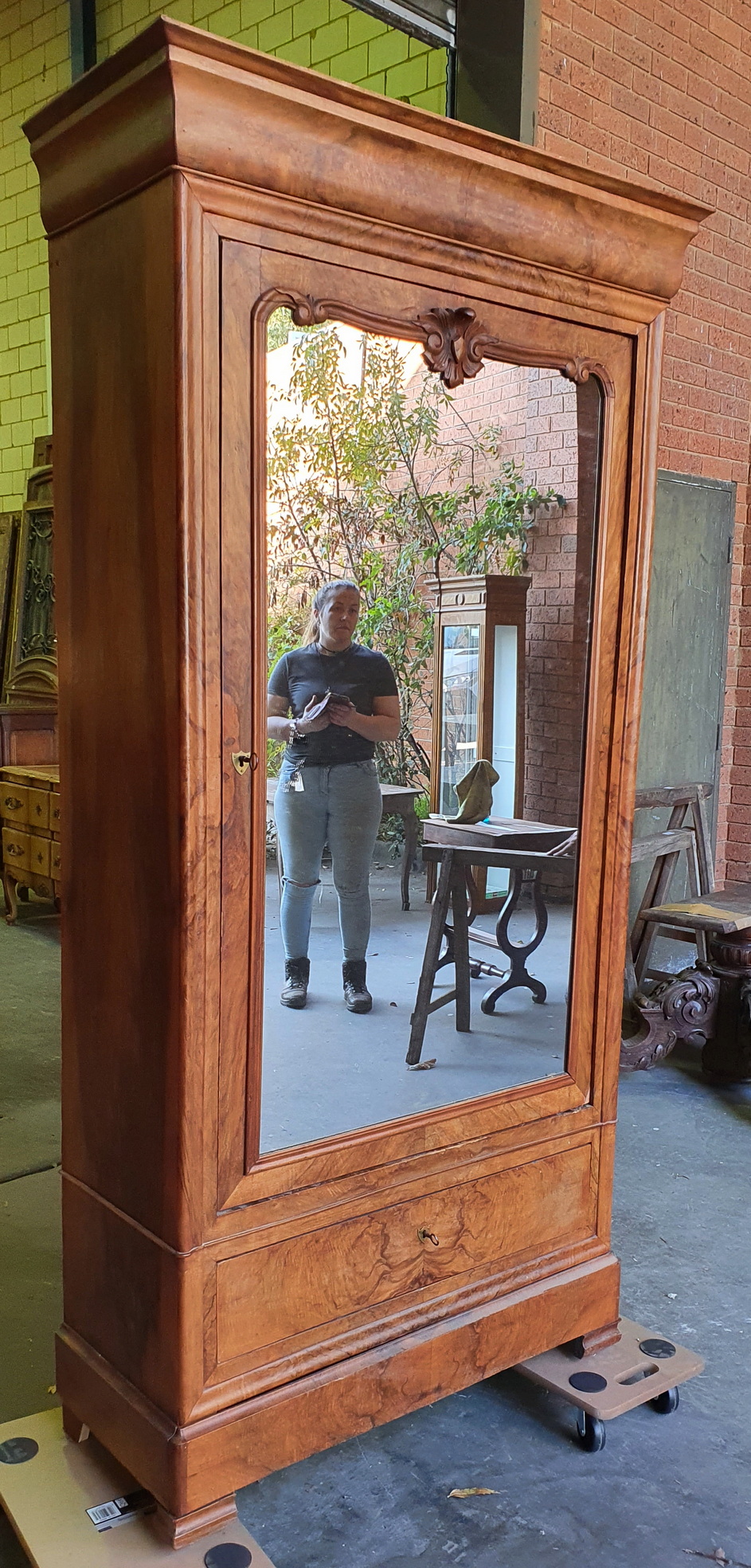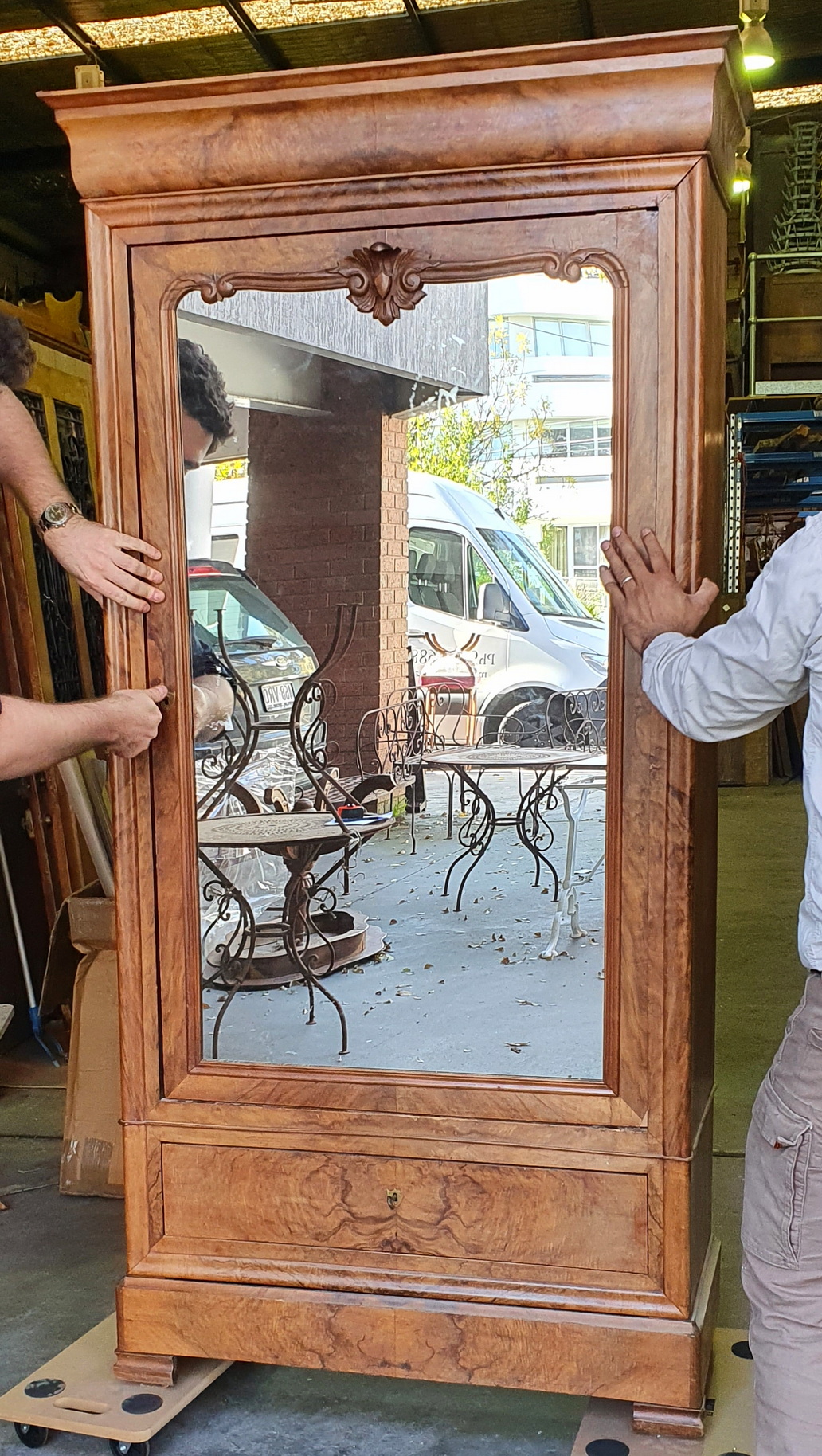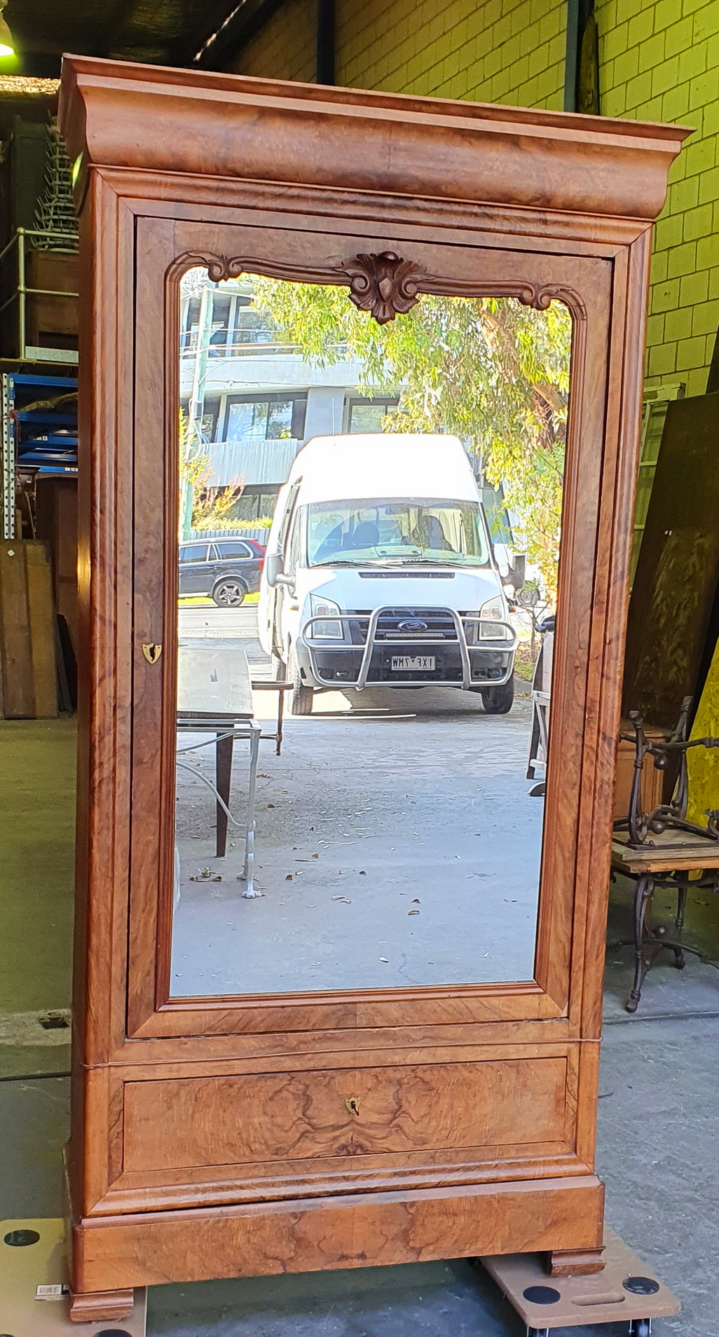 A mid 19th century French Napoleon III period bookmatched figured walnut single-door Armoire wardrobe retaining its original mirror plate inset into the door. Two drawers are fitted into the front, one of them a secret drawer hidden in the plinth. Internally, this petite armoire is fitted with (later) shelves, which are adjustable in height. Area of Paris, circa 1870