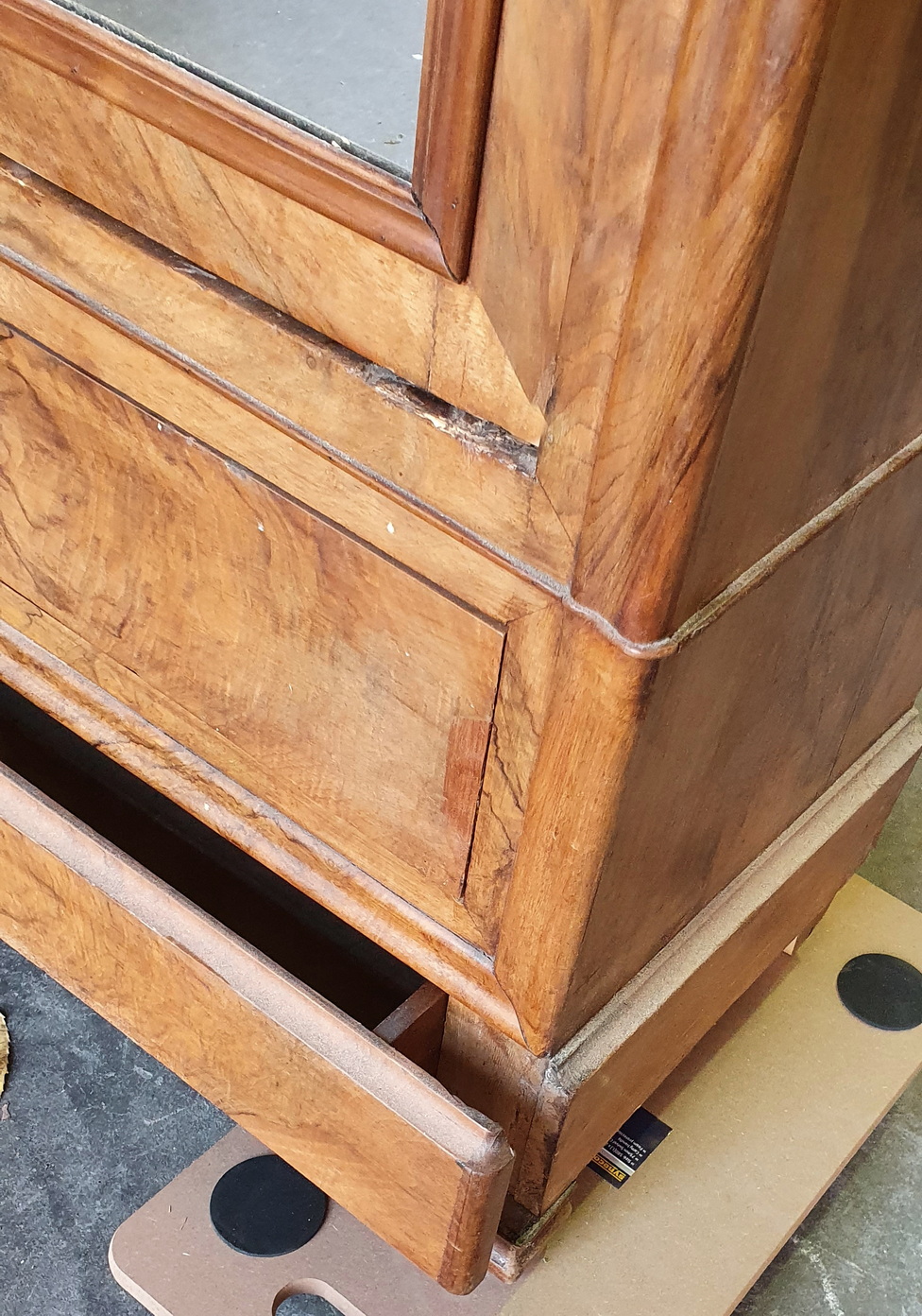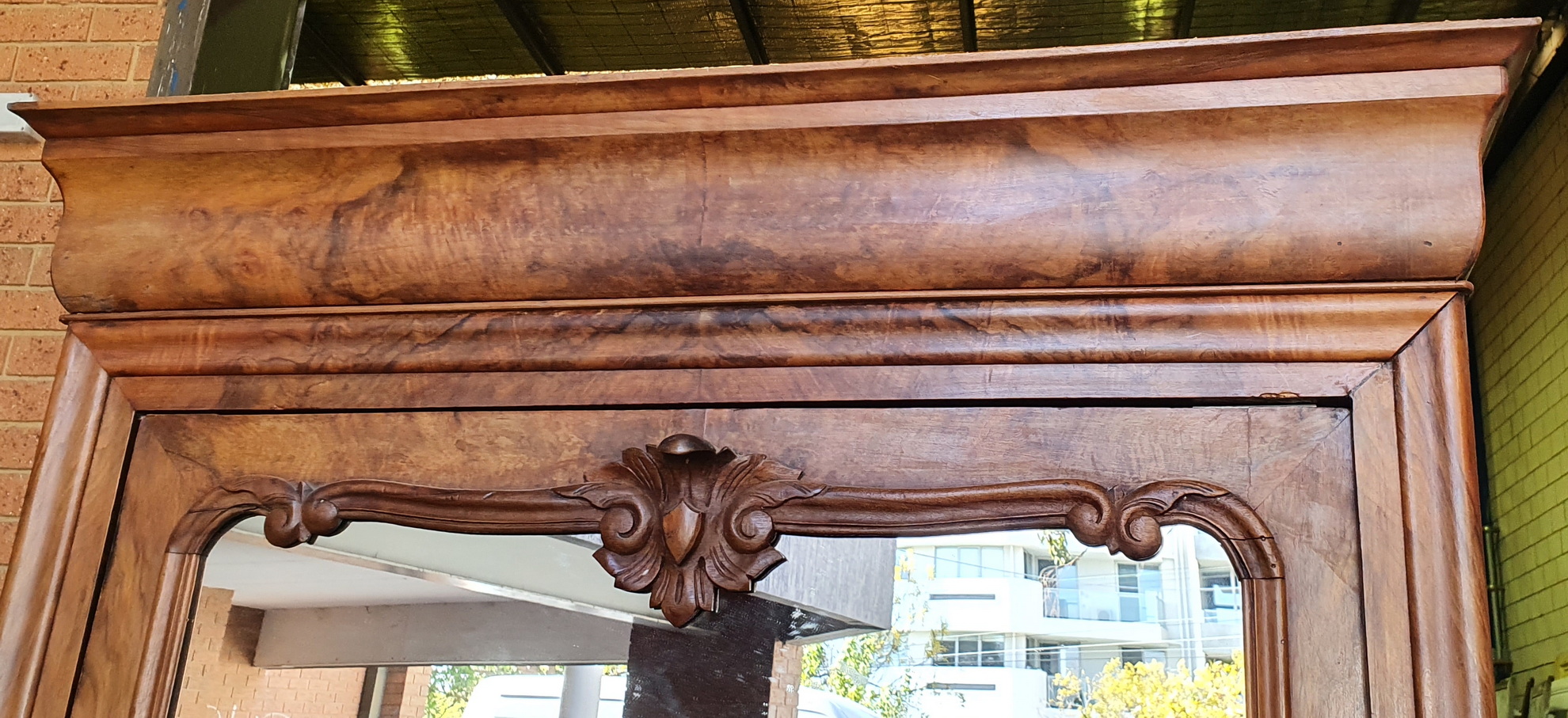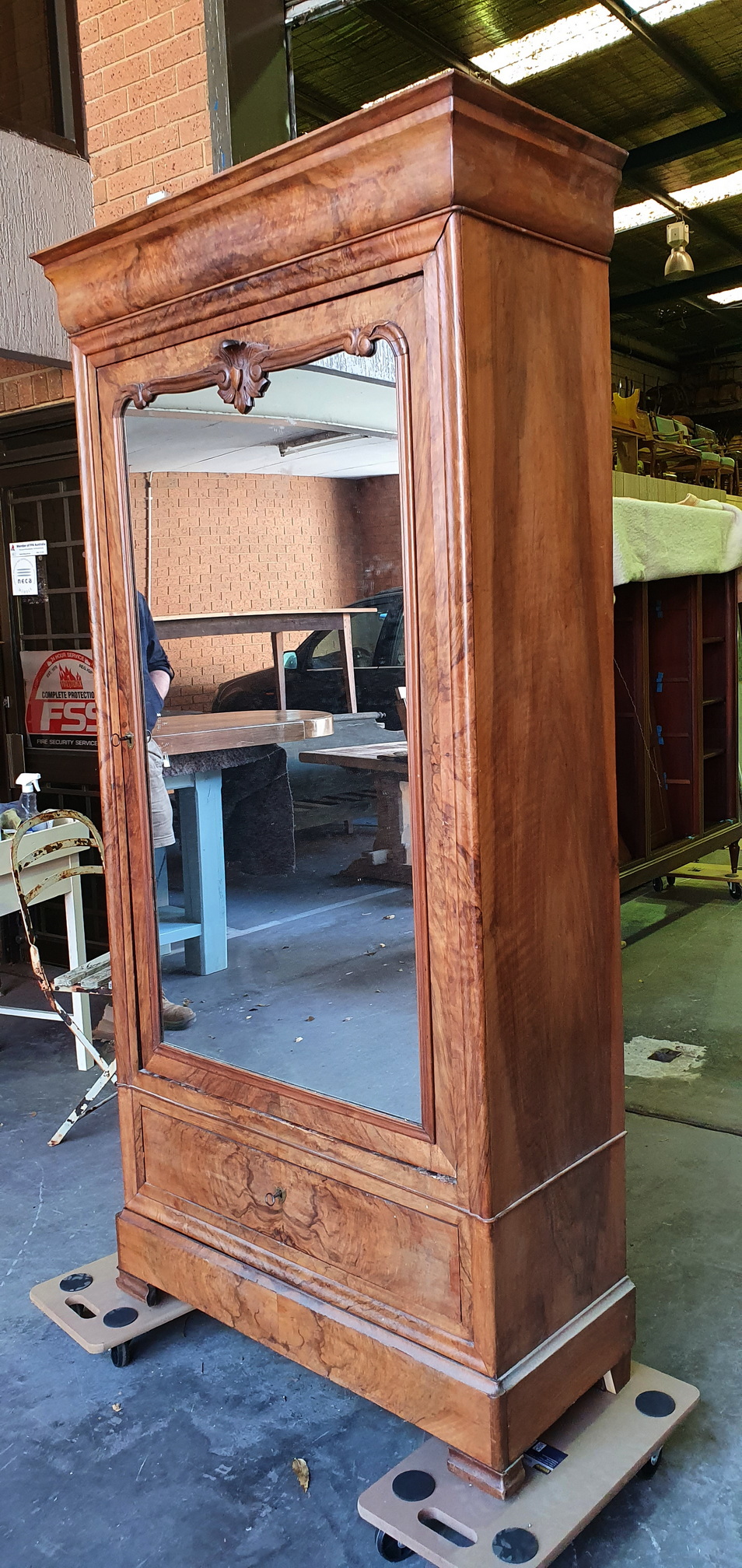 A mid 19th century French Napoleon III period bookmatched figured walnut single-door Armoire wardrobe retaining its original mirror plate inset into the door. Two drawers are fitted into the front, one of them a secret drawer hidden in the plinth. Internally, this petite armoire is fitted with (later) shelves, which are adjustable in height. Area of Paris, circa 1870