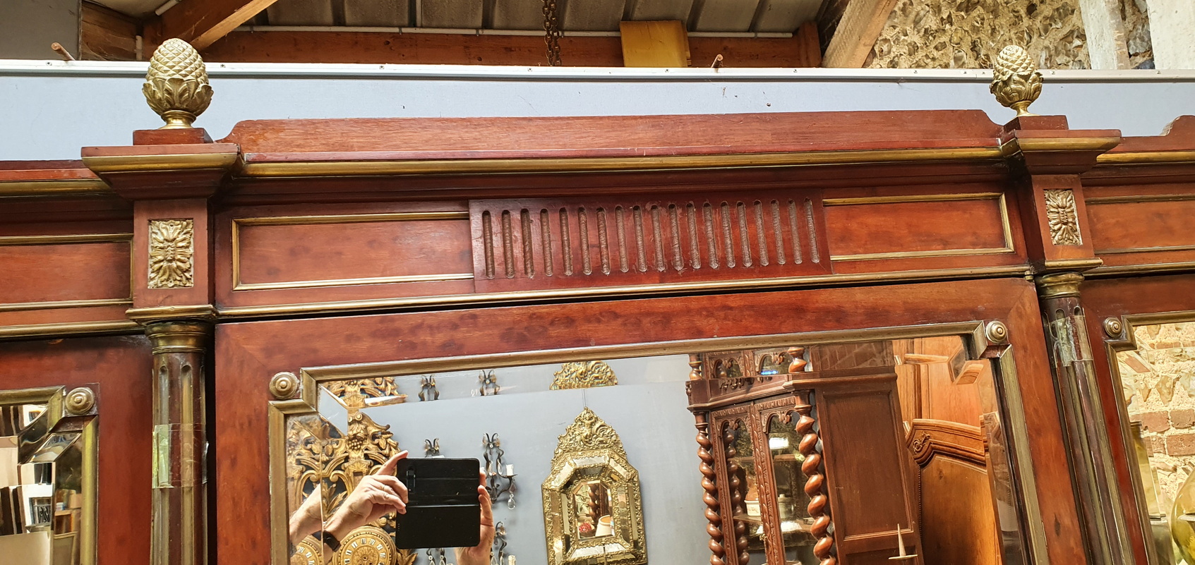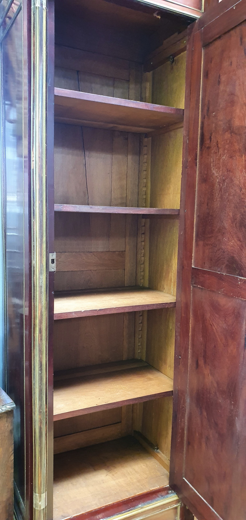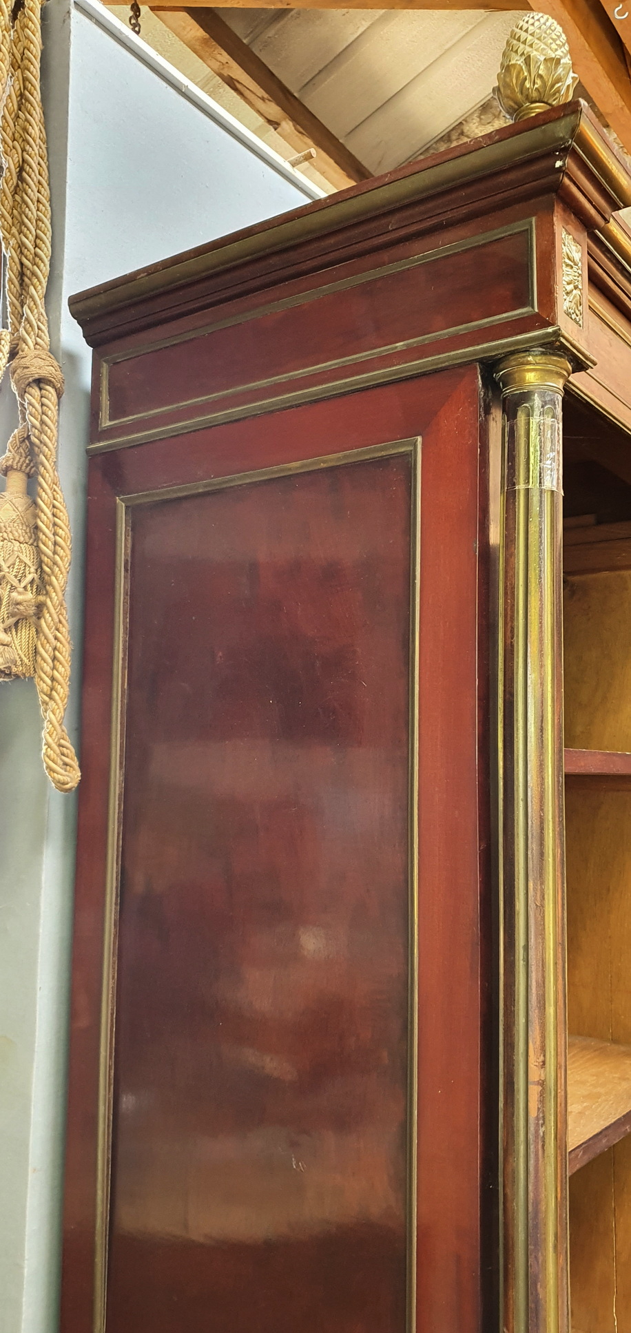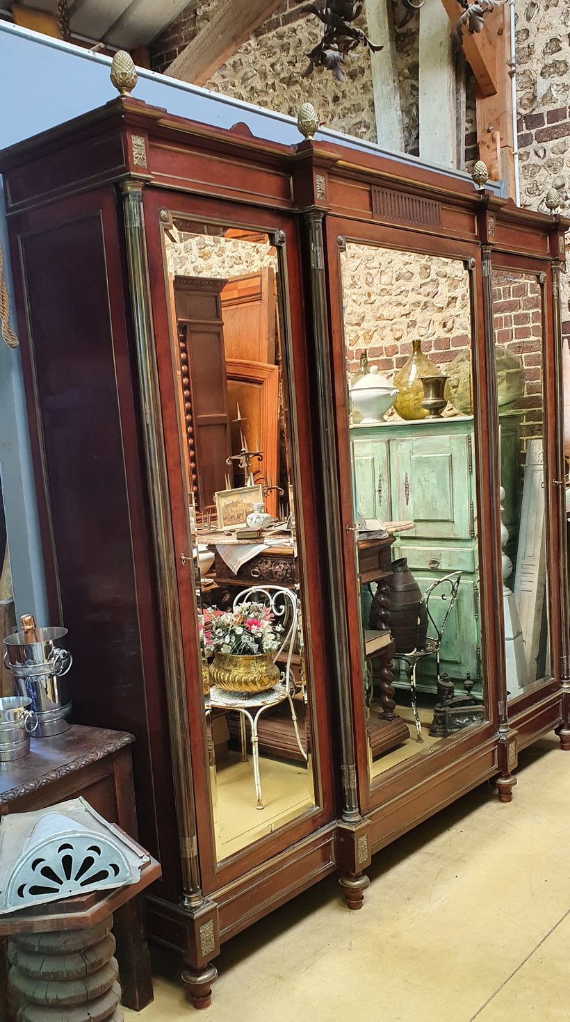A large and very fine 19th century French Napoleon III period, Louis XVI style, polished solid mahogany, plum-pudding mahogany and gilt brass-mounted Armoire, the stepped-front with three shaped doors fitted with the original hand-bevelled mirrors. Decorated with fire-gilt brass mouldings, capitols, plinths, corner paterae and with elegant pine cone finials. The pilasters' fluting is also lined with gilt brass. Please note the extraordinary quality of the finishes and of the way the finely gilt mouldings and mounts offset the mahogany. Internally fitted with the original adjustable-height shelves and drawers. Area of Paris, circa 1870.
