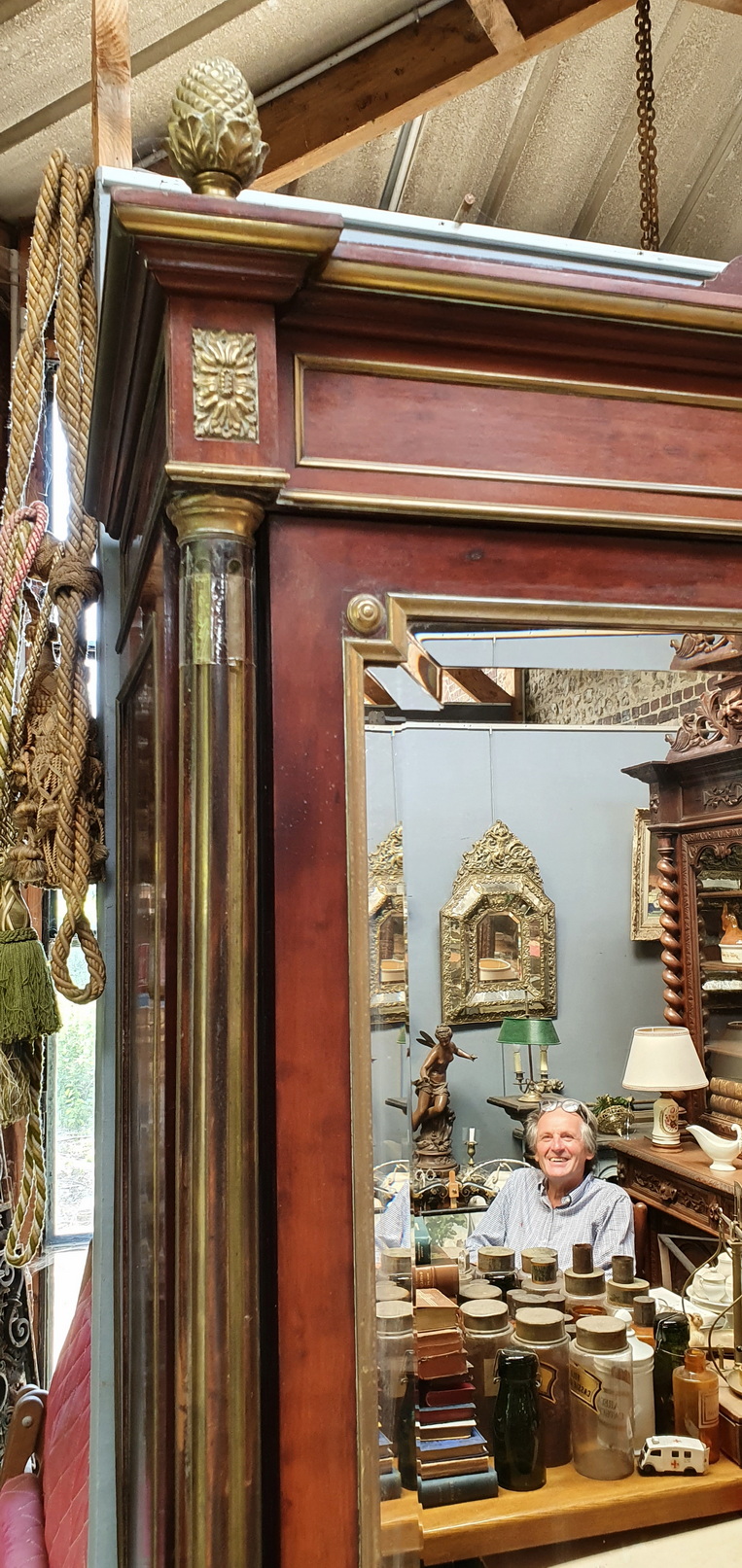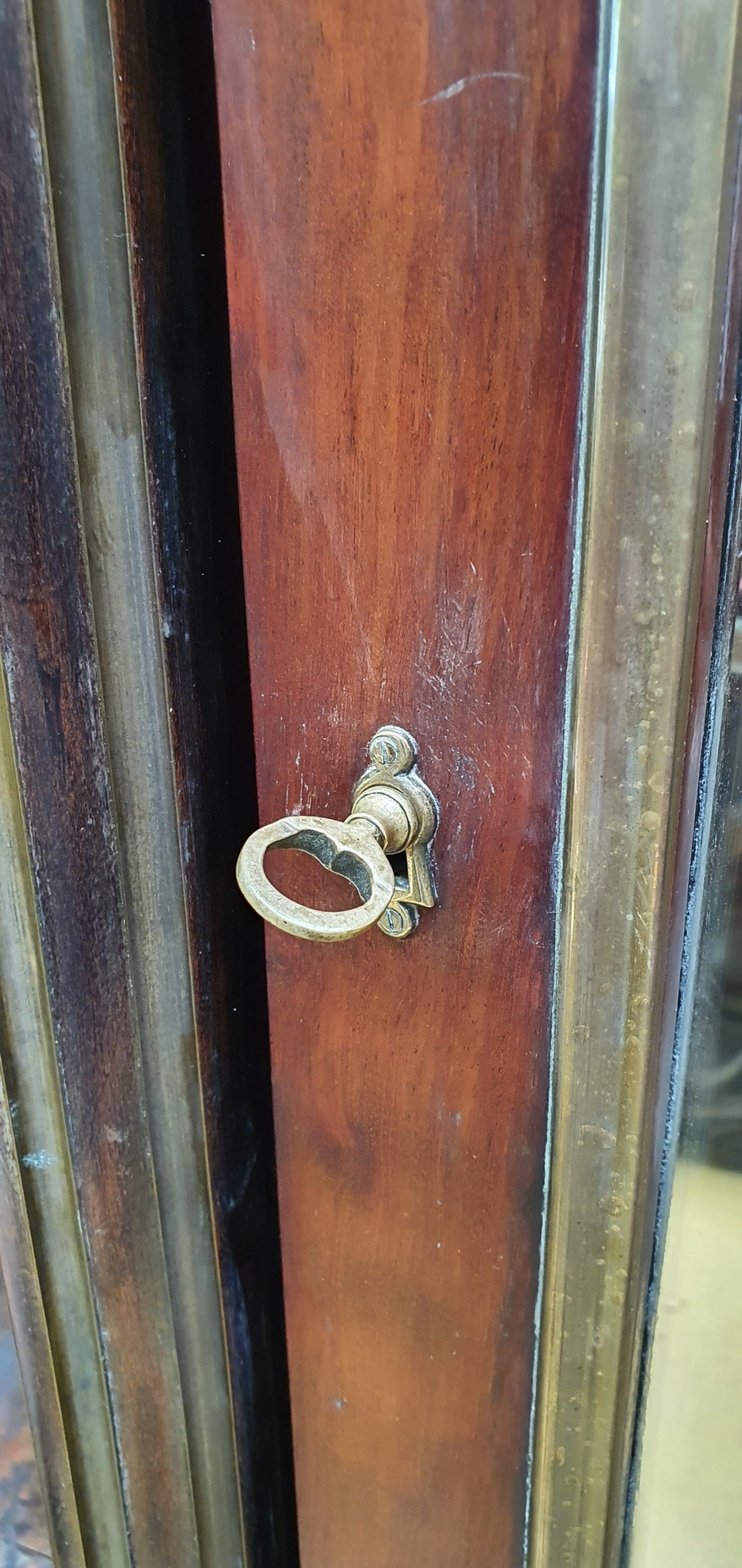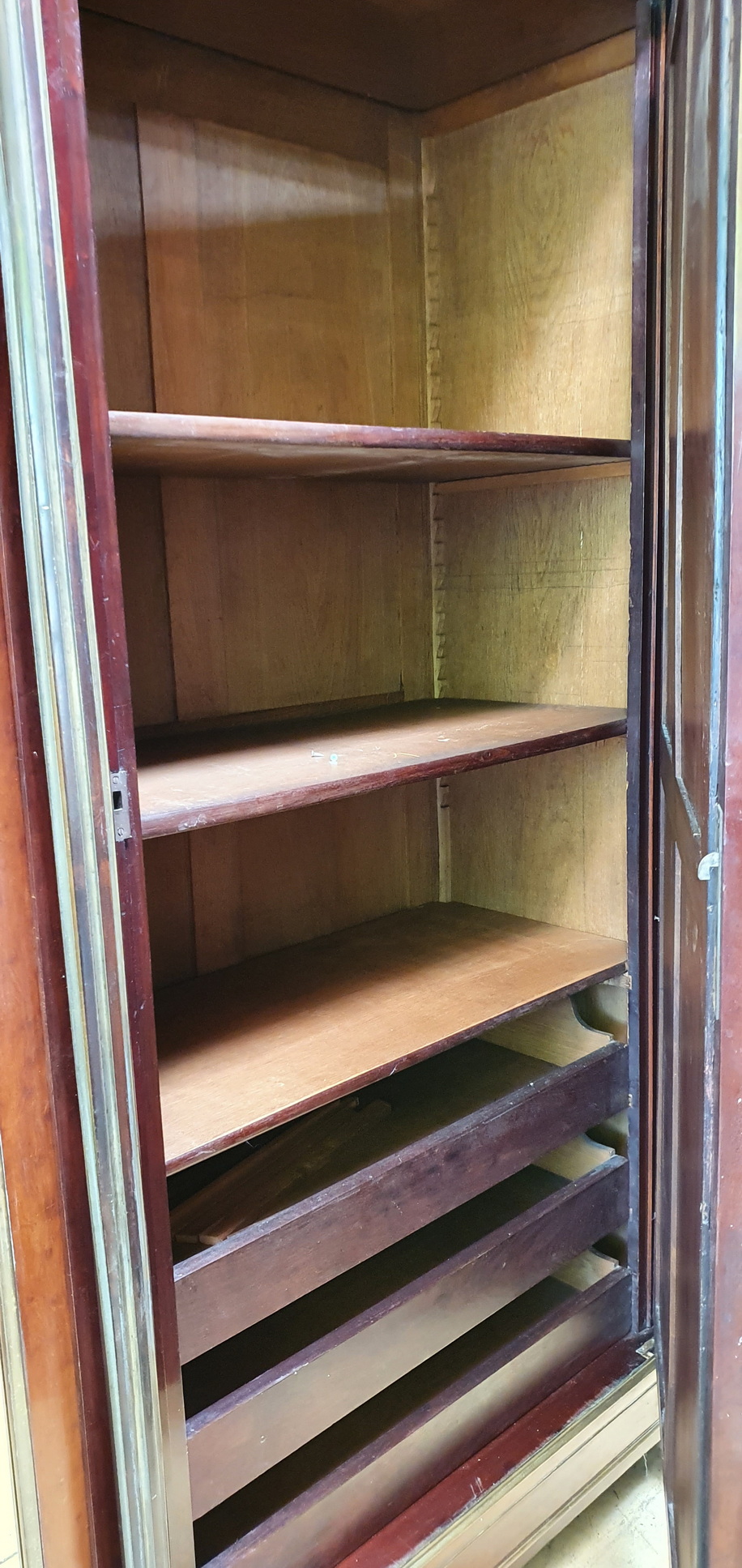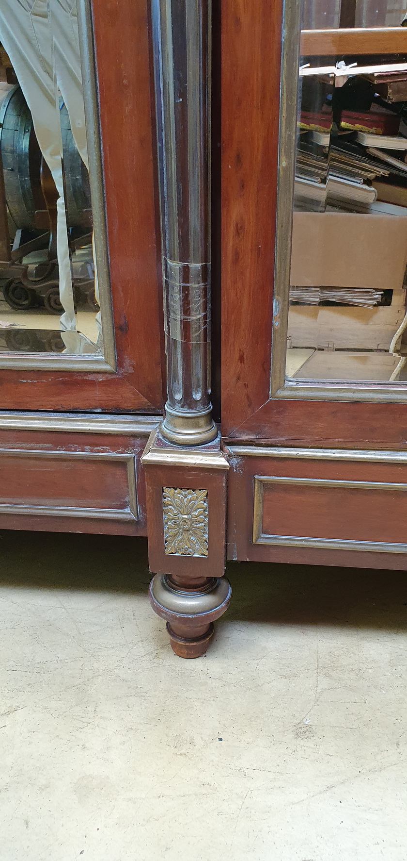 A large and very fine 19th century French Napoleon III period, Louis XVI style, polished solid mahogany, plum-pudding mahogany and gilt brass-mounted Armoire, the stepped-front with three shaped doors fitted with the original hand-bevelled mirrors. Decorated with fire-gilt brass mouldings, capitols, plinths, corner paterae and with elegant pine cone finials. The pilasters' fluting is also lined with gilt brass. Please note the extraordinary quality of the finishes and of the way the finely gilt mouldings and mounts offset the mahogany. Internally fitted with the original adjustable-height shelves and drawers. Area of Paris, circa 1870.