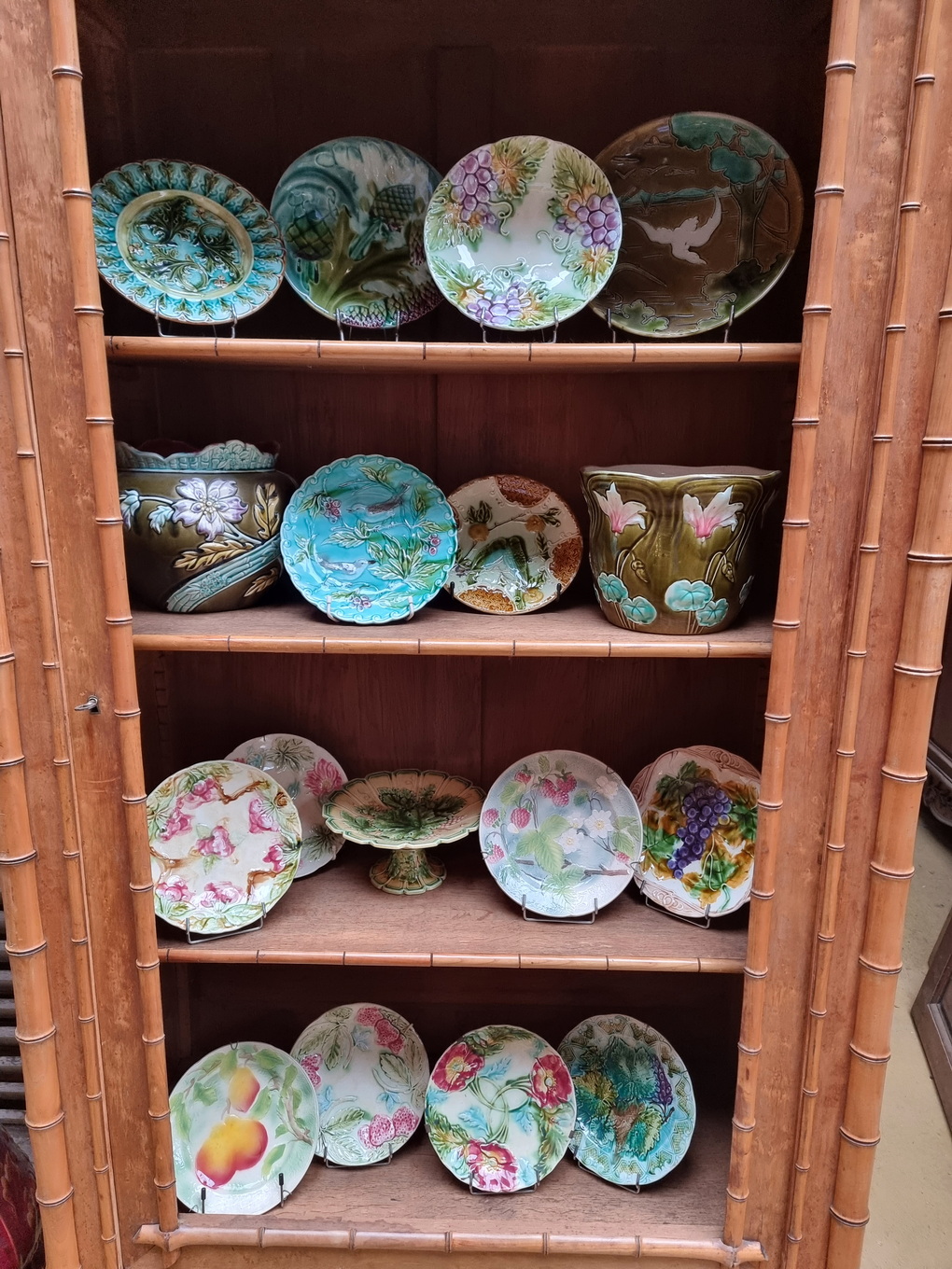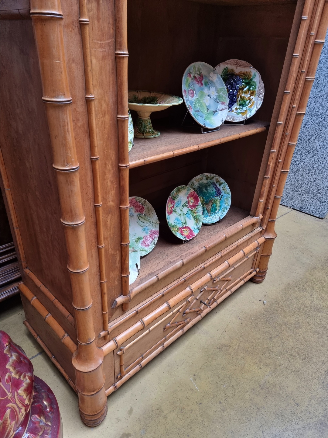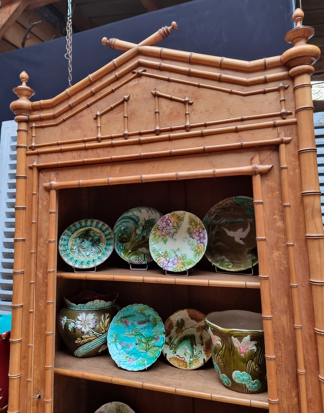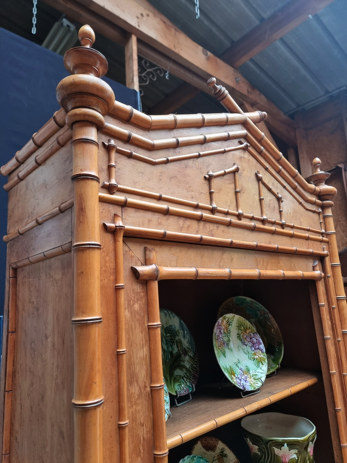 A 19th century French Napoleon III period single door birdseye maple Armoire decorated with turned and carved faux-bamboo motifs, the pediment retaining its turned finials. Internally fitted with the original, faux-bamboo lined adjustable-height shelves. Please note: the door of this Armoire is presently missing its mirror plate. It can be replaced with old or new mirror, or with clear glass for use as a display/bookcase. Area of Paris, circa 1870.