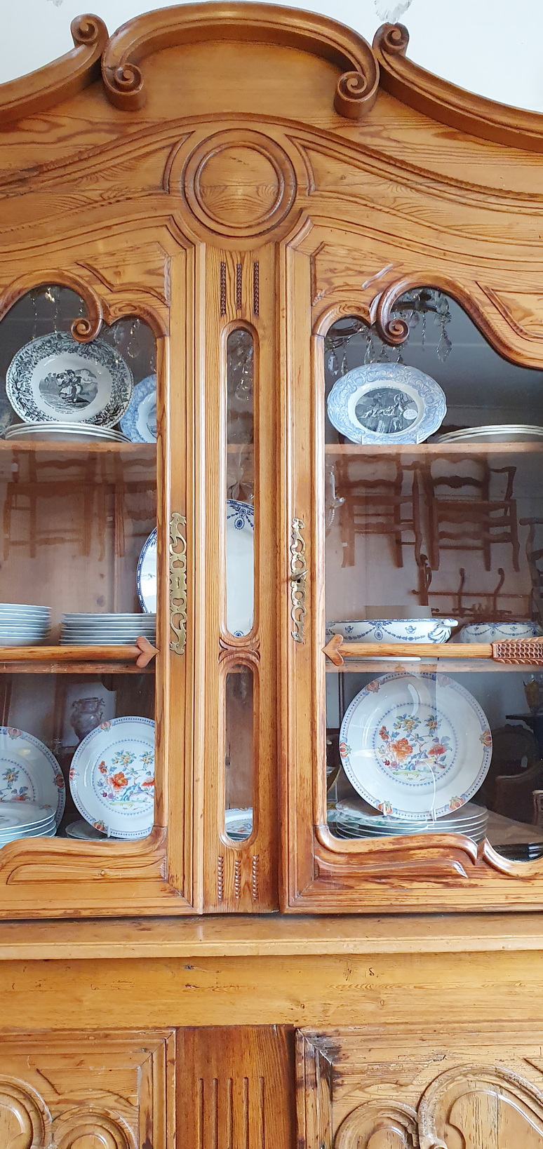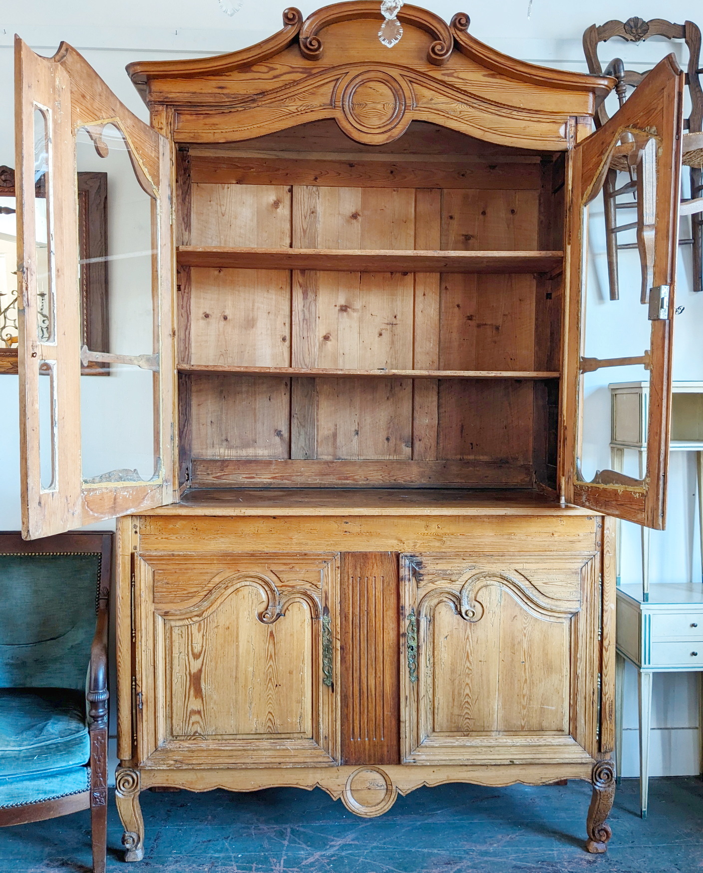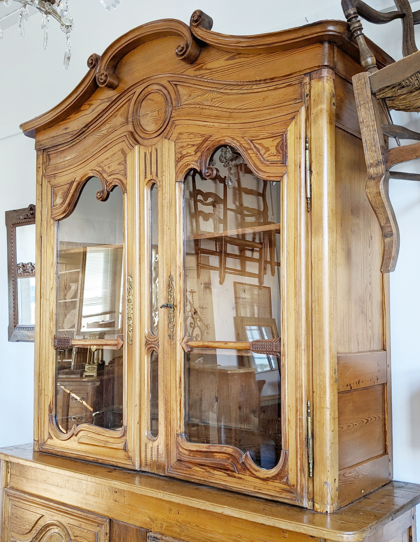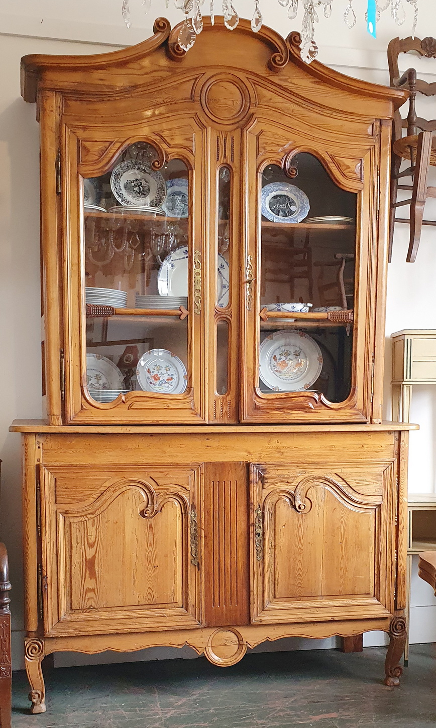 A 19th century French Napoleon III period, Louis XV style, solid pine "Buffet Vitré de Mariage", (a glazed marriage-buffet), originally given as a gift to a newly-wed couple and used in a home as a storage and display piece. The timbers are nicely-burnished and with the original patina, retaining the original internal shelving. Fitted with an elegant and large "Chapeau de Gendarme" pediment, the façade is decorated with haut relief scrollwork and circular mouldings typical of the French Pays de Caux region. Please note: this piece of furniture can also be used as a bookcase. Area of Pays de Caux (Upper Normandy), circa 1860.