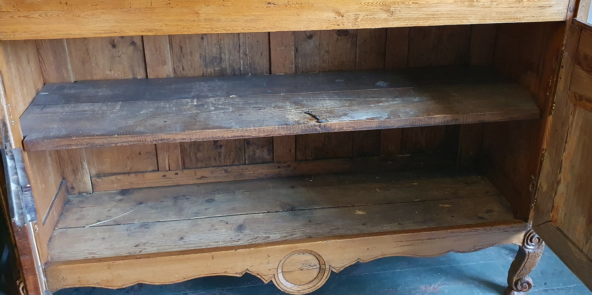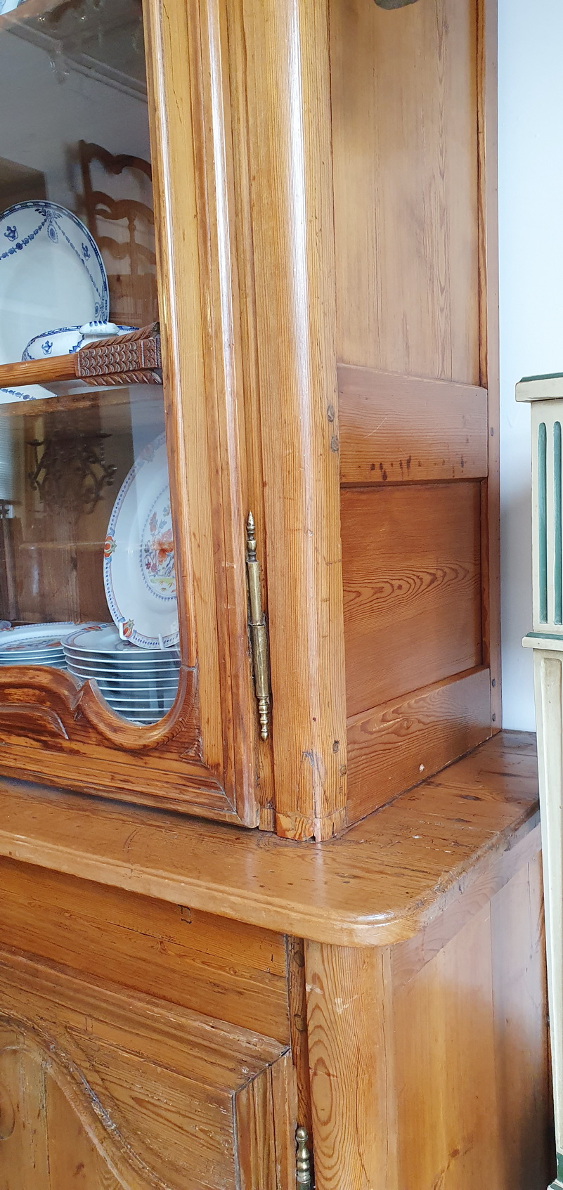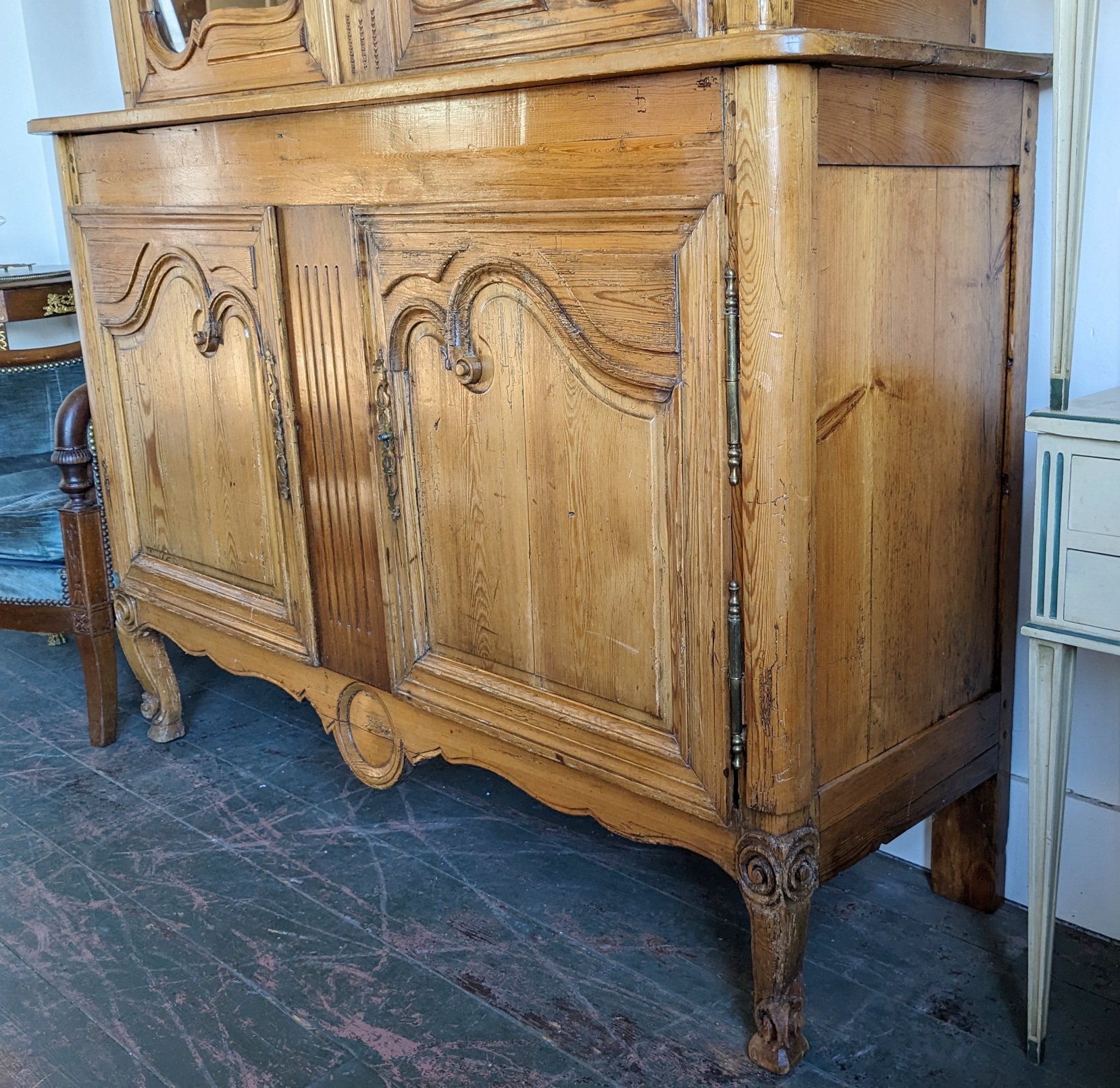 A 19th century French Napoleon III period, Louis XV style, solid pine "Buffet Vitré de Mariage", (a glazed marriage-buffet), originally given as a gift to a newly-wed couple and used in a home as a storage and display piece. The timbers are nicely-burnished and with the original patina, retaining the original internal shelving. Fitted with an elegant and large "Chapeau de Gendarme" pediment, the façade is decorated with haut relief scrollwork and circular mouldings typical of the French Pays de Caux region. Please note: this piece of furniture can also be used as a bookcase. Area of Pays de Caux (Upper Normandy), circa 1860.