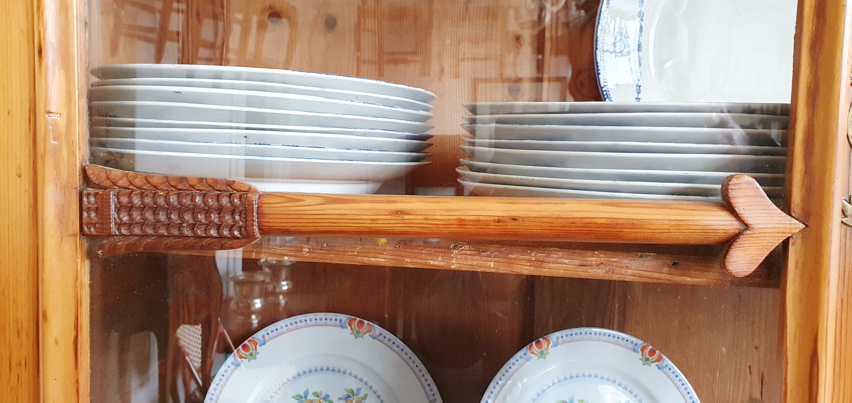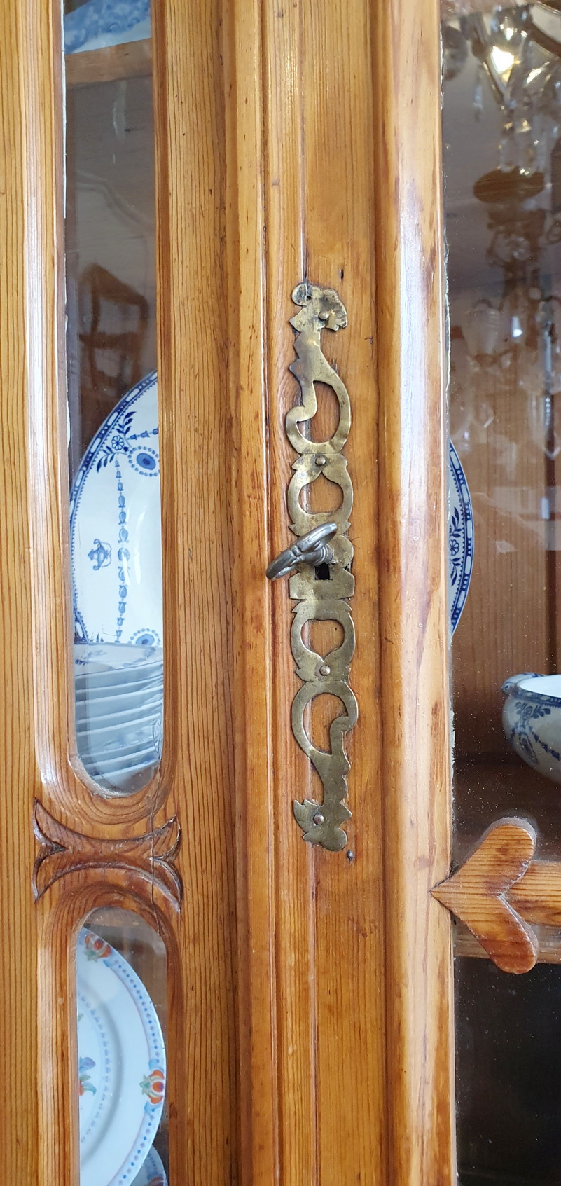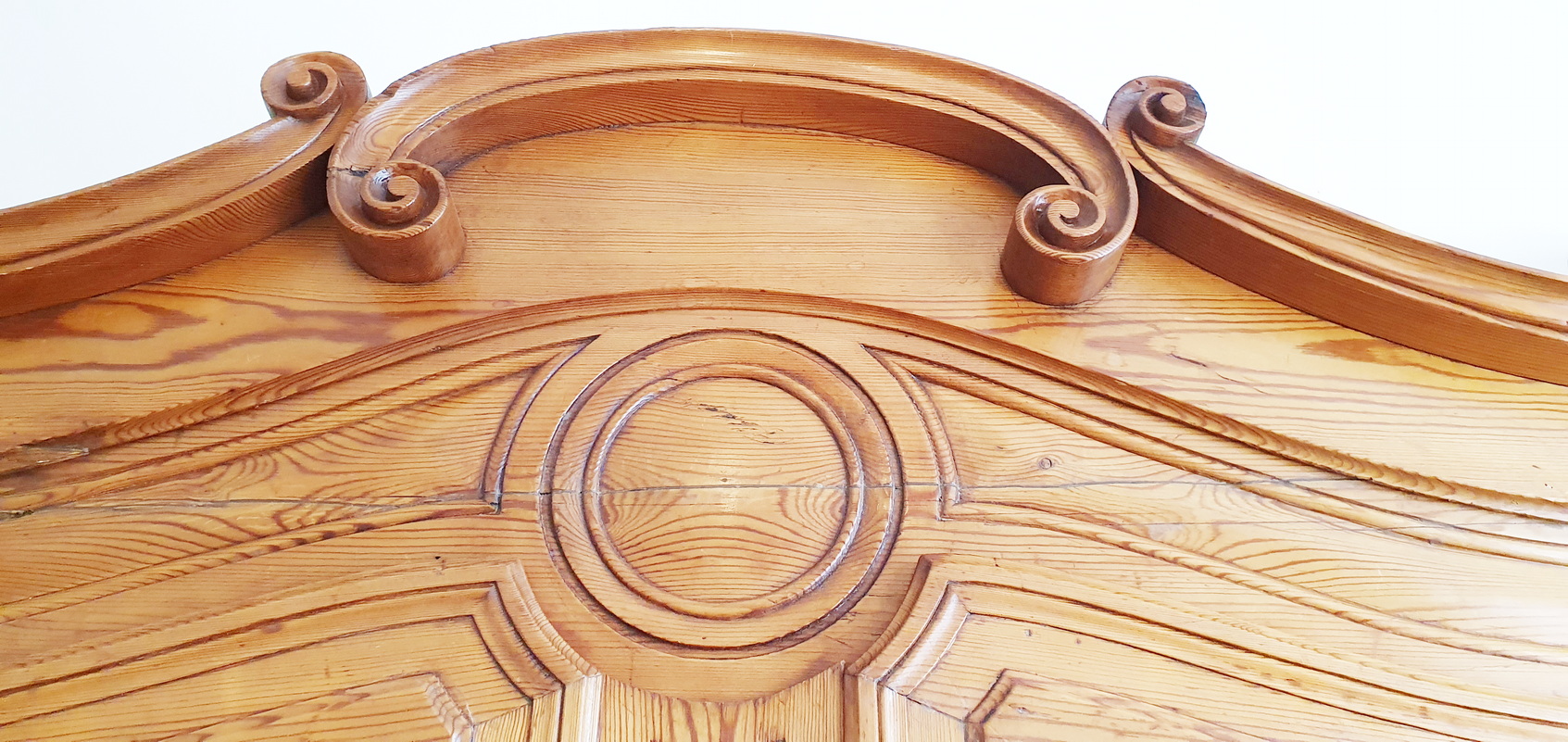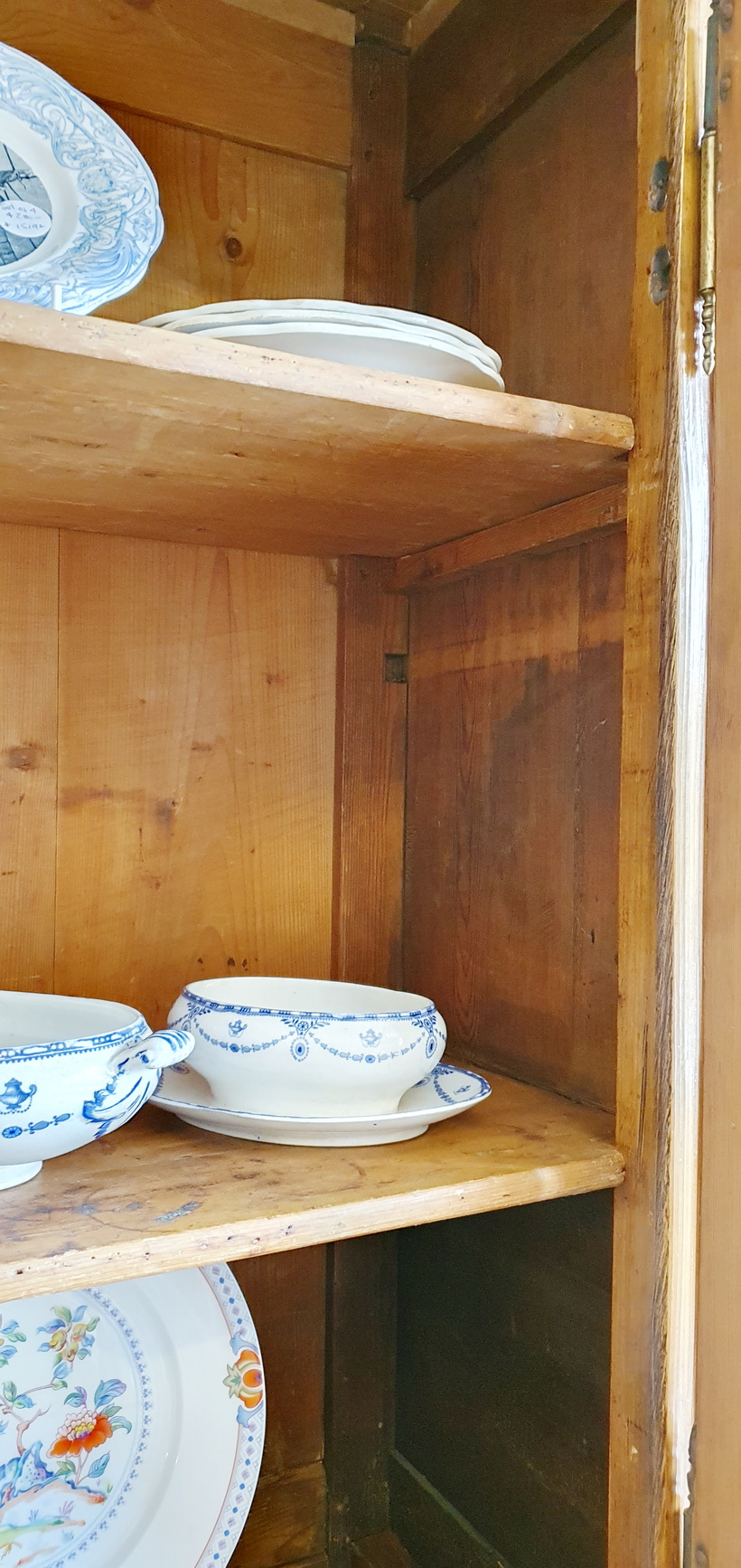 A 19th century French Napoleon III period, Louis XV style, solid pine "Buffet Vitré de Mariage", (a glazed marriage-buffet), originally given as a gift to a newly-wed couple and used in a home as a storage and display piece. The timbers are nicely-burnished and with the original patina, retaining the original internal shelving. Fitted with an elegant and large "Chapeau de Gendarme" pediment, the façade is decorated with haut relief scrollwork and circular mouldings typical of the French Pays de Caux region. Please note: this piece of furniture can also be used as a bookcase. Area of Pays de Caux (Upper Normandy), circa 1860.