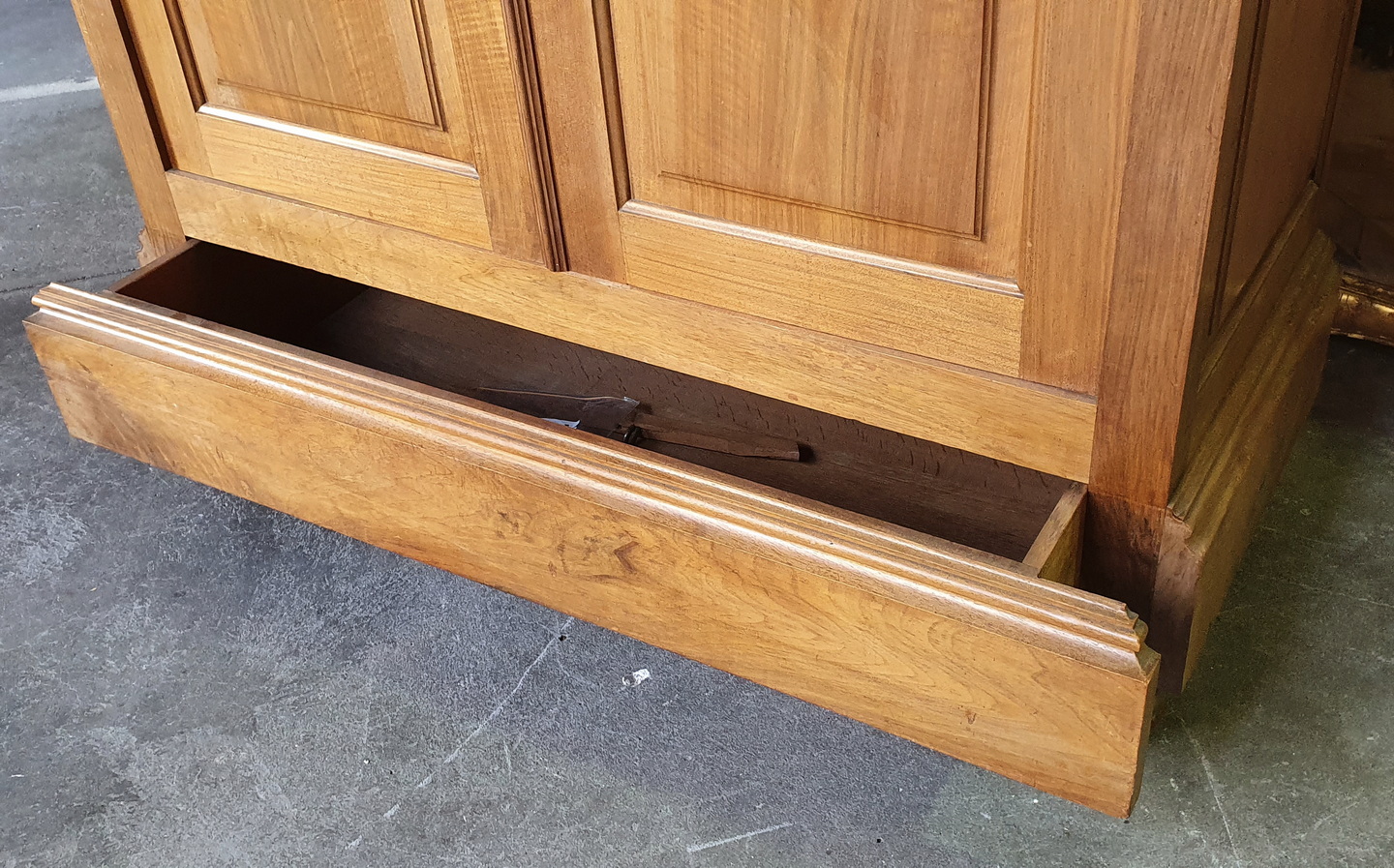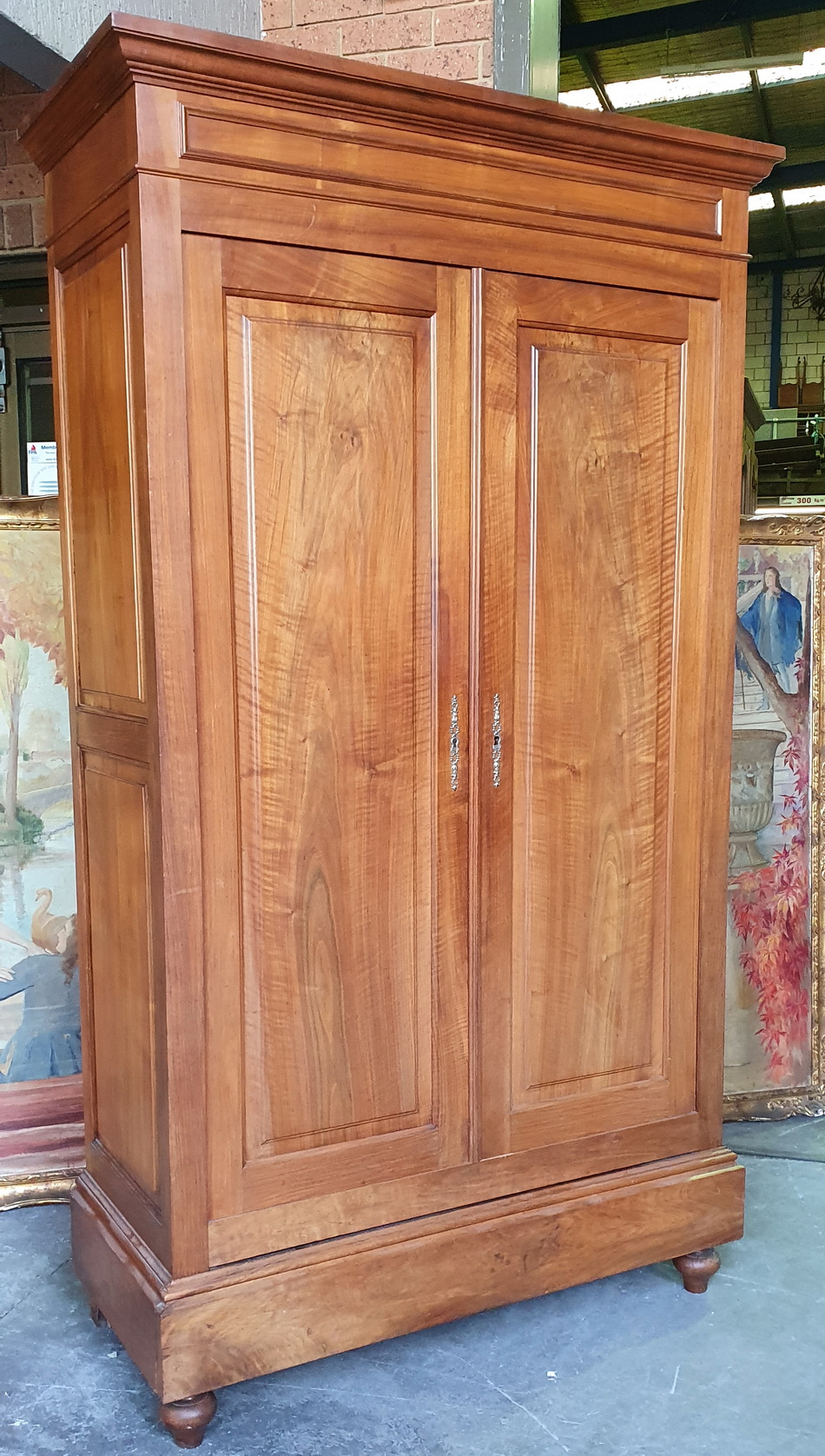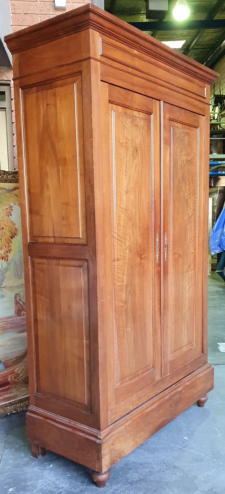 A 19th century French Napoleon III period book-matched and figured figured walnut two-door Armoire wardrobe of simple and masculine character, the façade with raised mouldings and panelled doors, above a secret drawer hidden in the plinth. Internally, this armoire is fitted with adjustable-height shelves. Area of Paris, circa 1870