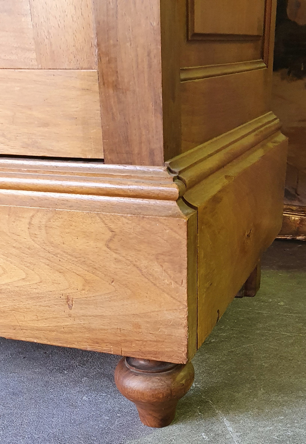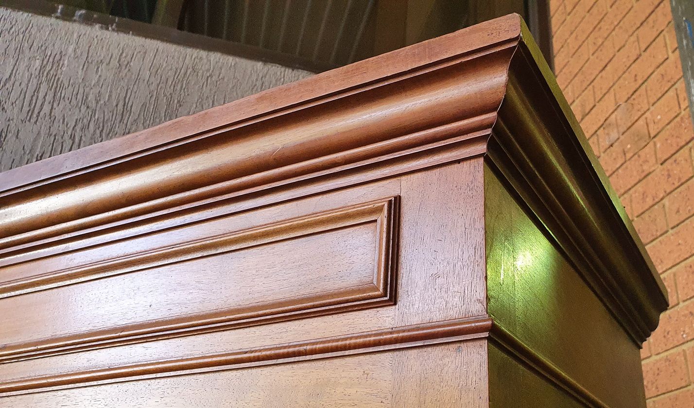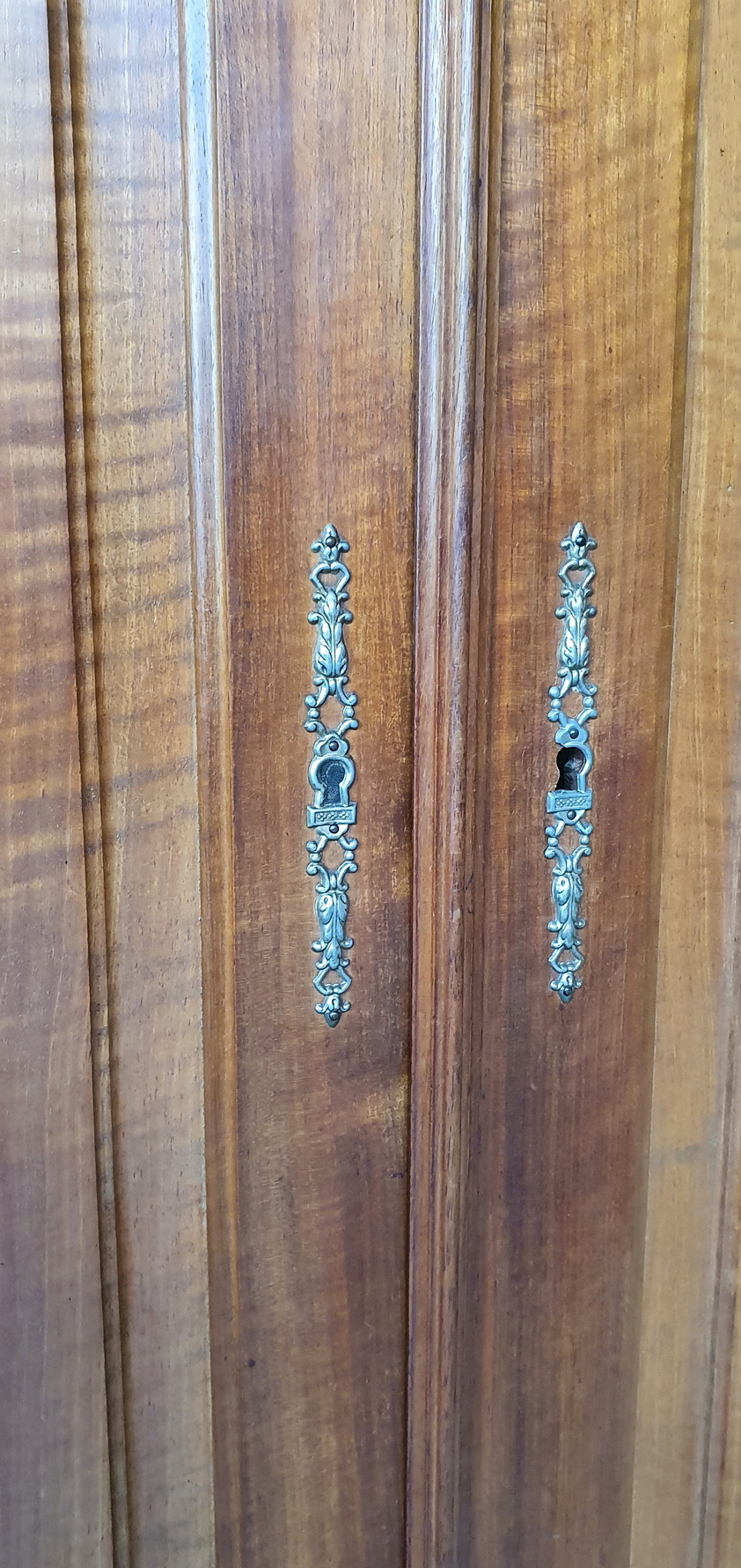 A 19th century French Napoleon III period book-matched and figured figured walnut two-door Armoire wardrobe of simple and masculine character, the façade with raised mouldings and panelled doors, above a secret drawer hidden in the plinth. Internally, this armoire is fitted with adjustable-height shelves. Area of Paris, circa 1870