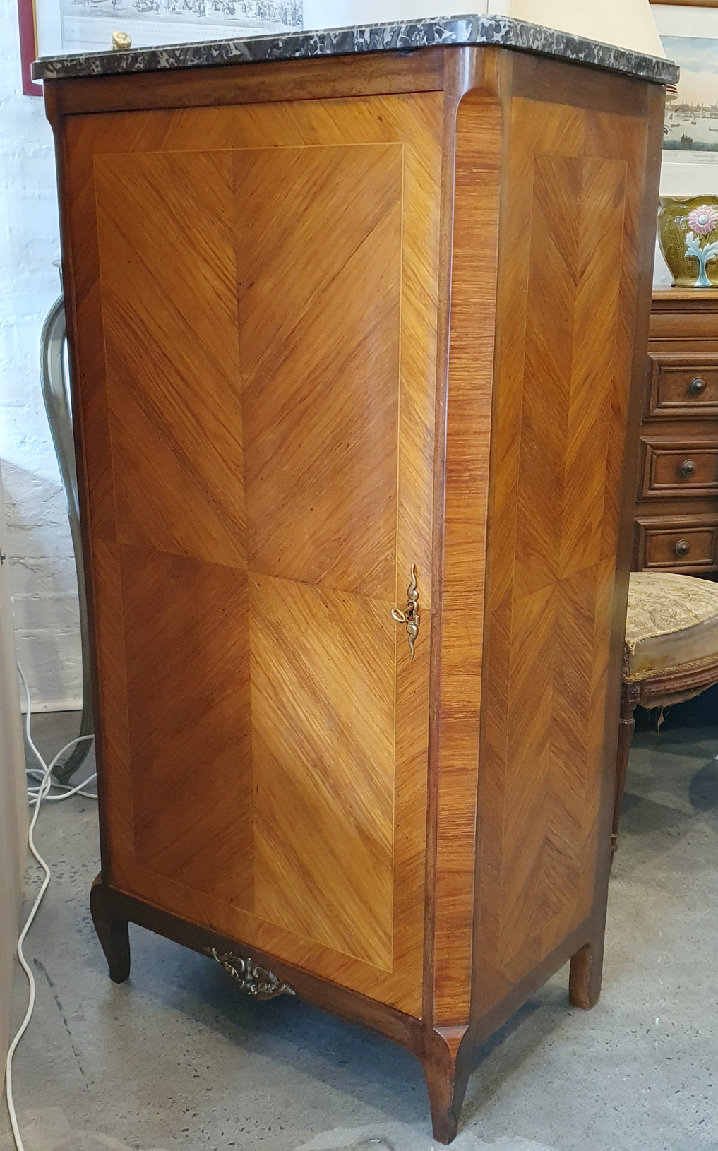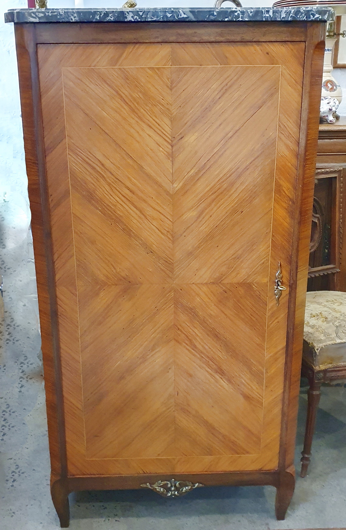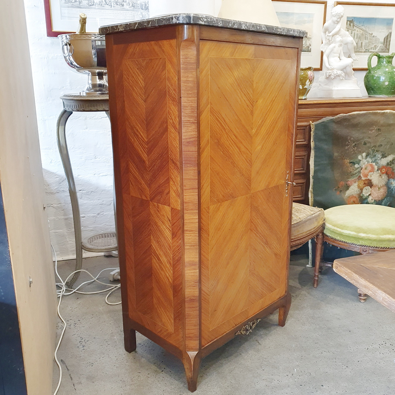 A French Louis XV/ Louis XVI Transitional style 'Armoirette' cupboard, the parquetry inlaid kingwood front and flanks with a wonderfully faded colour, retaining the original gilt brass escutcheon and plinth mount. The dark grey painted interior is fitted with adjustable height shelves. Retaining its original, moulded edge 'Gris St. Anne' marble top. Area of Paris, circa 1900.