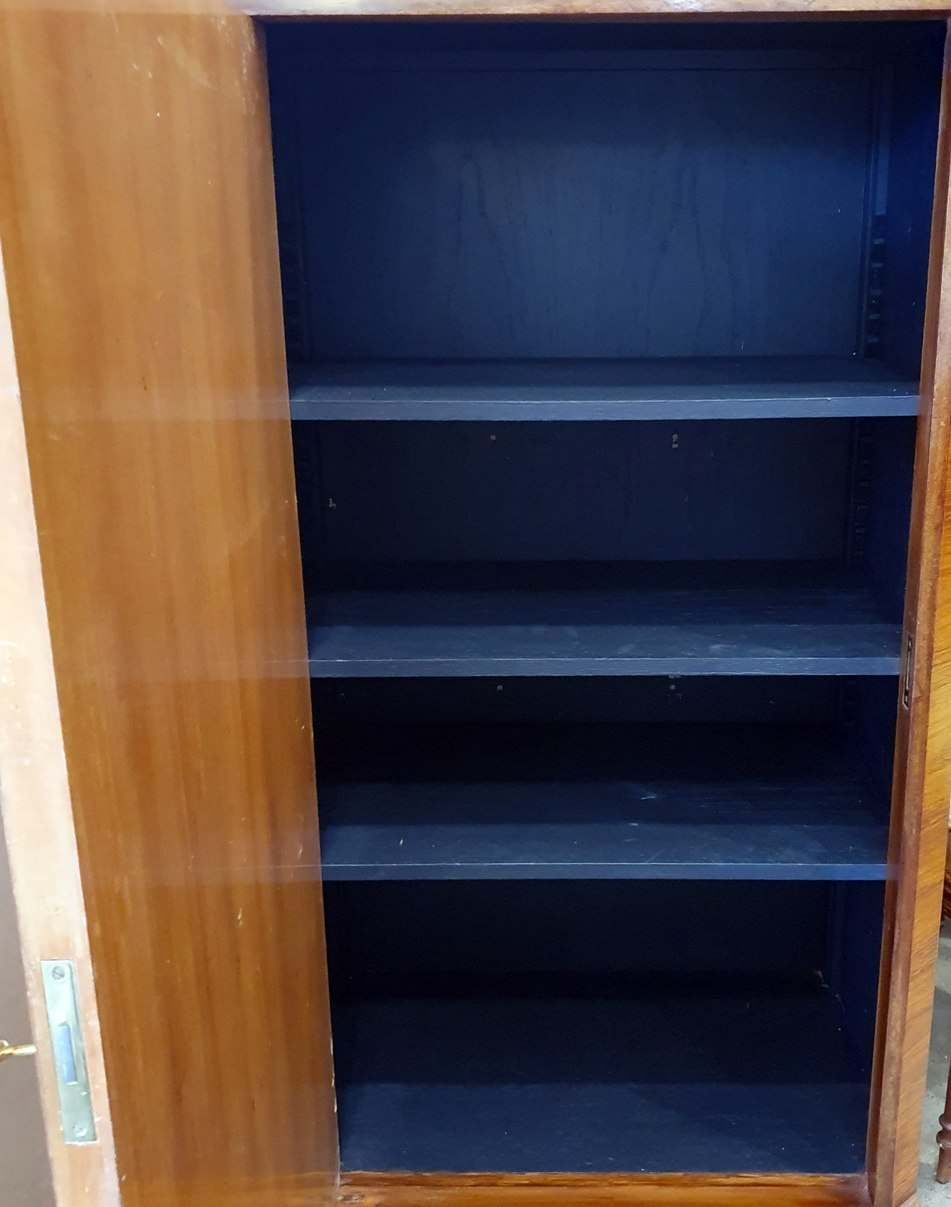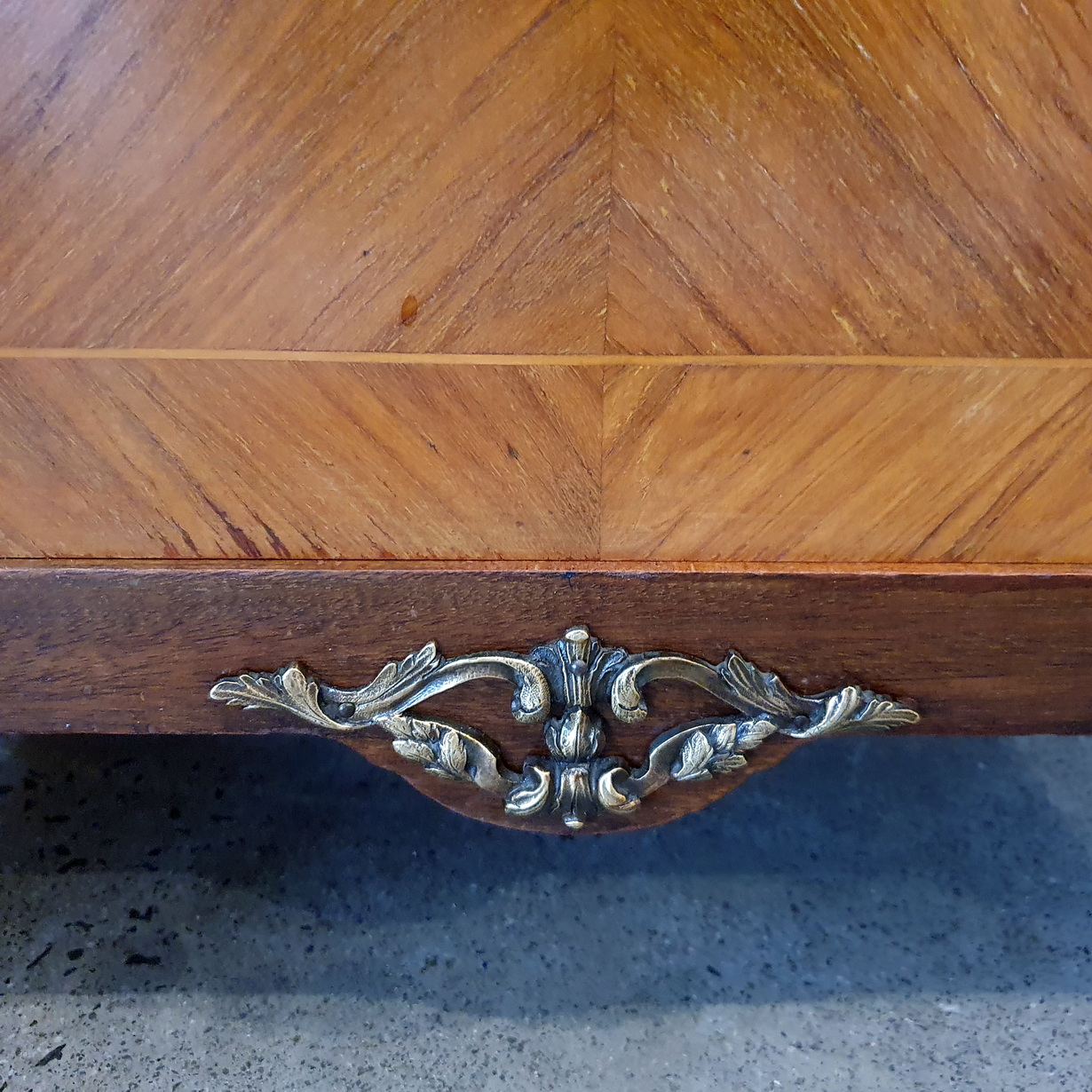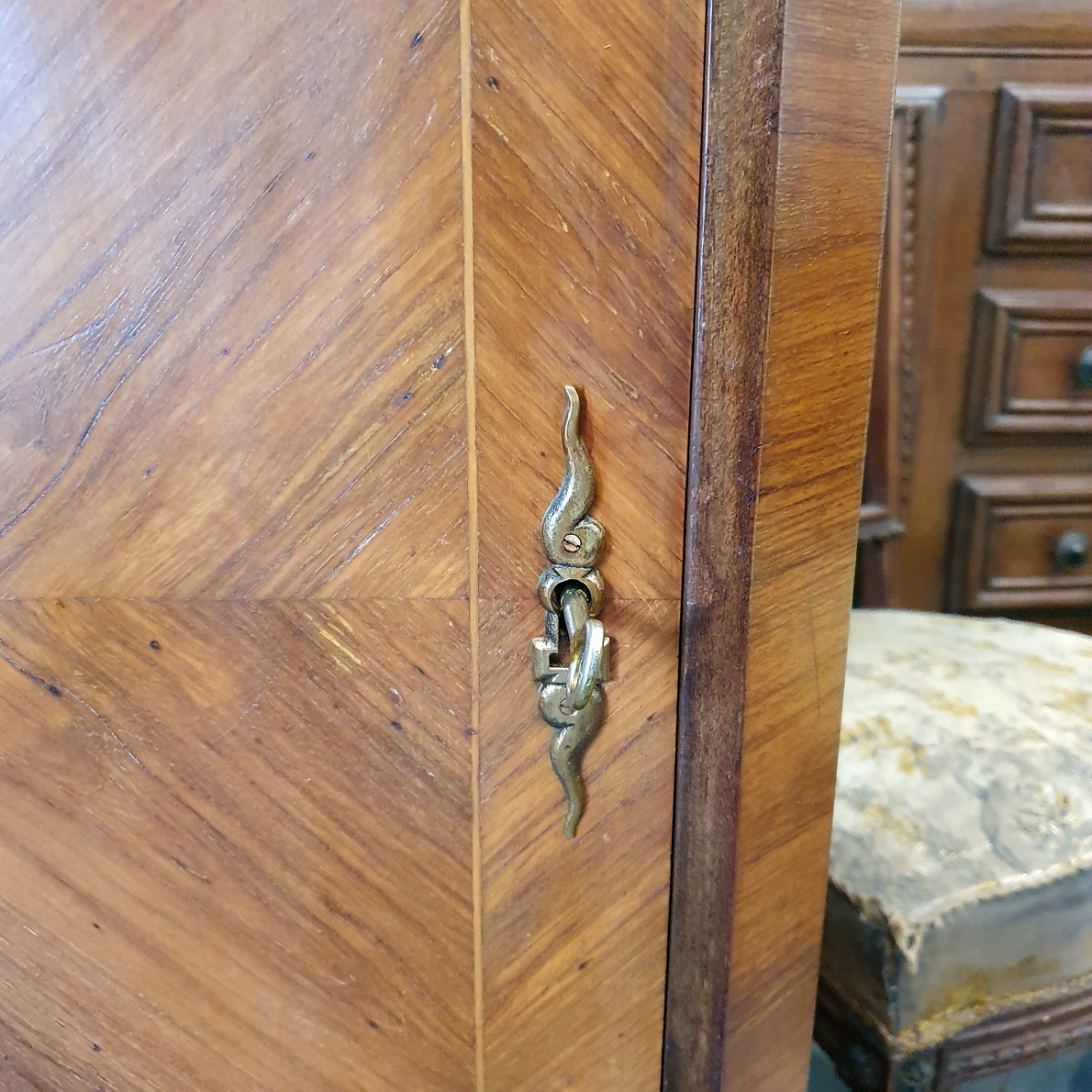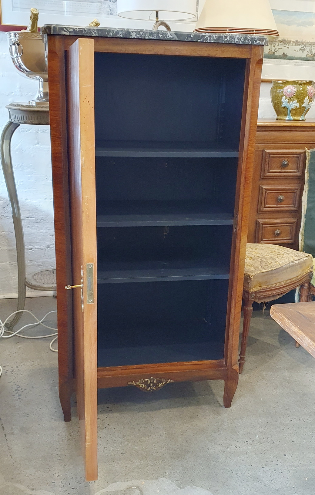A French Louis XV/ Louis XVI Transitional style 'Armoirette' cupboard, the parquetry inlaid kingwood front and flanks with a wonderfully faded colour, retaining the original gilt brass escutcheon and plinth mount. The dark grey painted interior is fitted with adjustable height shelves. Retaining its original, moulded edge 'Gris St. Anne' marble top. Area of Paris, circa 1900.