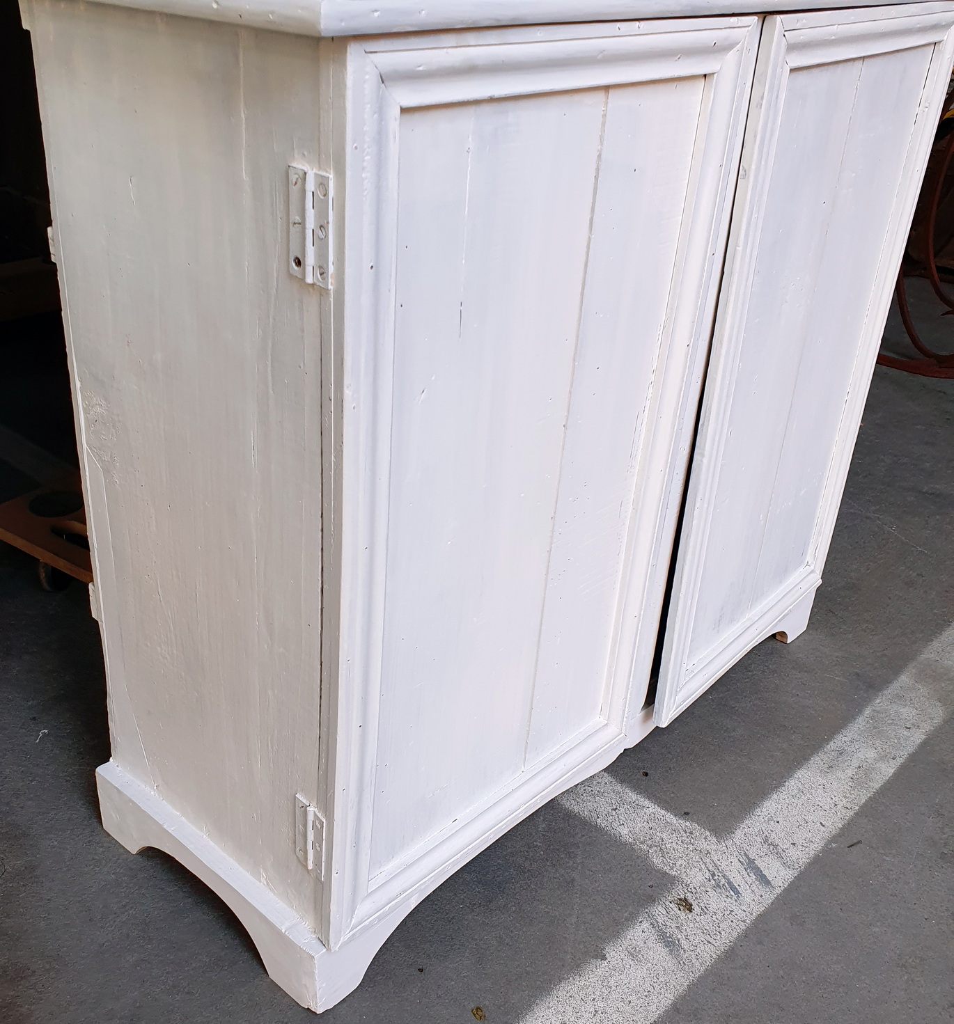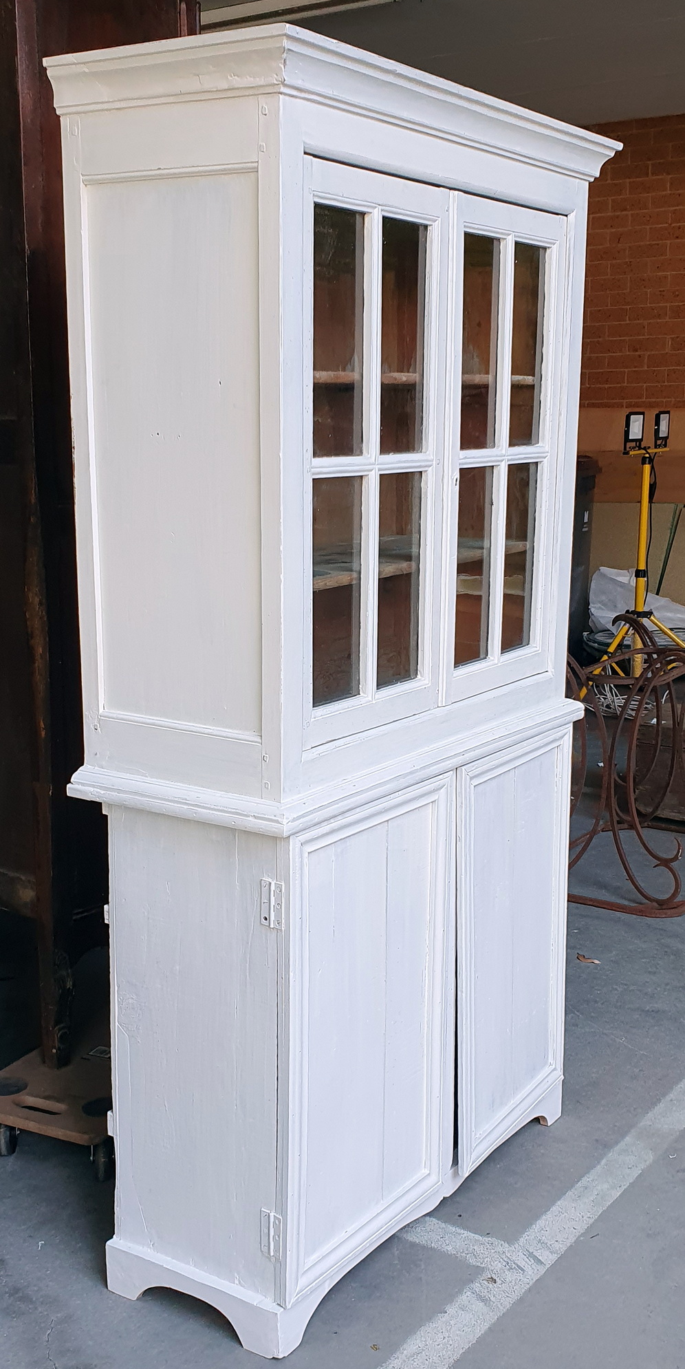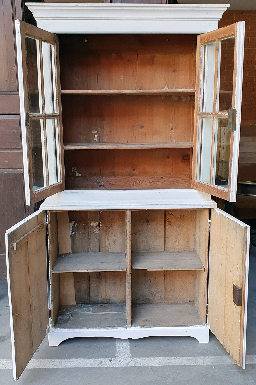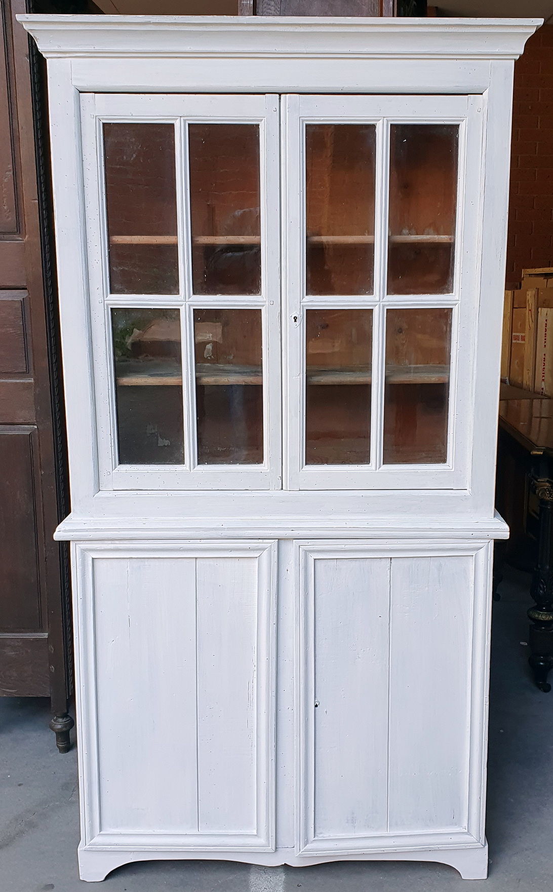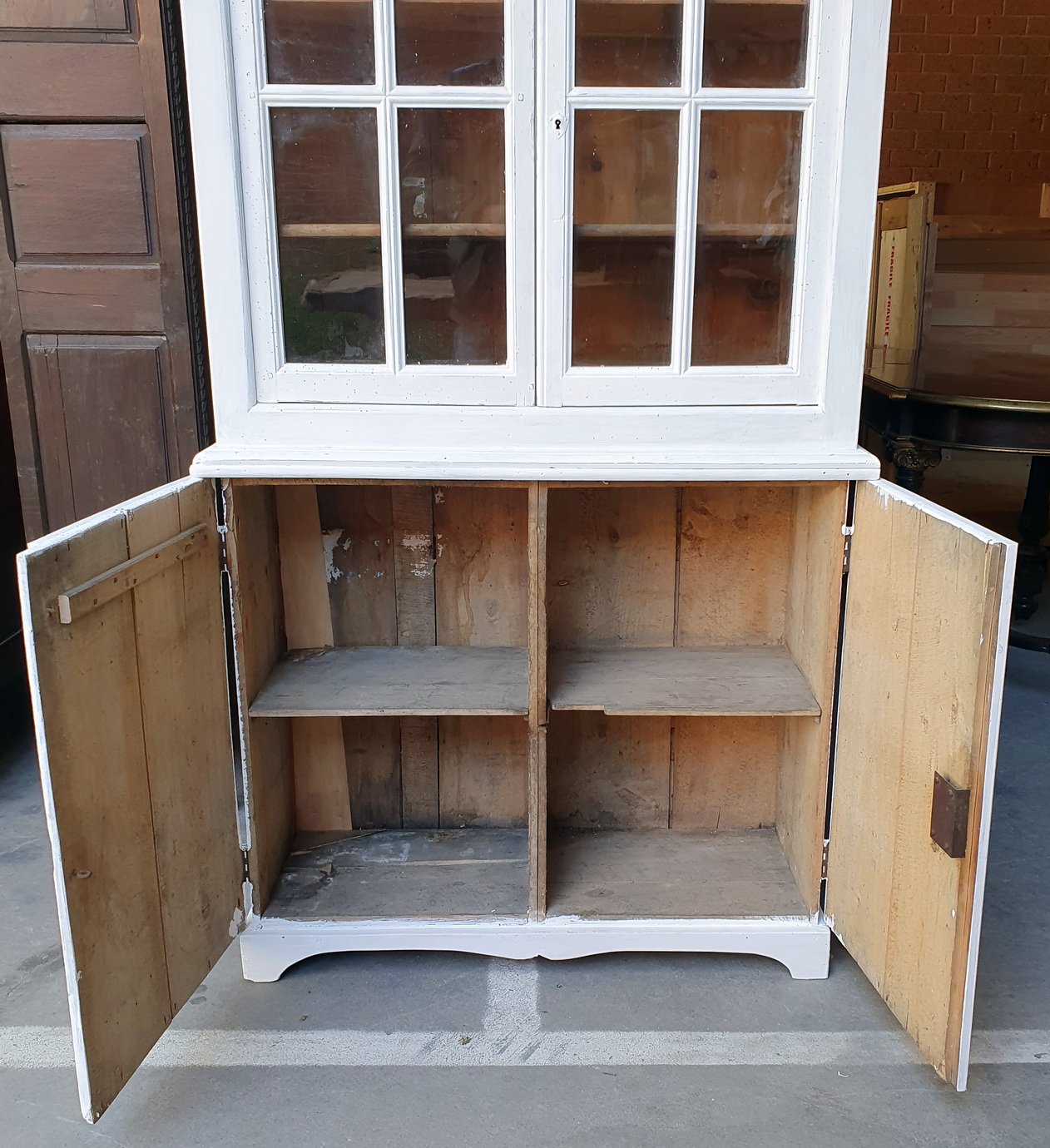 A French provincial two-part pantry cabinet, the top section with two astragal glazed doors and two internal shelves, the lower section with two panelled doors. Please note the wonderfully rustic character of this piece. Area of Normandy, circa 1930.
