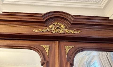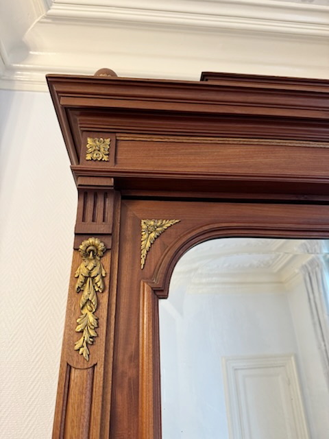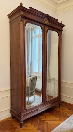 A fine 19th century French Louis XVI style, carved Cuban mahogany and gilt brass mounted two door Armoire, the doors fitted with their original hand-bevelled mirrors. Please note the Parisian quality of the mouldings and of the timbers. Internally fitted with with the original, adjustable-height shelves. Retaining the original strap-lock and key. Area of Paris, circa 1880.