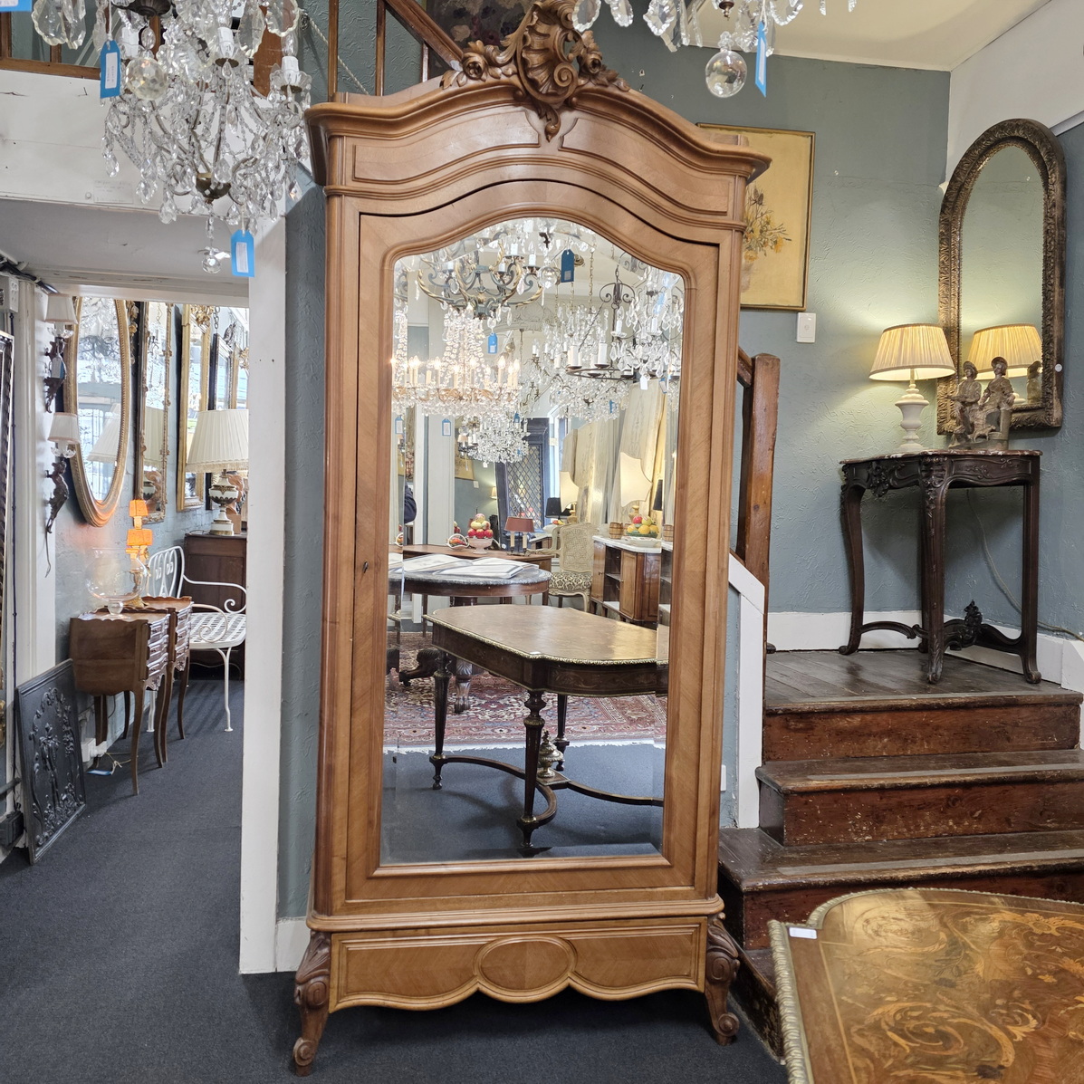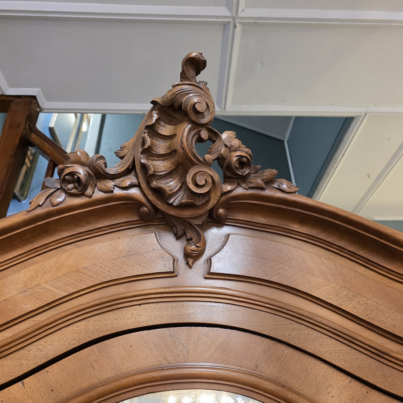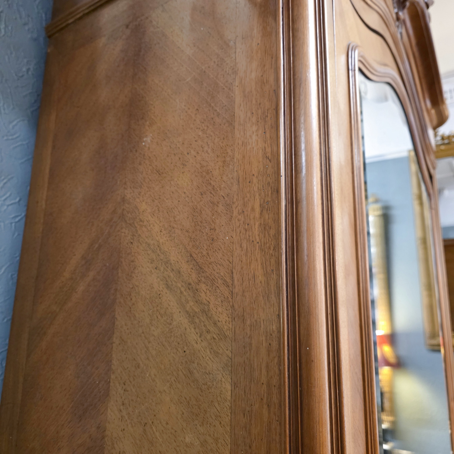 A fine, 19th century French Louis XV style single door walnut and cross-banded 'Armoire' wardrobe fitted with the original bevelled mirror front, the crest decorated with a haut relief carved Rococo 'Cartouche', standing on Cabriole legs. Internally fitted with adjustable-height shelves. Please note the soft and mellow walnut colour. Area of Paris, circa 1890.