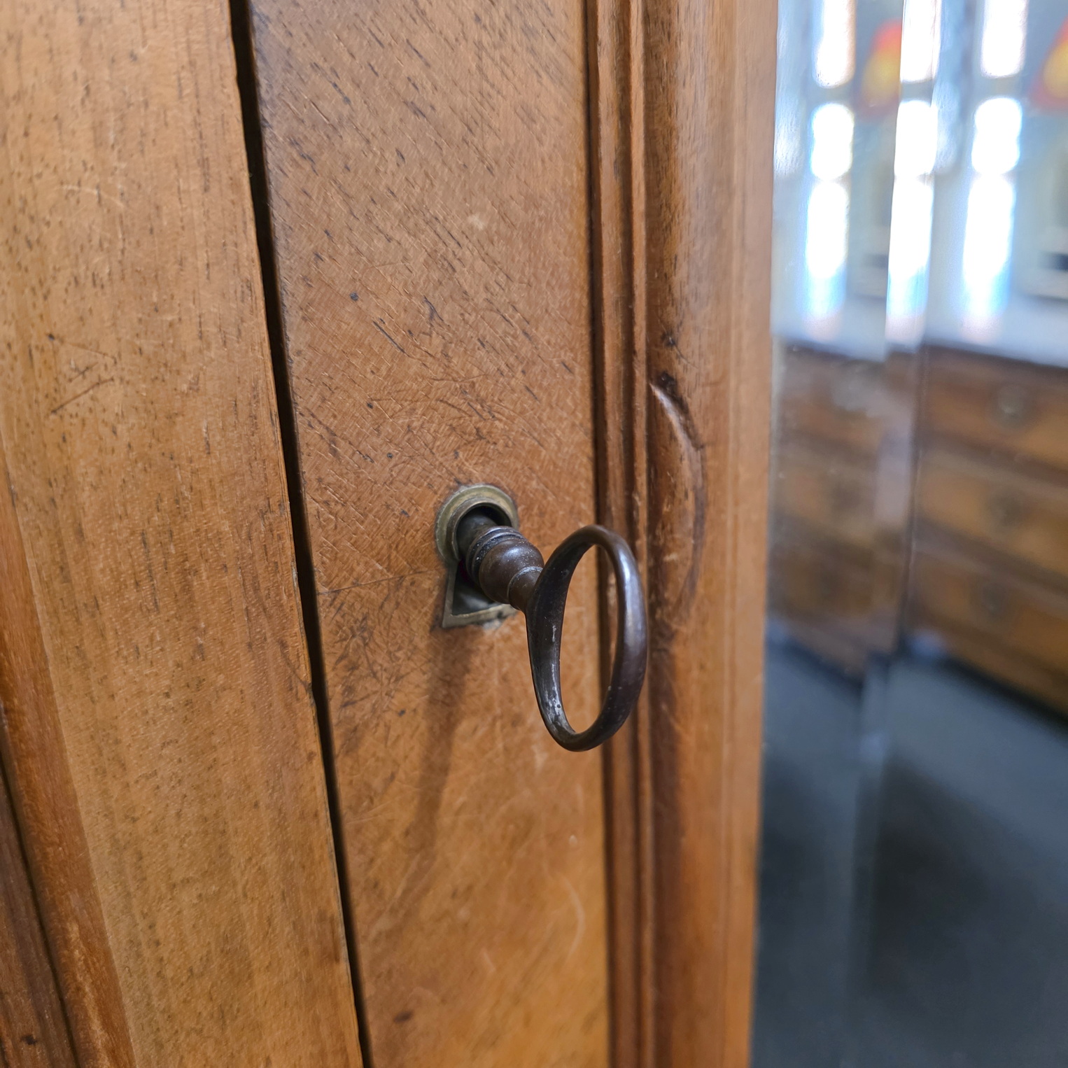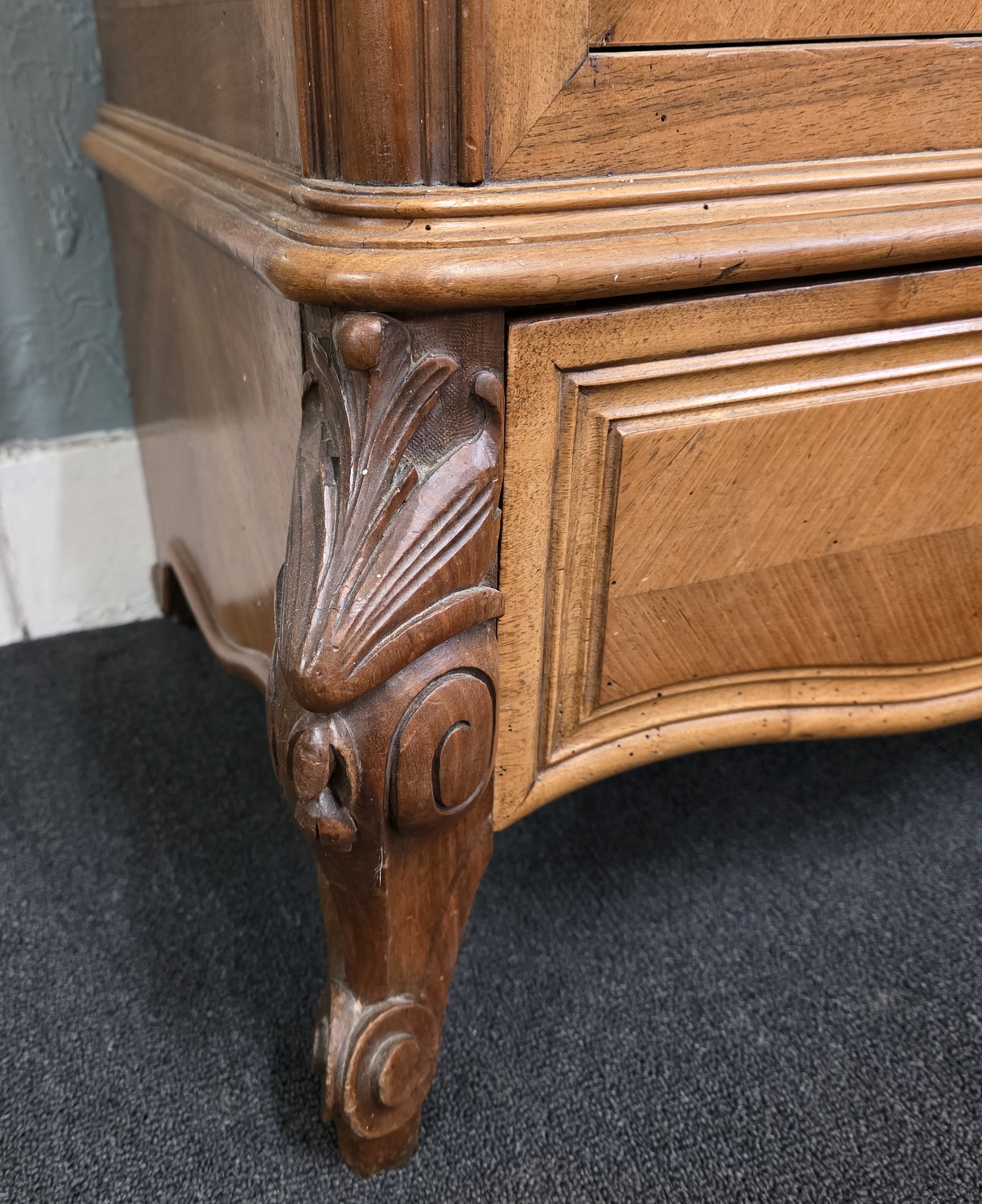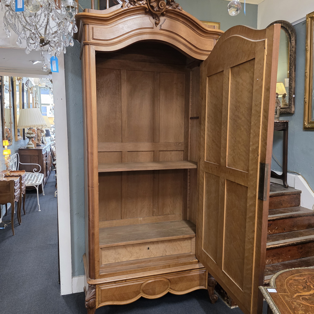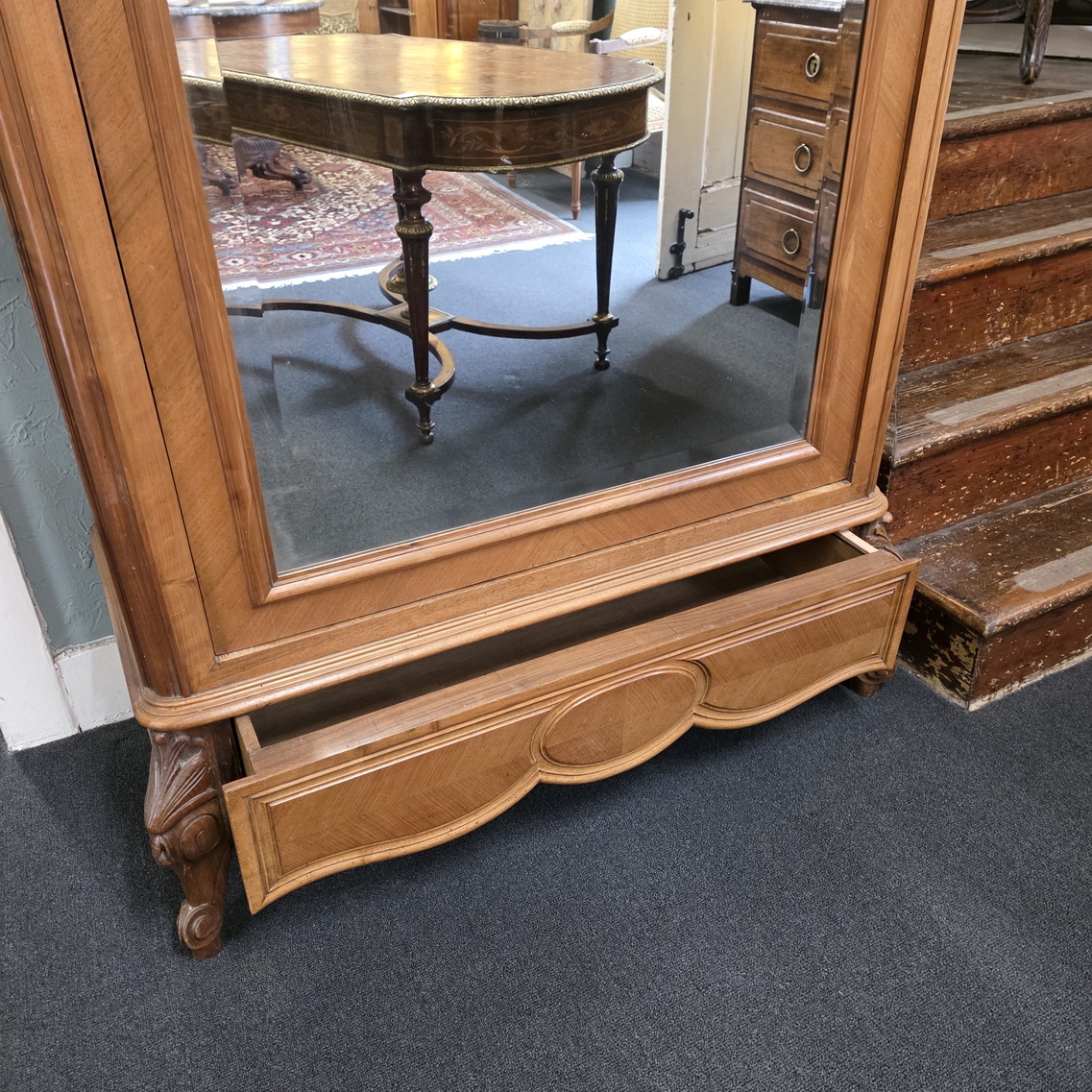 A fine, 19th century French Louis XV style single door walnut and cross-banded 'Armoire' wardrobe fitted with the original bevelled mirror front, the crest decorated with a haut relief carved Rococo 'Cartouche', standing on Cabriole legs. Internally fitted with adjustable-height shelves. Please note the soft and mellow walnut colour. Area of Paris, circa 1890.