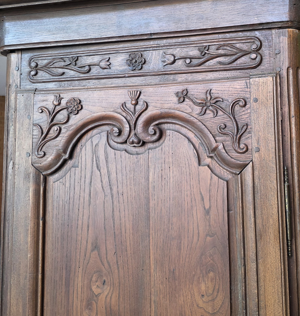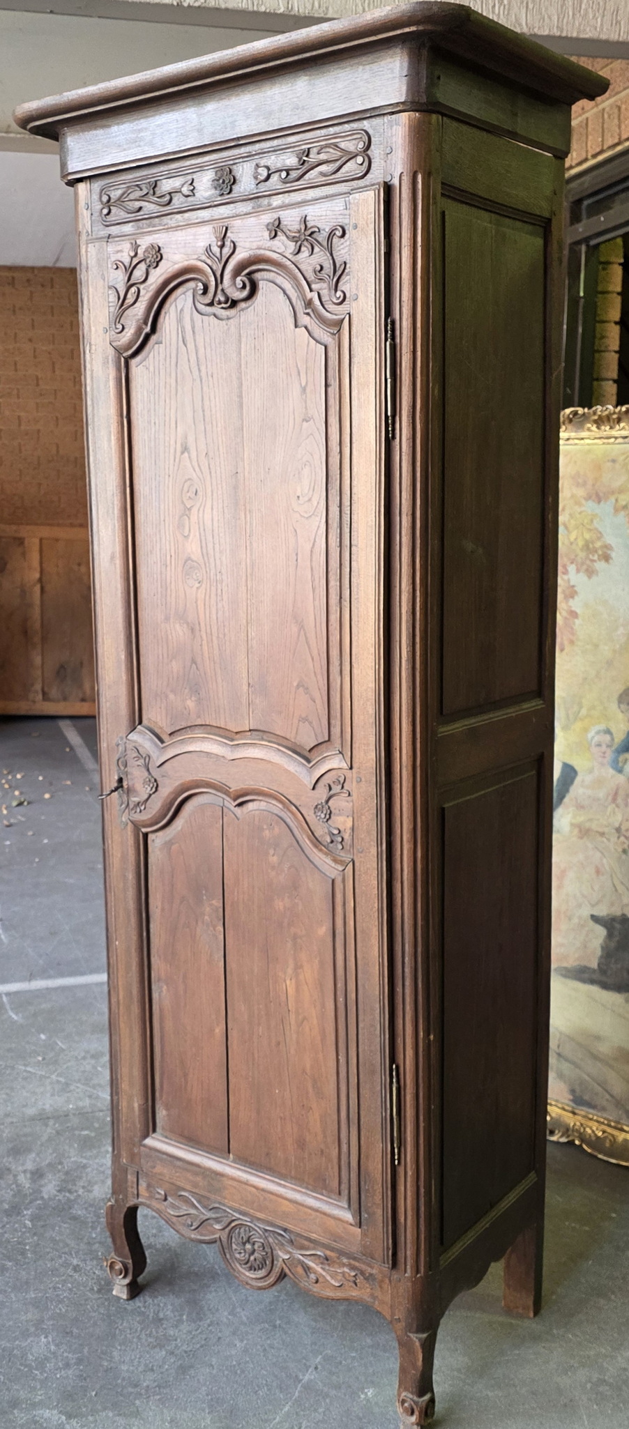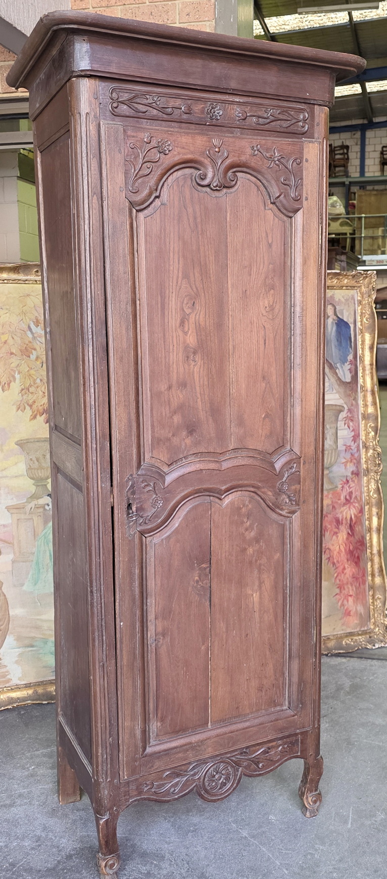 A 19th century French provincial, tall and narrow, Louis XV style, haut-relief carved solid oak 'Bonnetiere de Mariage' cupboard, the pediment and the panelled door decorated with haut-relief carved flowers and with foliate motifs. Internally fitted with shelves. Area of Normandy, circa 1880.