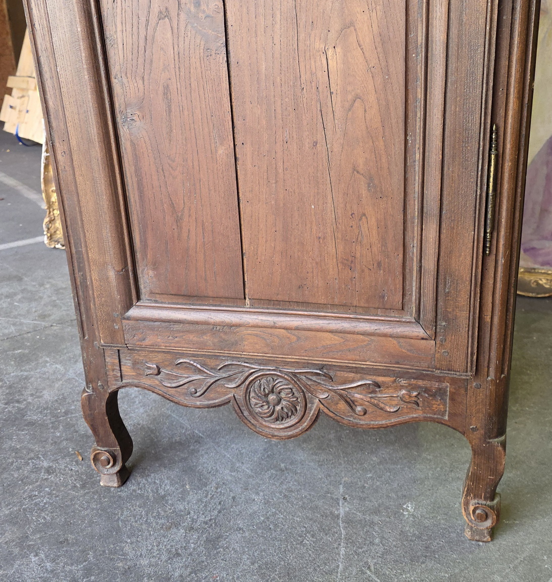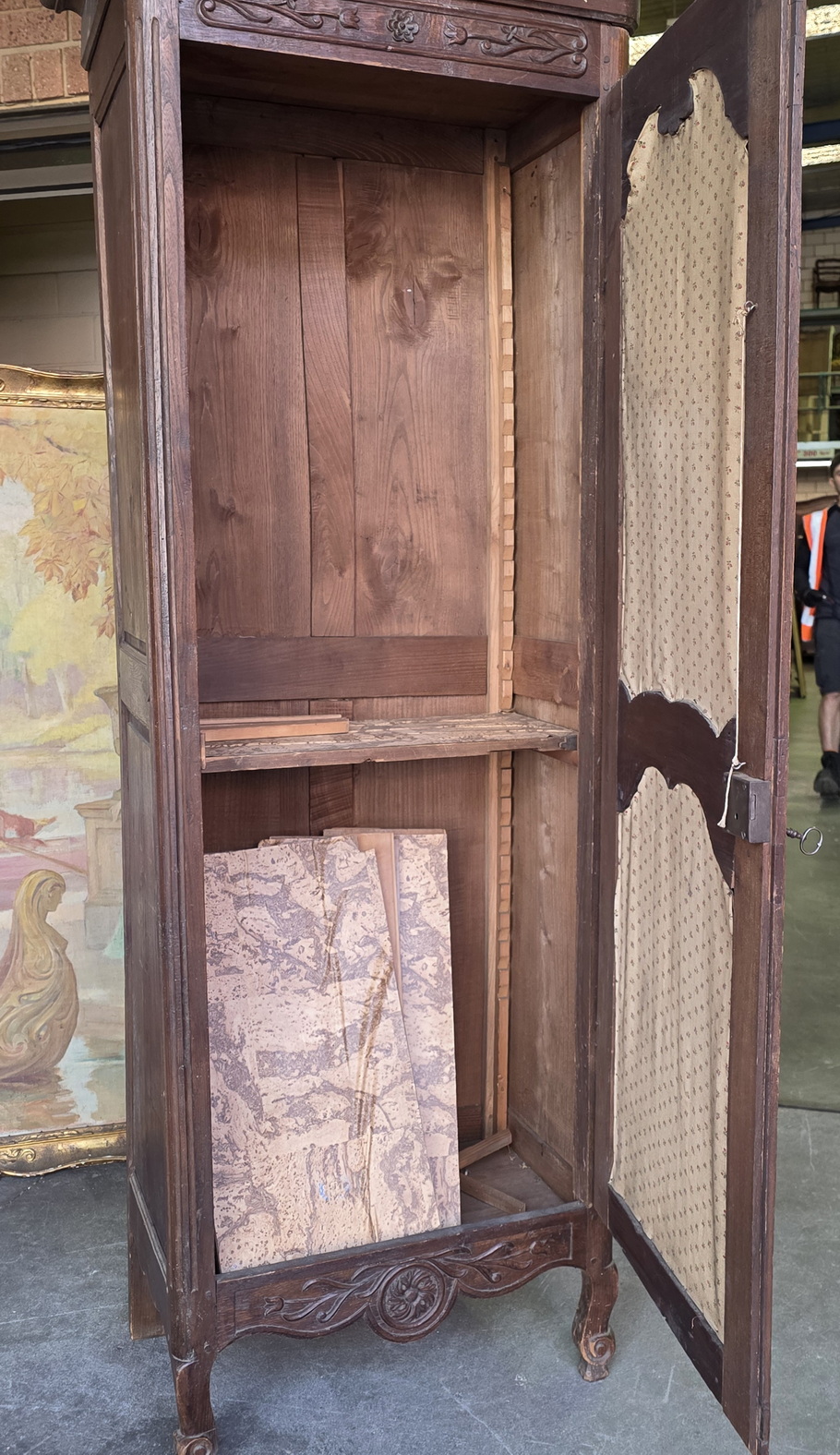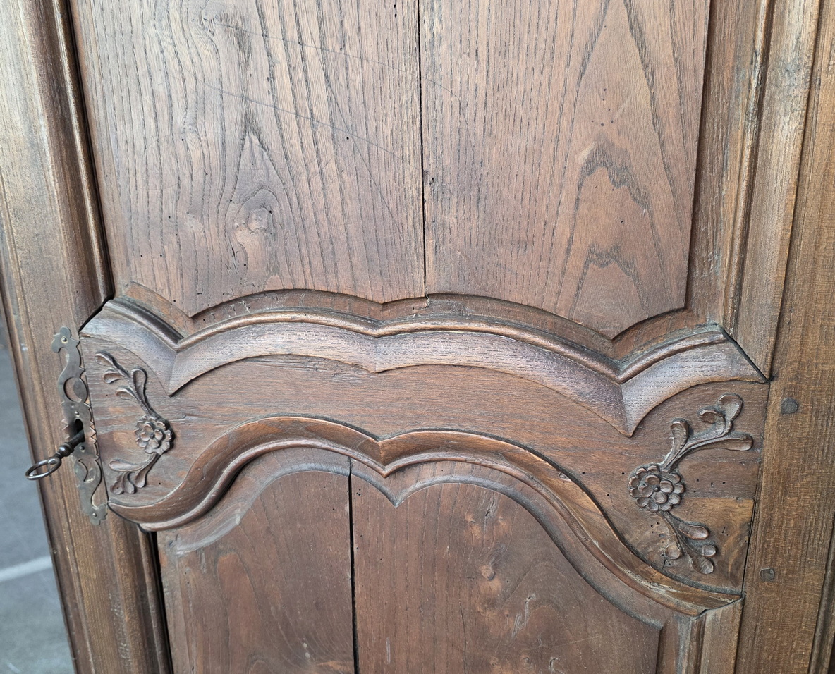 A 19th century French provincial, tall and narrow, Louis XV style, haut-relief carved solid oak 'Bonnetiere de Mariage' cupboard, the pediment and the panelled door decorated with haut-relief carved flowers and with foliate motifs. Internally fitted with shelves. Area of Normandy, circa 1880.