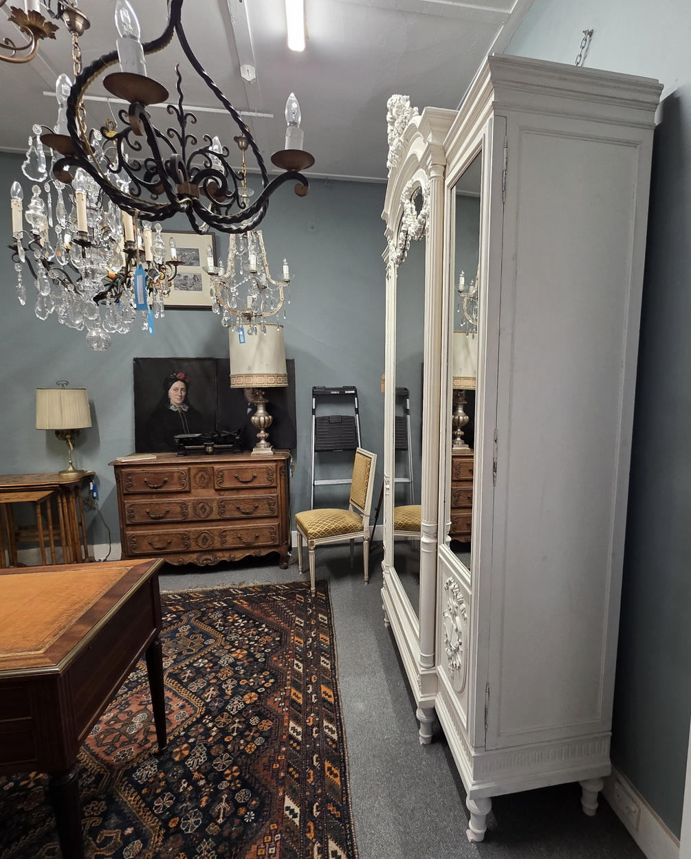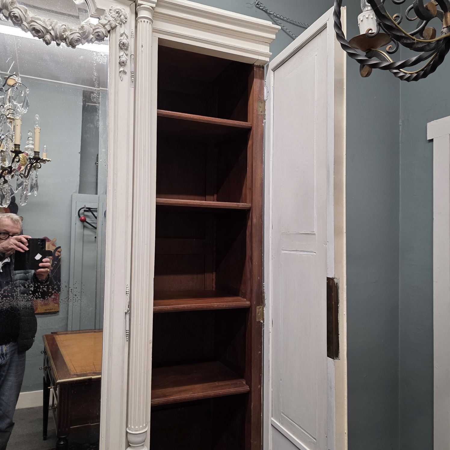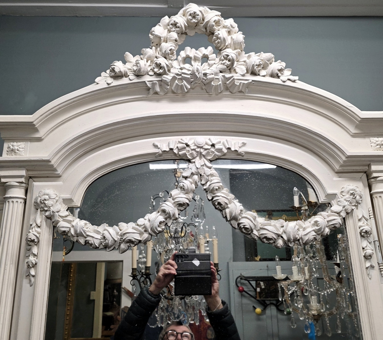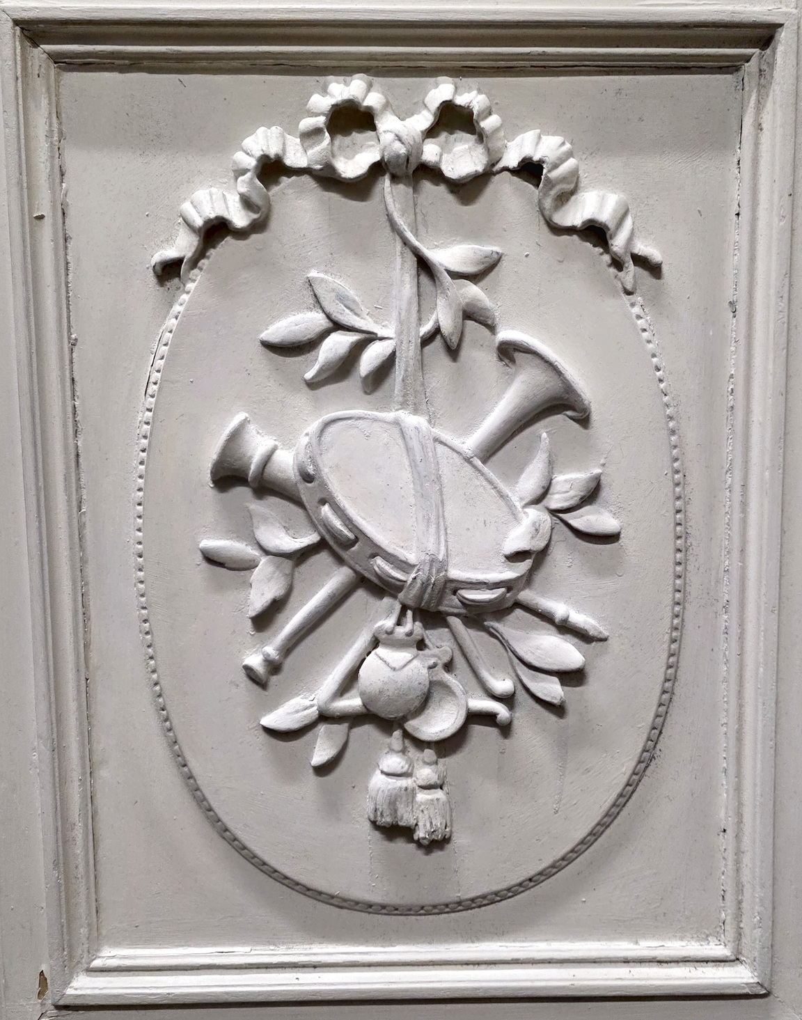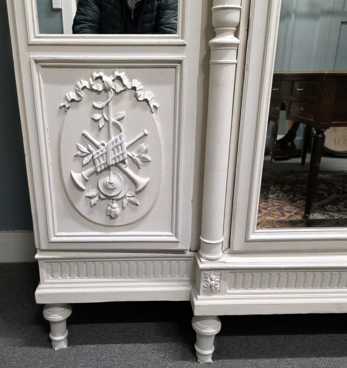 A large and fine, 19th century French Louis XVI style, carved and painted three-door mirrored Armoire, the central door fitted with a bevelled edge mirror. The pediment is decorated with an out-sized wreath of roses, the stepped-front façade with turned and fluted pilasters, haut-relief carved paterae, dentil mouldings, and wonderful carved timber swags across the mirror front. The lateral doors decorated with haut relief carved panels depicting musical instruments, an allegory for Harmony. Internally, this armoire is fitted with its original, adjustable-height shelves. This armoire is designed to be disassembled and reassembled, for ease of transport. Please note the crispness of the hand-carved haut relief decorations. Area of Paris, circa 1880.