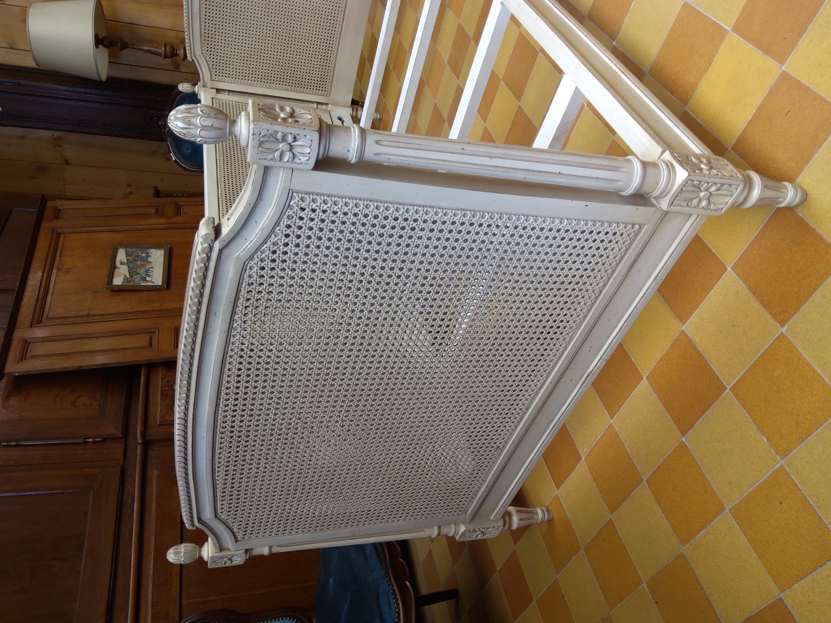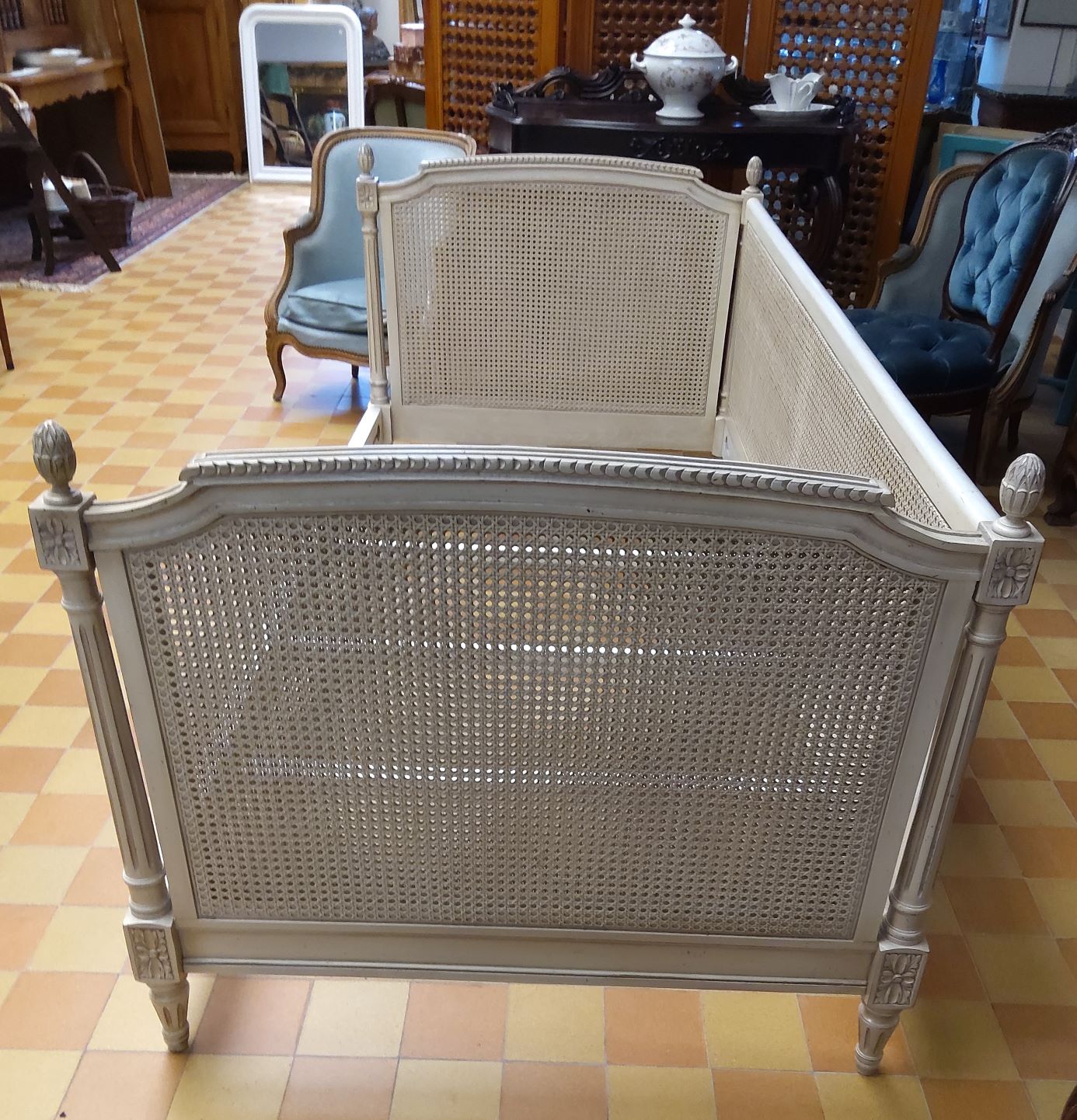 A late 19th century French Directoire style, finely carved and painted three seater "Lit de Repos" fitted with finely woven back and flanks. Decorated with carved paterae, fluted pilasters, pine cone finials. Retaining the original milk paint finish in an off white and all woven rattan, in good condition. This Lit de repos will fit a standard single mattress (188 x 92 cm) and could be used as a bed. Area of Paris, circa 1880.