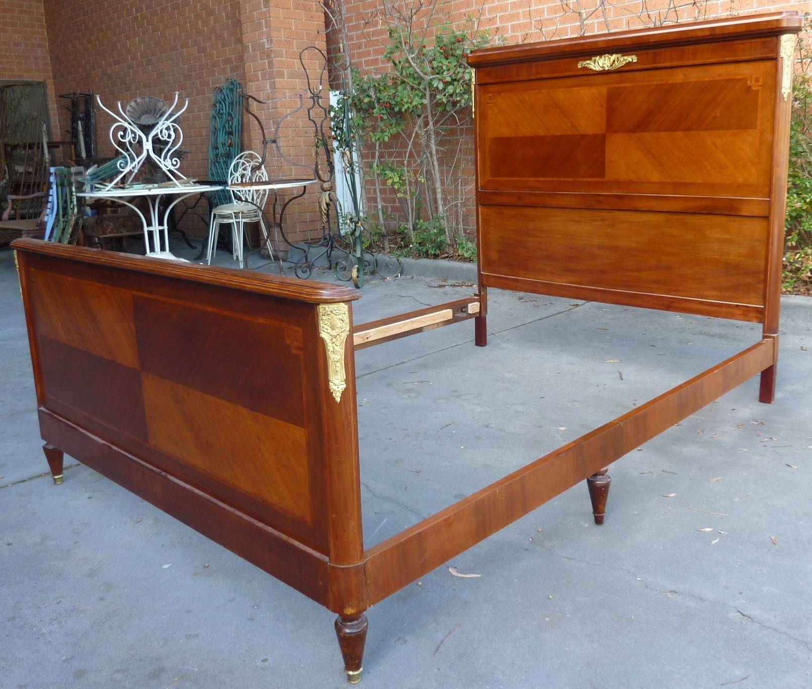 A late 19th/ early 20th century French Louis XVI style carved solid walnut, book-matched and inlaid walnut bed, the bed head and footer decorated with fine gilt brass mounts. This bed can fit a Queen size mattress (of 152 cm width) if the entire width of the bed (150 cm is used).