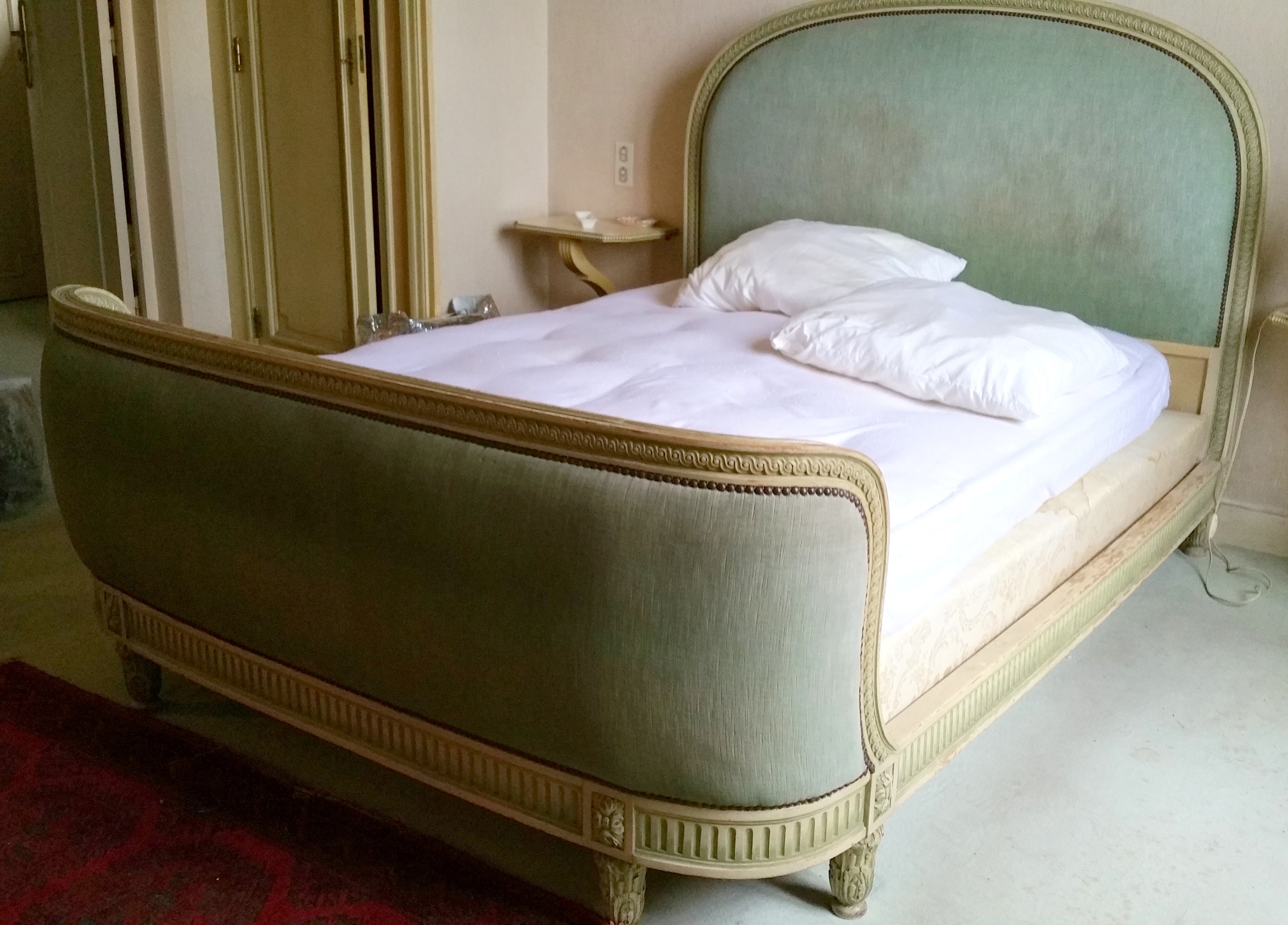 A large, early 20th century French Louis XVI style finely carved and painted Double Size bed, comprising a shaped bed head, a curved ‘Corbeille’ footer, and matching side rails. Note the simple, Neoclassical elegance. Area of Paris, circa 1930. This item due to arrive in Melbourne around mid 2018.