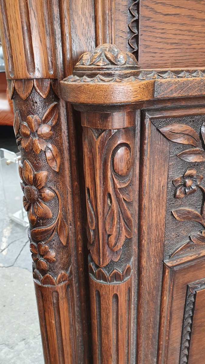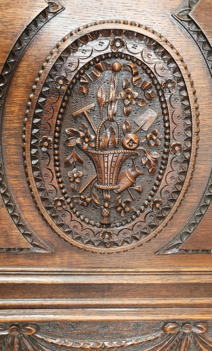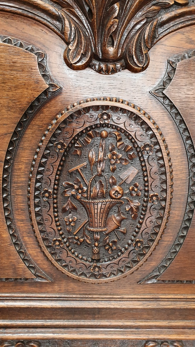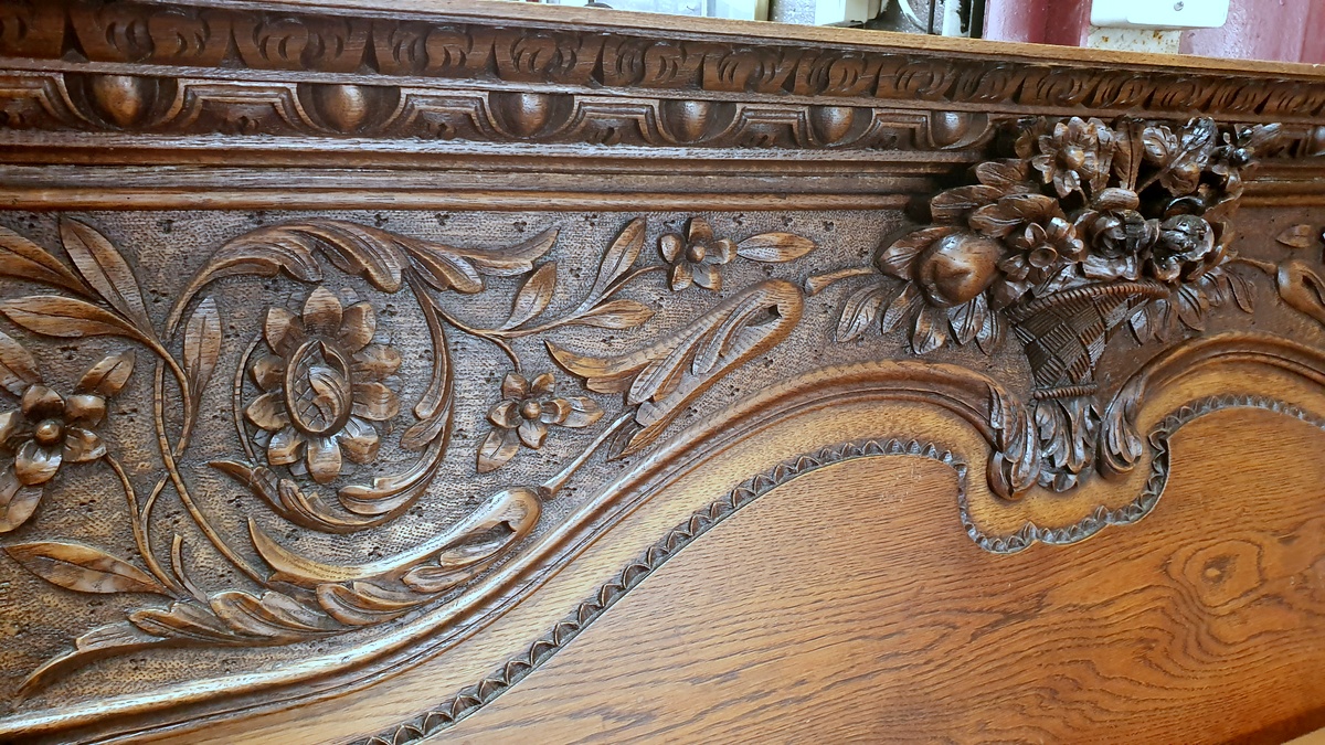 An elegant 19th century carved solid oak Double bed, the header and footer are both finely decorated with haut-relief floral and foliate motifs, with large central bouquets and an overflowing basket, (allegories for abundance and youthfulness). The footer with a shaped rail decorated with haut-relief carved swags. Area of Rouen, Normandy, circa 1880. This bed retains its original bedside table, stock ID 10686, and can be purchased separately. This bed is suitable for use with a double-bed sized mattress (which in Australia is 137 x 188 cm).