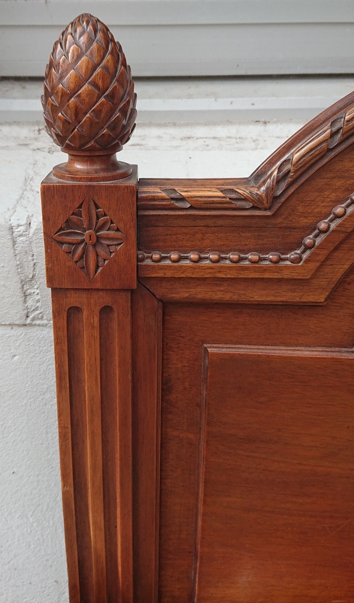 A fine 19th century French Louis XVI style solid walnut single bed, retaining its the original and nicely worn finish. Decorated with haut-relief Neoclassical motifs including pine cones, continuous-ribbon mouldings, acanthus leaf motifs, fluting and paterae. This bed will accommodate a standard full-size Australian single mattress. Area of Paris, circa 1880.