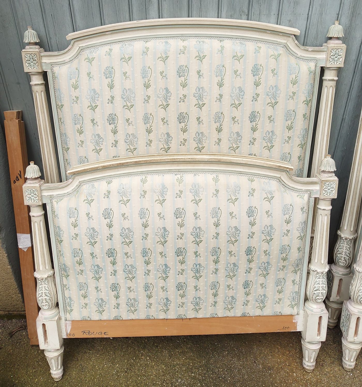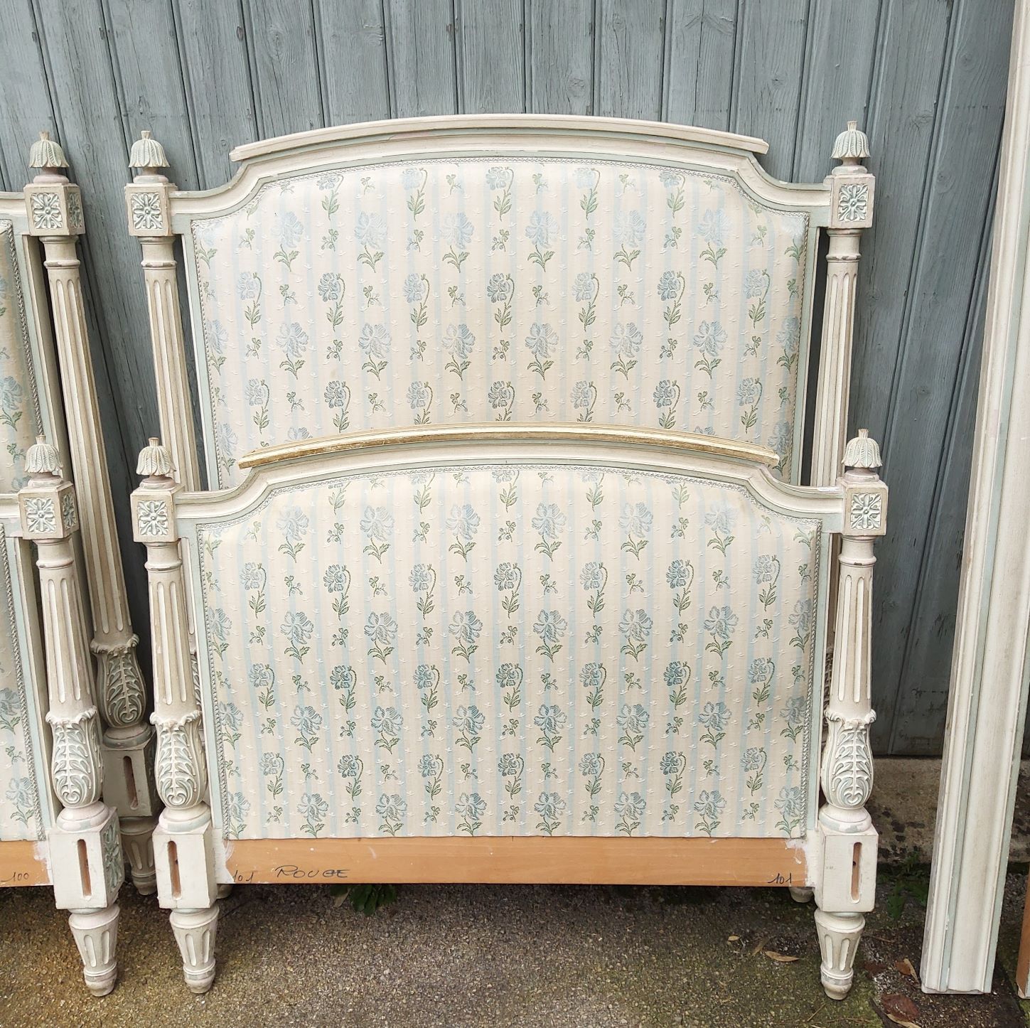 An identical pair of French Directoire style single beds, each with the original, nicely worn painted finish and upholstered with a brocade style patterned fabric. Area of Paris, circa 1900.
