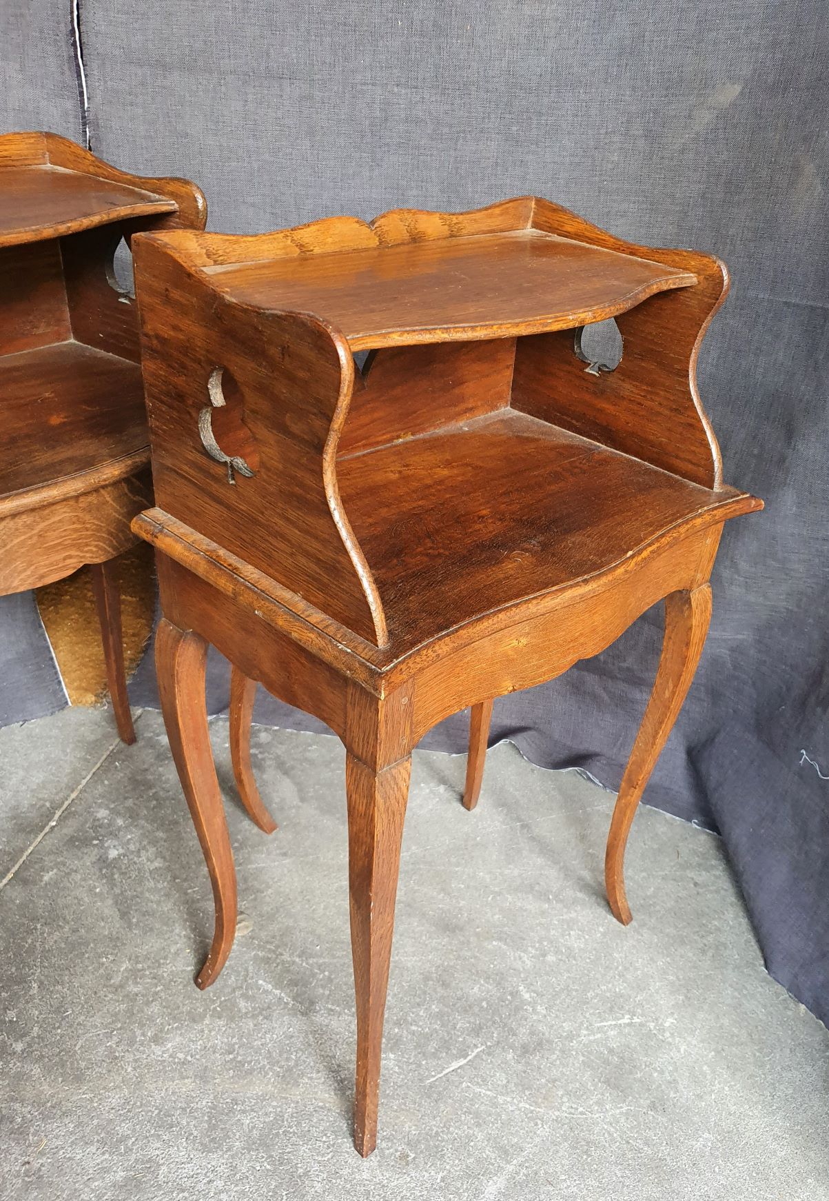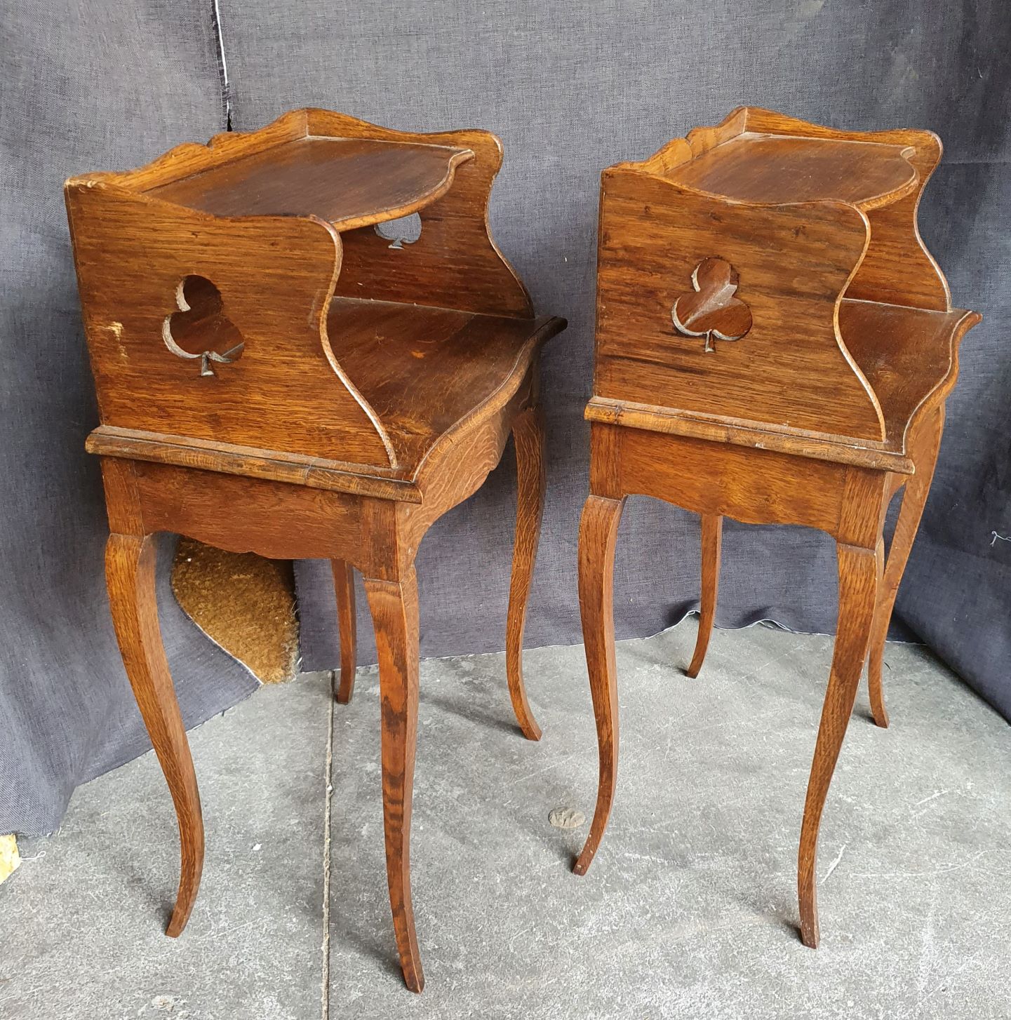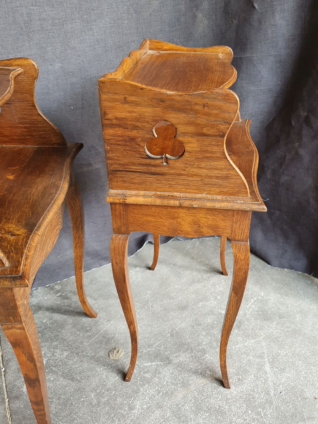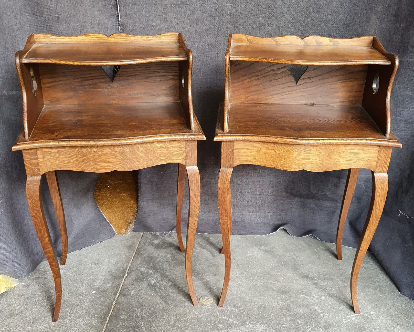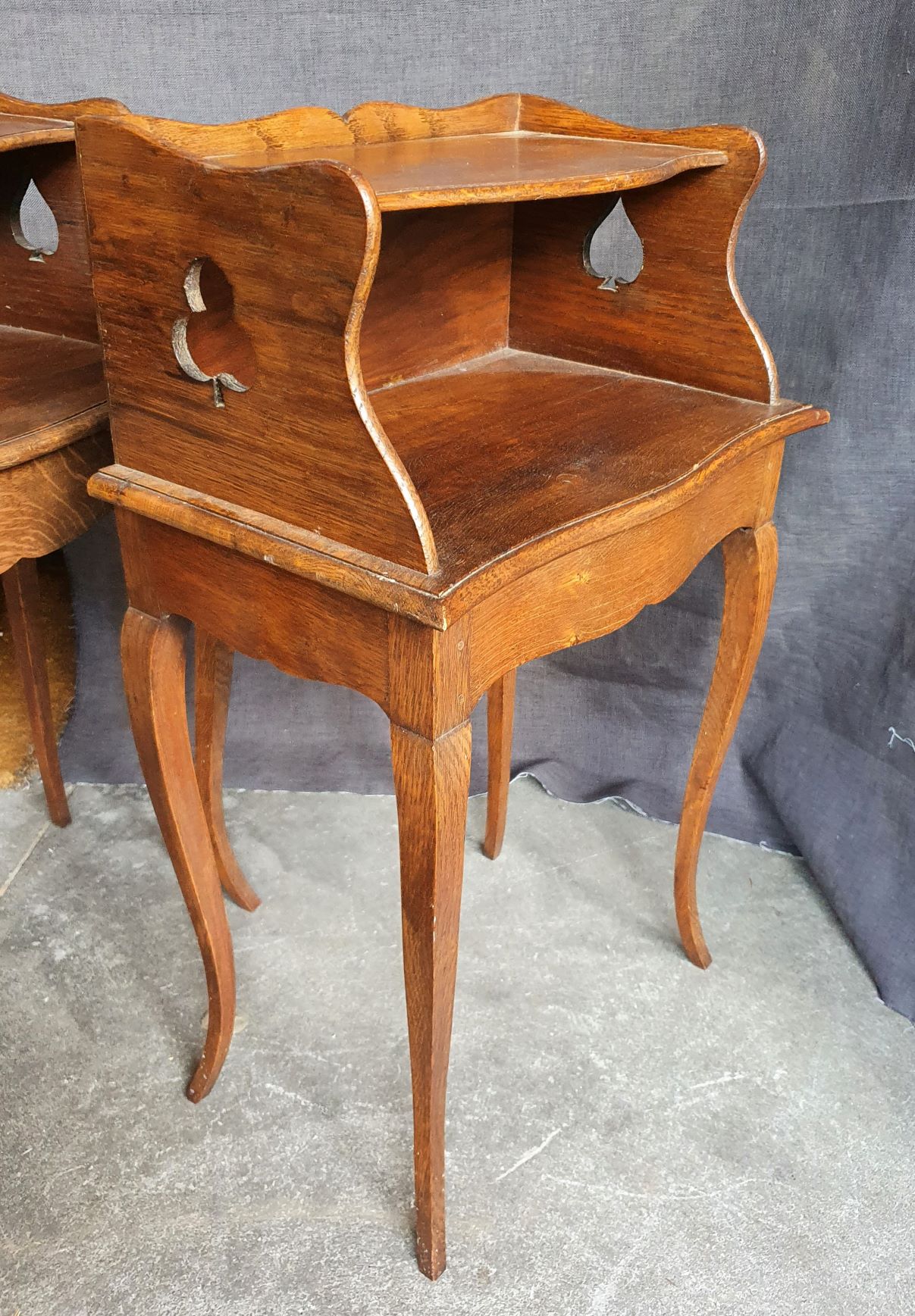 A pair of French Provincial Louis XV style carved oak bedside tables of simple design, the façades fitted with open cupboards, shallow drawers opening on flanks of thee cabinets. Please note the whimsical cut-out trefoil and heart-shapes on the flanks. Area of Normandy, circa 1900.