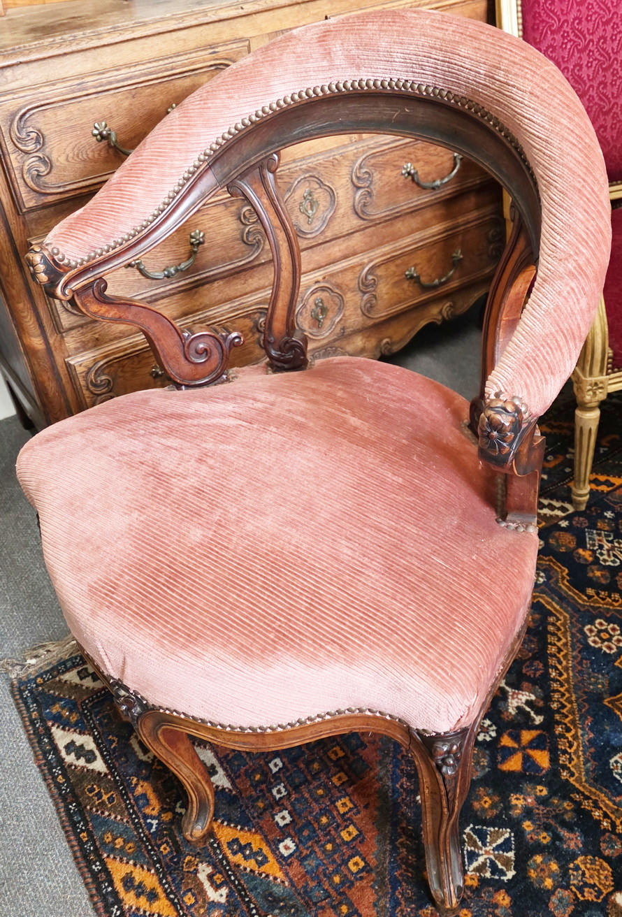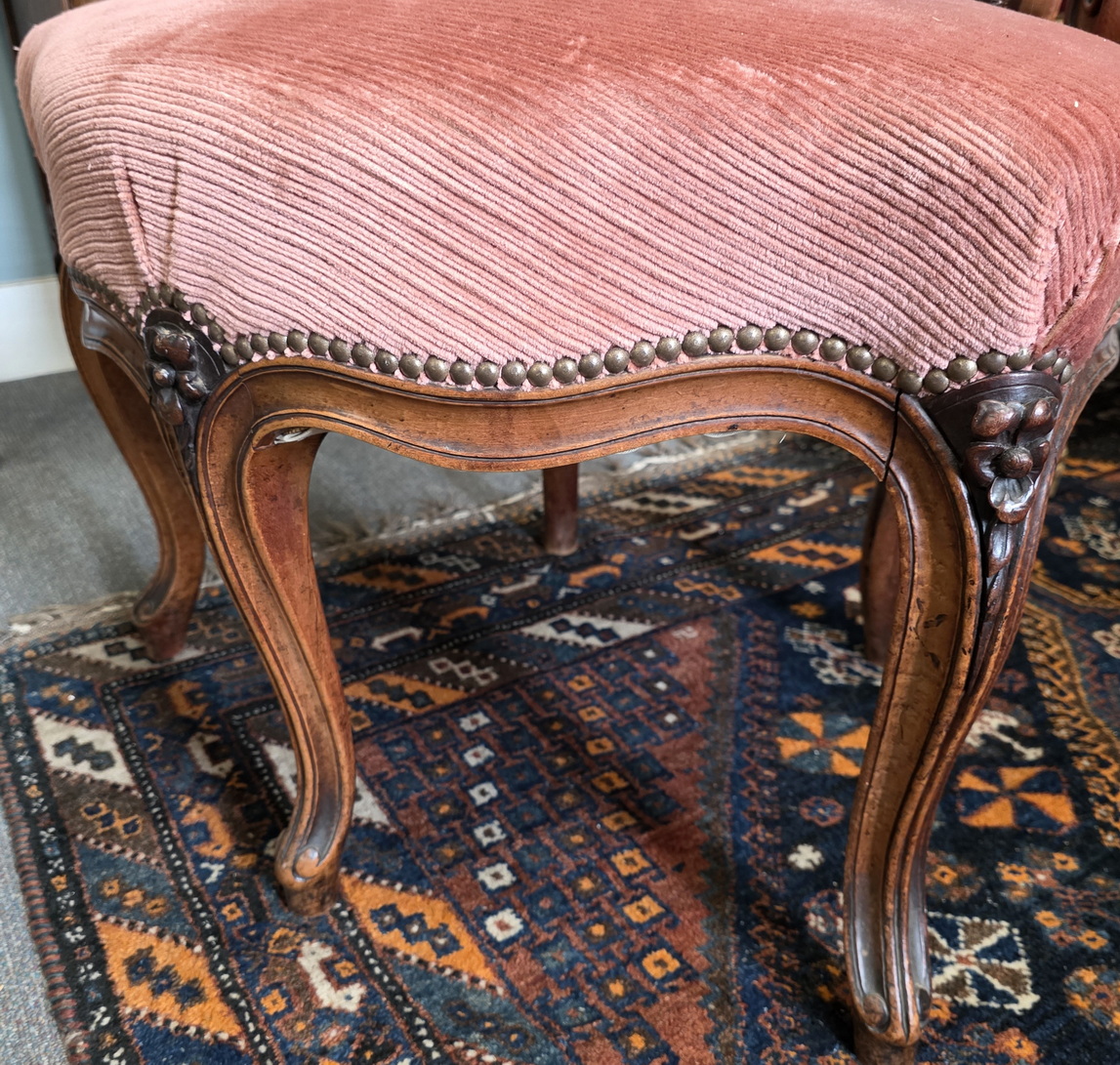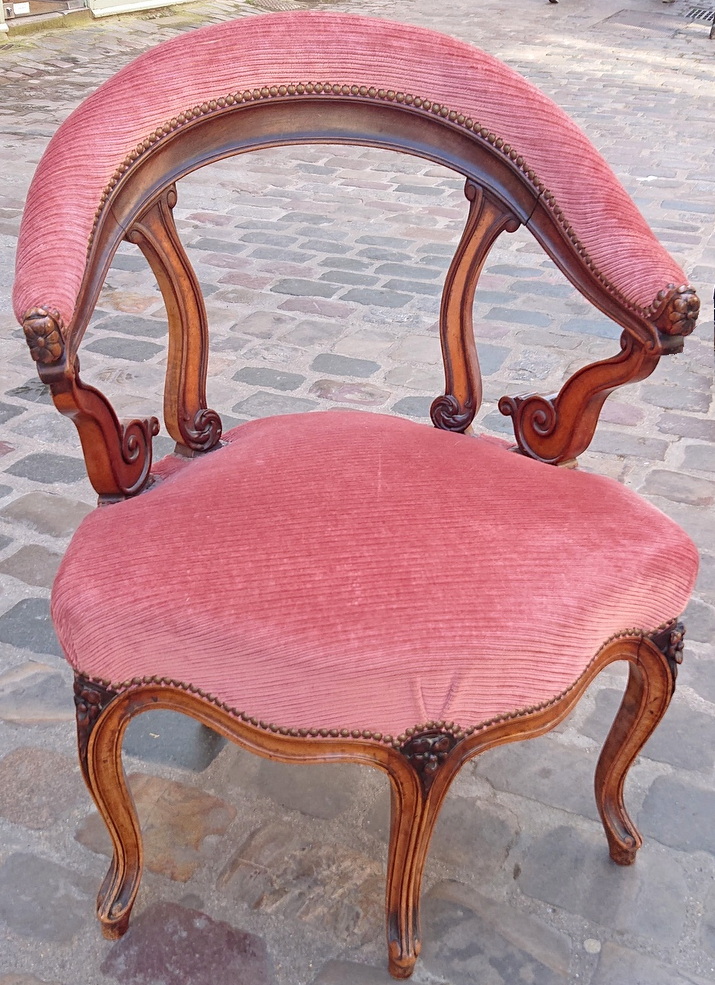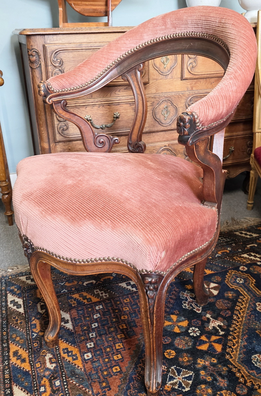 A 19th century French Napoleon III period, Louis XV style Fauteuil de Cabinet desk armchair of wonderful design and proportions, standing on five Cabriole legs, three at the front, two at the rear. The carved solid walnut timbers retaining an excellent, original patination. Decorated with finely carved mouldings and with haut-relief floral motifs. Fitted with a shaped upholstered seat and a curved and upholstered open backrest. Area of Paris, circa 1870.