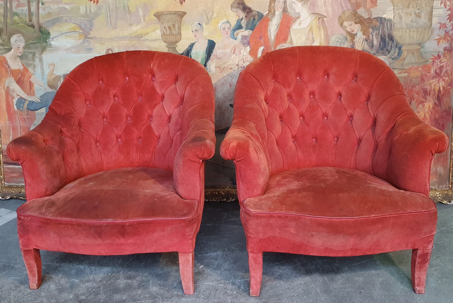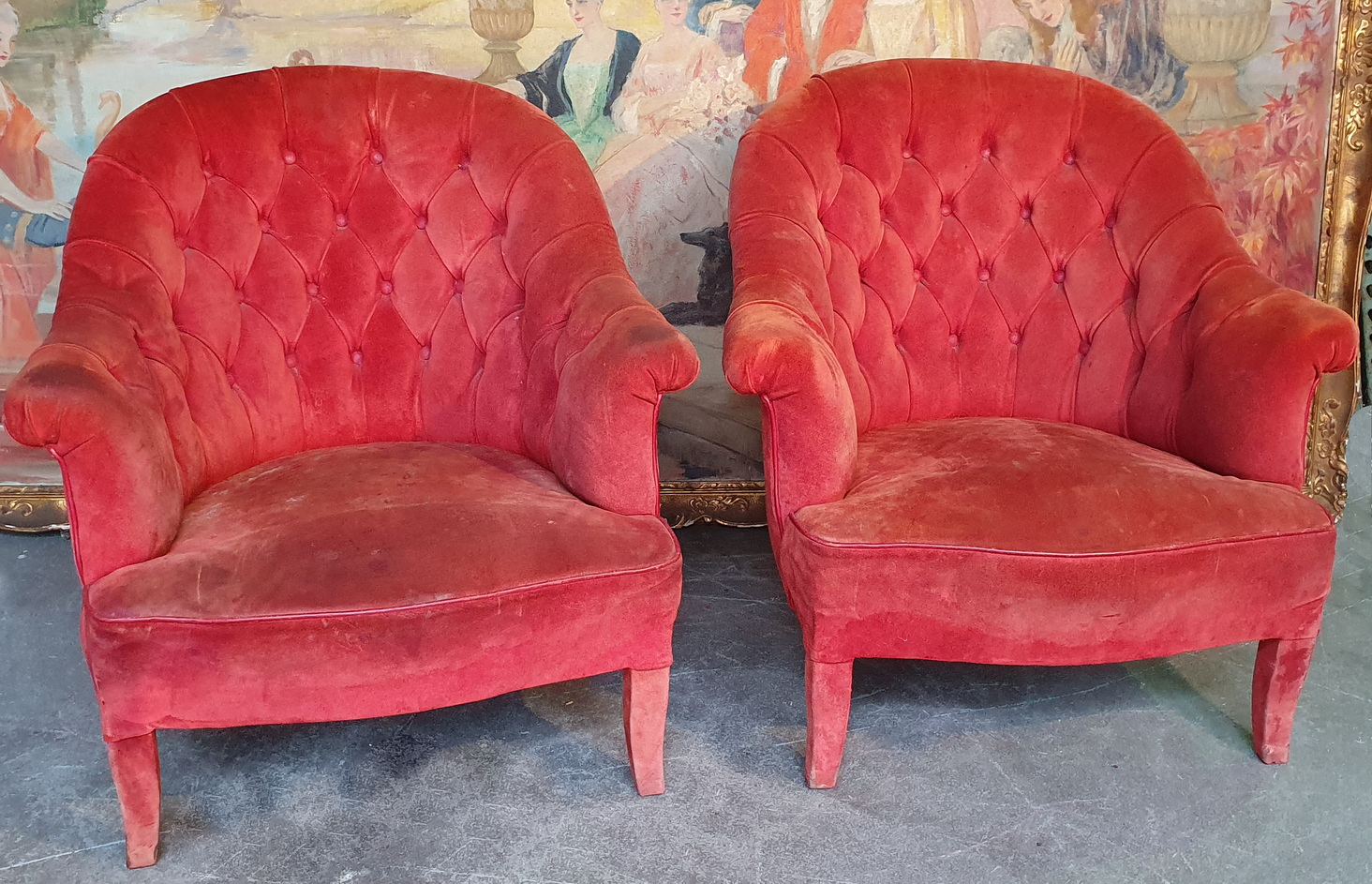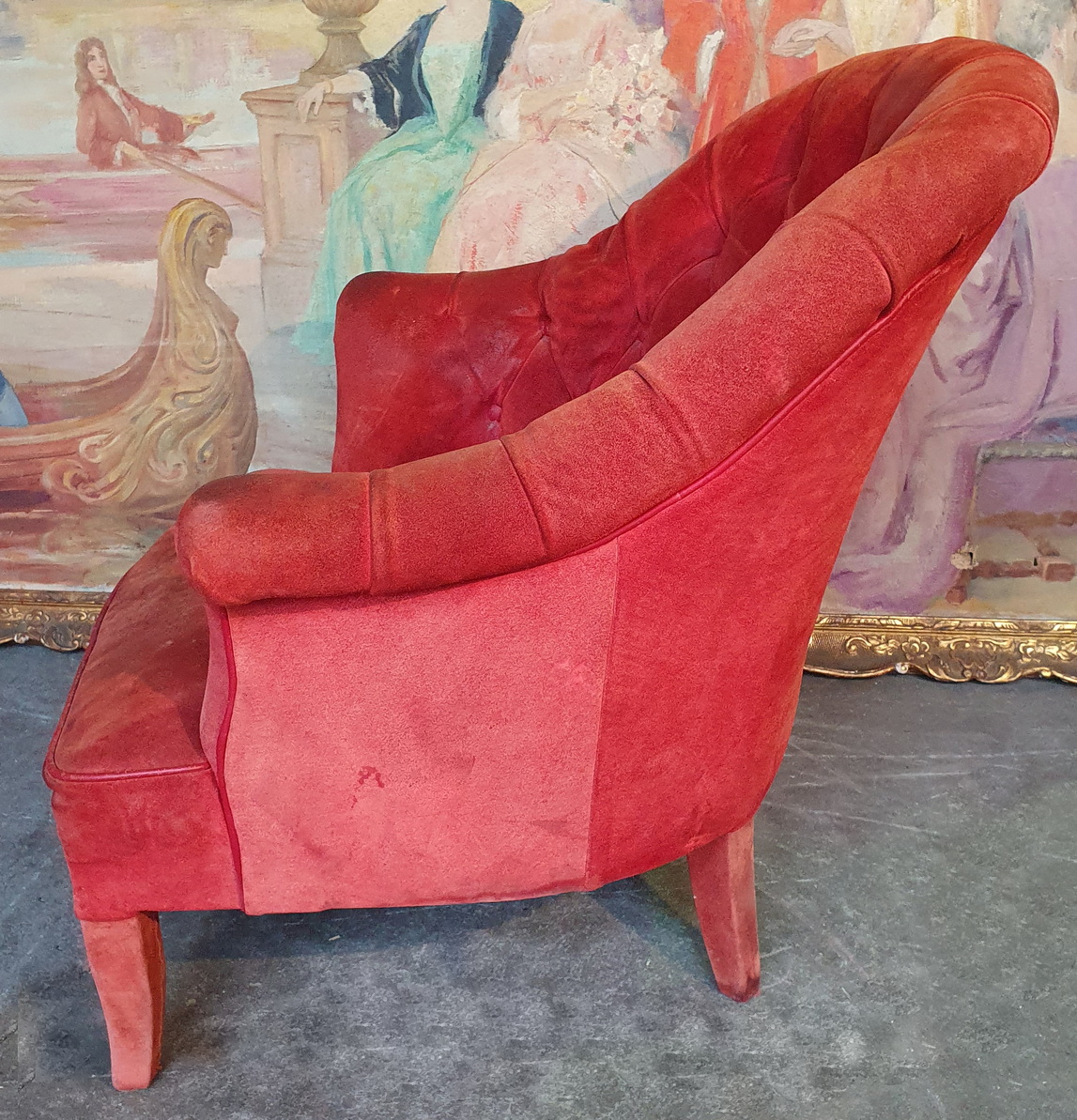 A pair of 19th century French Napoleon III period shammy-upholstered 'Crapaud' tub armchairs, standing on elegantly upholstered feet, the rounded back-rests with diamond-buttoning upholstery above scrolled arm rests and ample seats. Area of Paris, circa 1870.