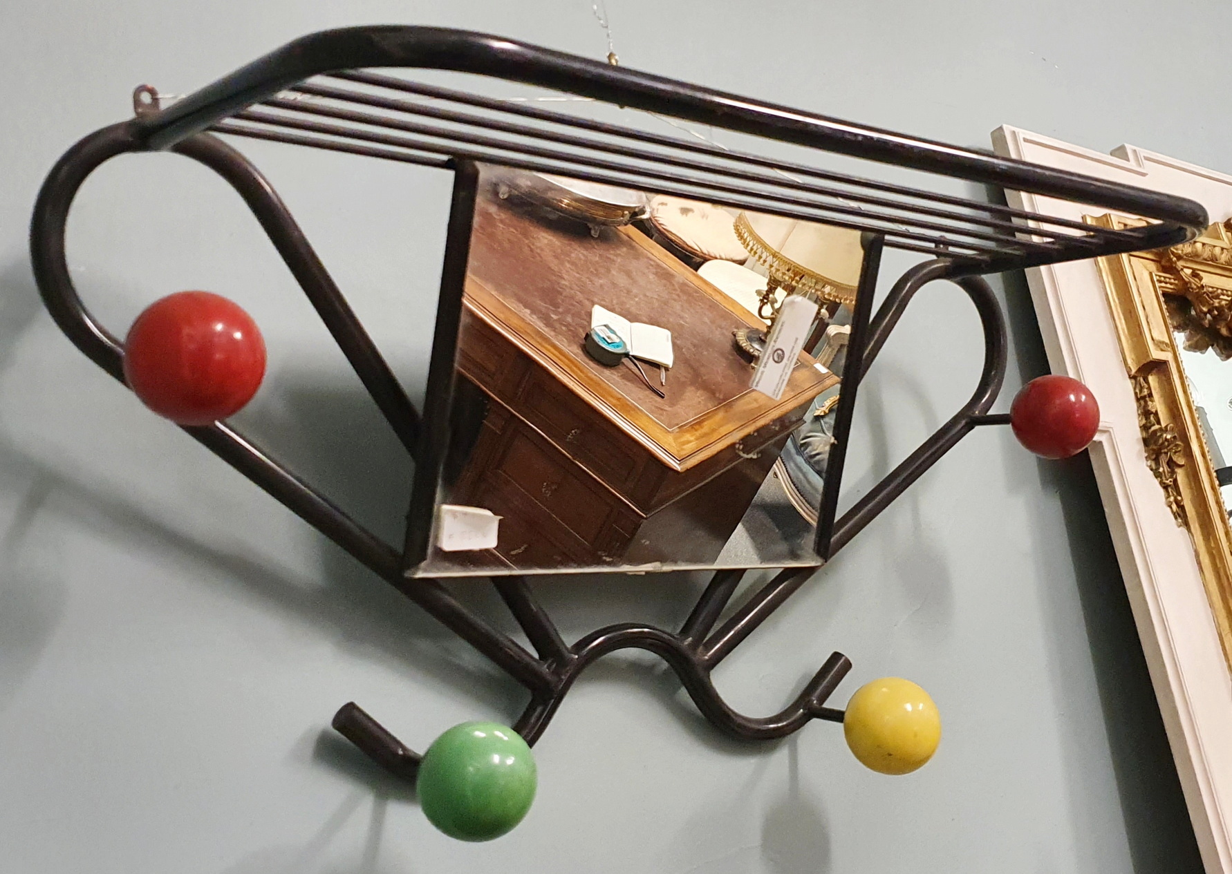 A vintage French coat rack attributed to Roger Feraud, the coat hooks in the shape of coloured billiard balls, a metal bar grille 'hat-rack' sits above the original rectangular mirror. This coat rack is designed to be attached to a wall. Area of Paris, circa 1960.