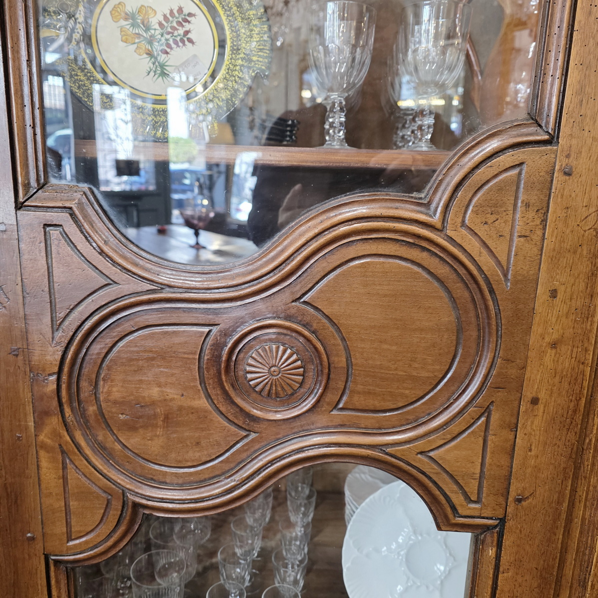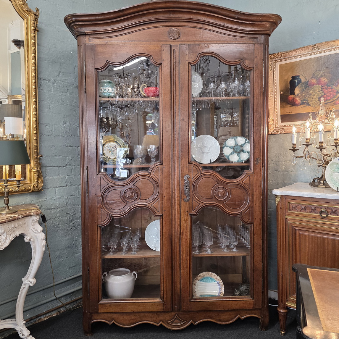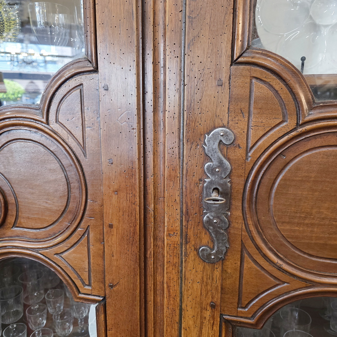 An th century French Provincial solid walnut armoire-bookcase fitted with a curved 'Chapeau de Gendarme' pediment, the doors fitted with glass panes and internally fitted with sturdy adjustable-height shelves. The design and haut relief carved decorations are a typical design of the area of Normandy called 'Pays de Caux'. Area of Normandy, circa 1780.