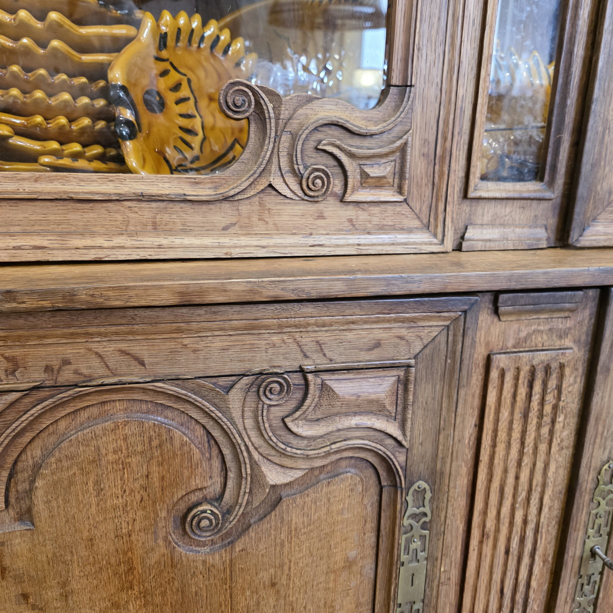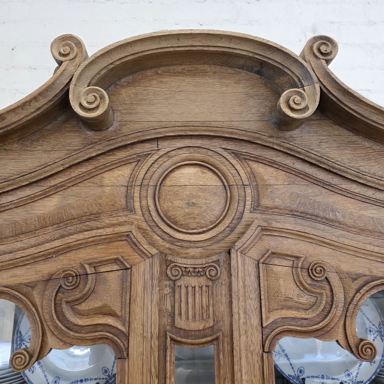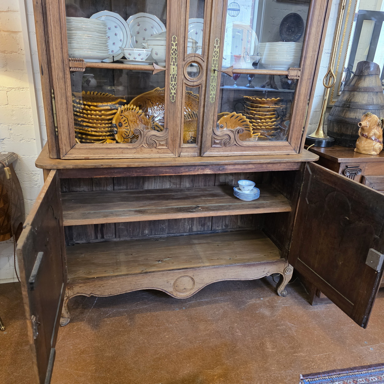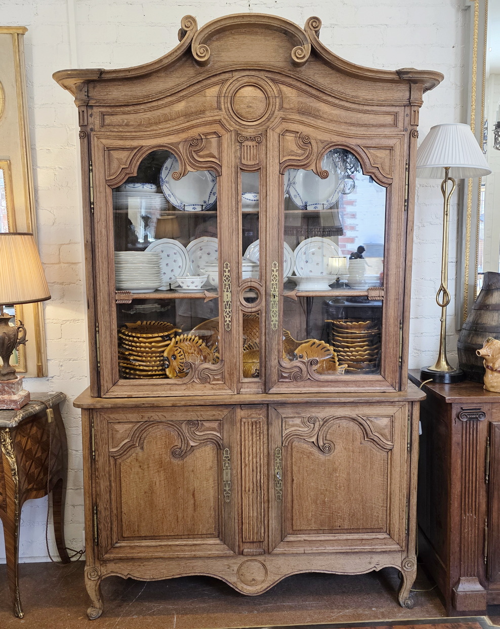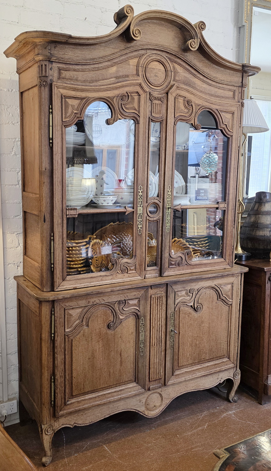 A 19th century French Napoleon III period, Louis XV style, solid oak 'Buffet Vitré', a glazed bookcase-buffet, originally used in a home for food storage and as a display piece for fine China and glassware. The oak timbers are nicely-burnished and retain their original luminous patina. Internally fitted with the original shelving. Please note the elegant and large 'Chapeau de Gendarme' pediment, and the façade, which is decorated with carved arrows, and with typical 'Cauchois' haut relief scrollwork and circular mouldings. This piece, born as a buffet, would make an excellent bookcase. Area of Pays de Caux (Upper Normandy), circa 1860.