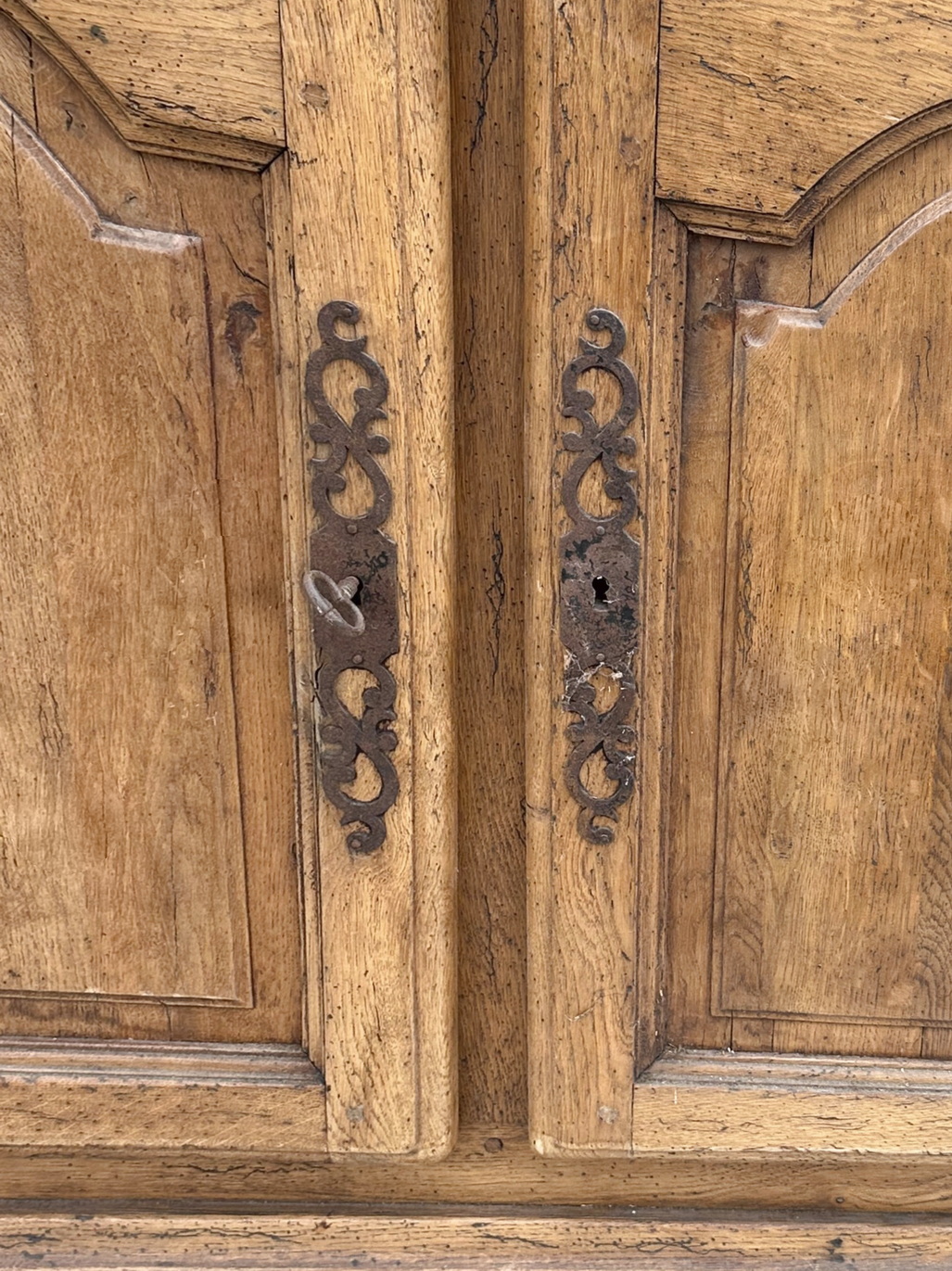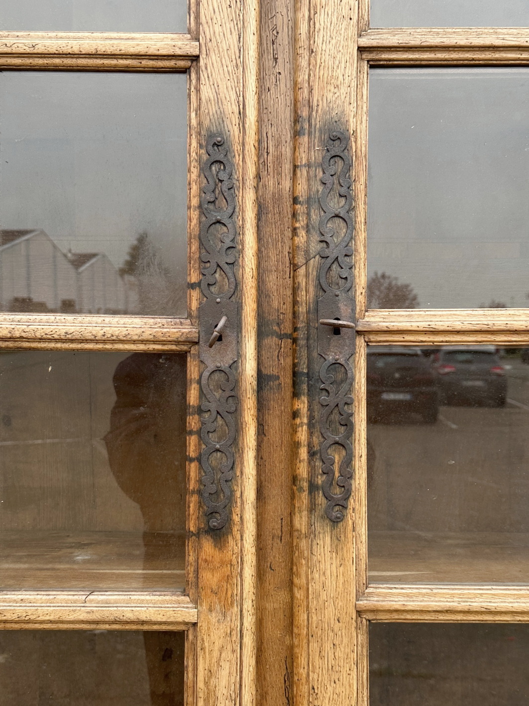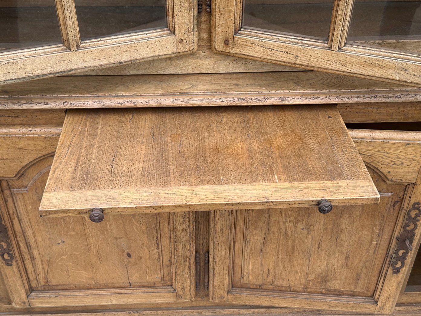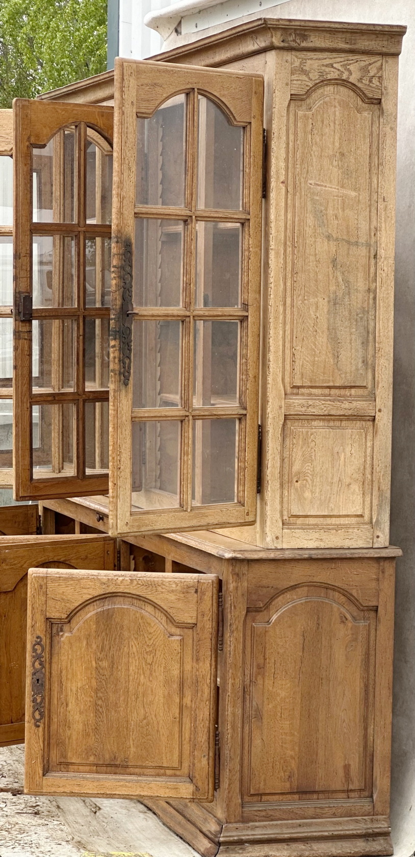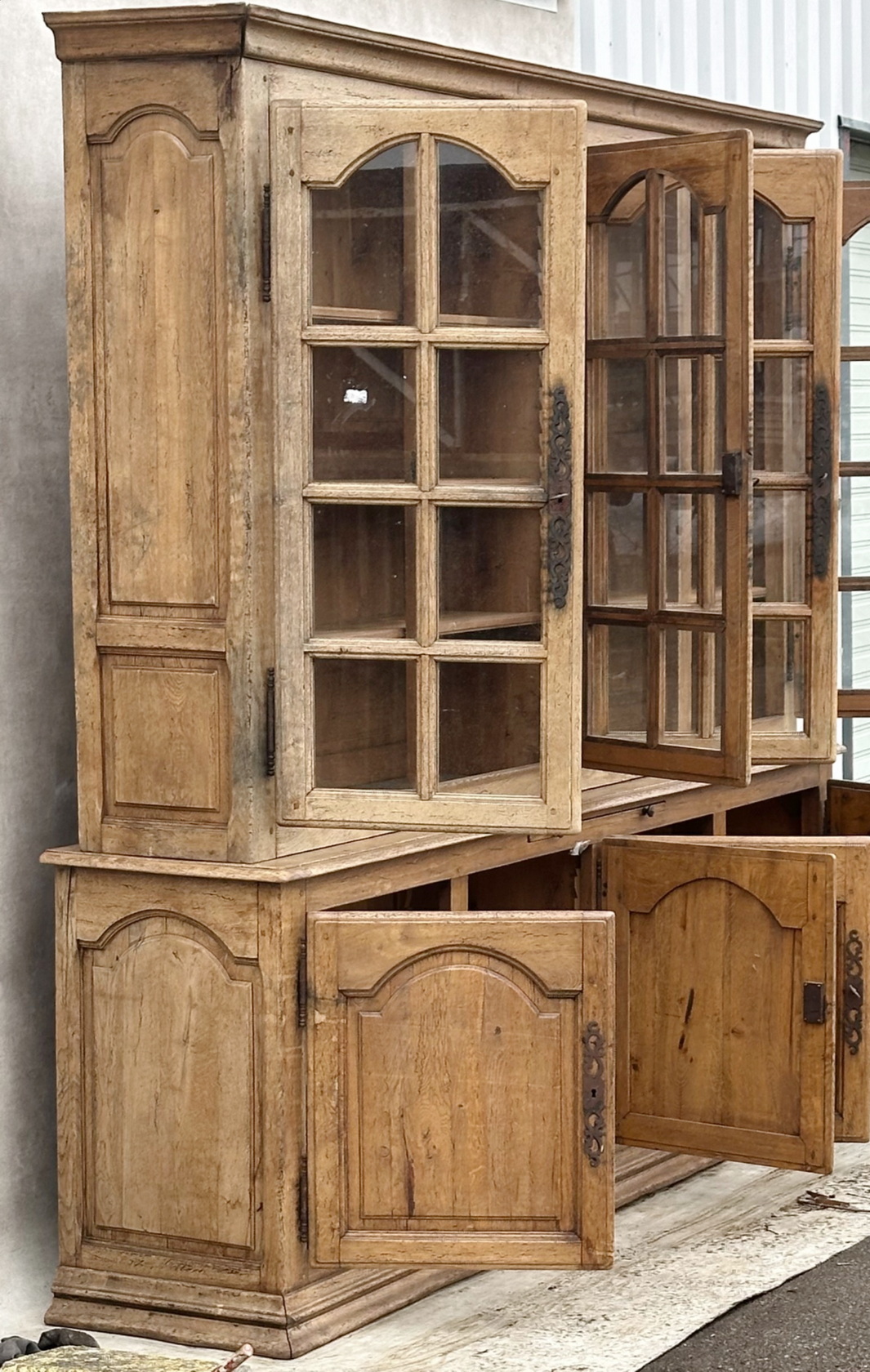 A large, French provincial Regence style solid oak two-part bookcase, the four doors of the top section decorated with formal arched doors and fitted with astragal glazing, the lower-section doors with well-moulded panelling. Internally fitted with adjustable-height shelves and externally with a pull-out slide. Please note the wonderful, luminous oak colour. Retaining the original shelving, working locks and steel escutcheons. Area of the Loire, circa 1950.