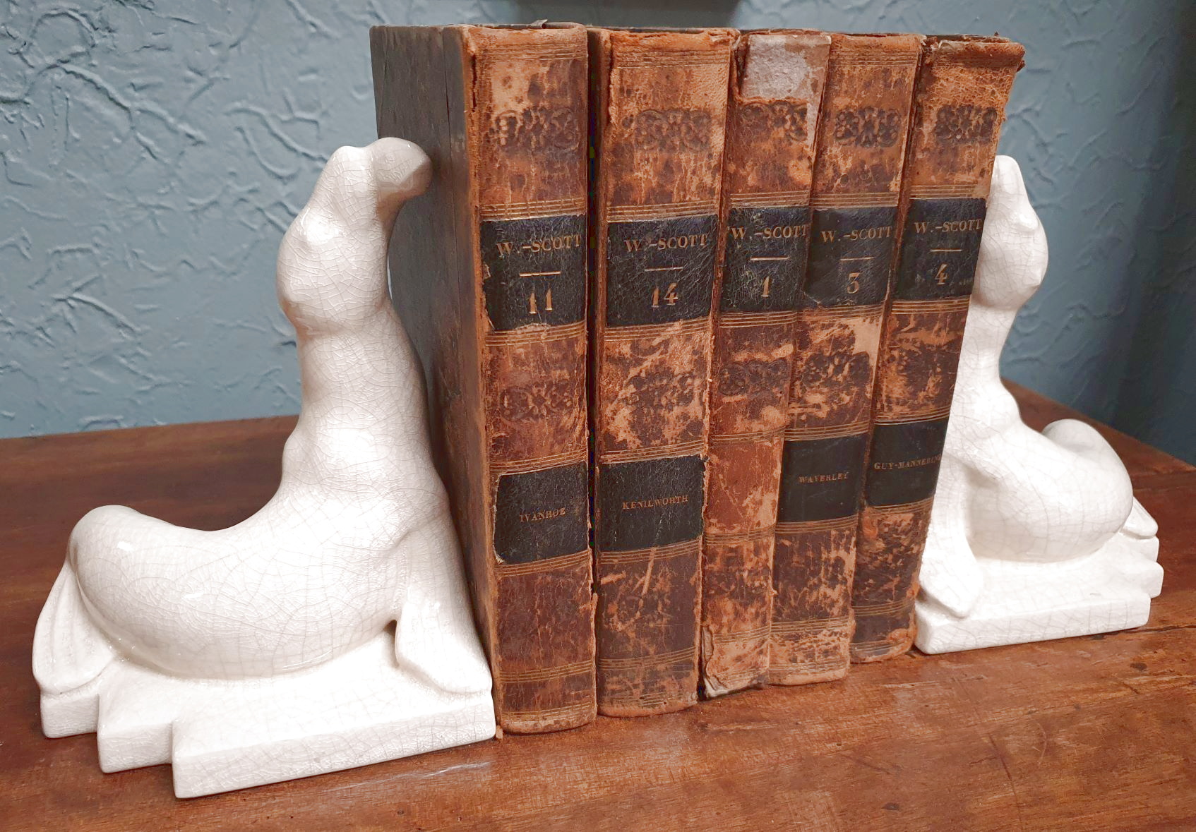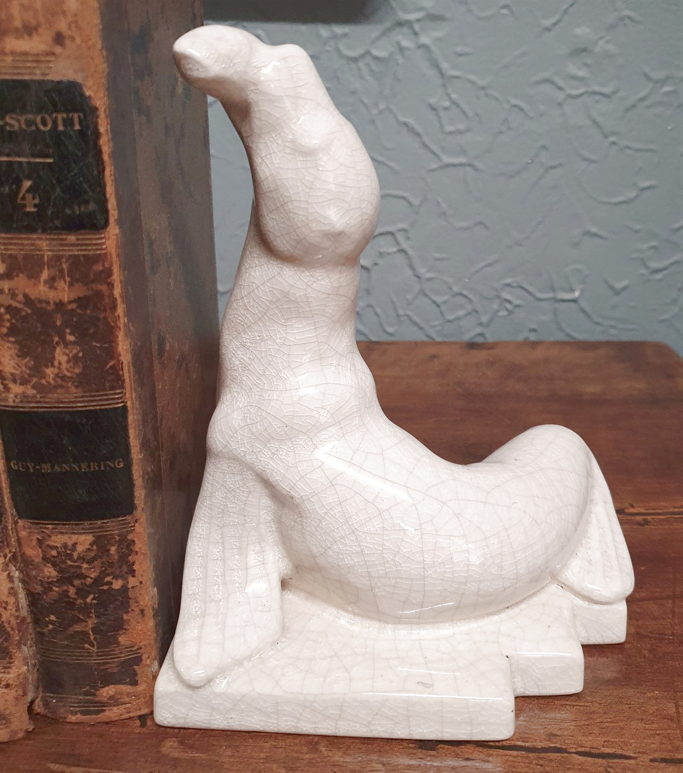 A pair of early 20th century French Art Deco period bookends decorated in the shape of two rearing sea elephants, the white majolica retaining its original crackle-glazing. Area of Paris, circa 1930.