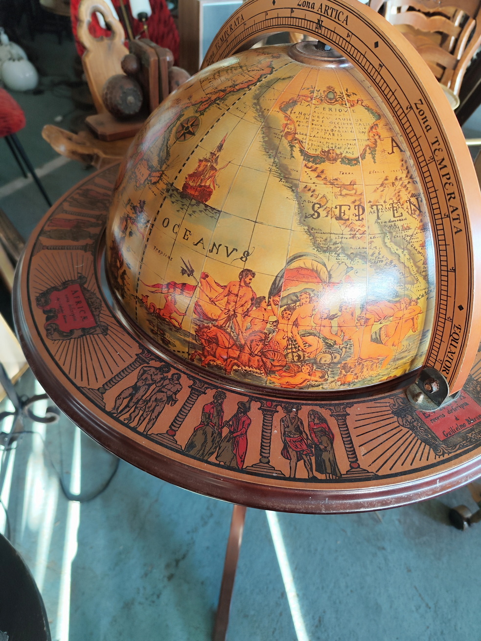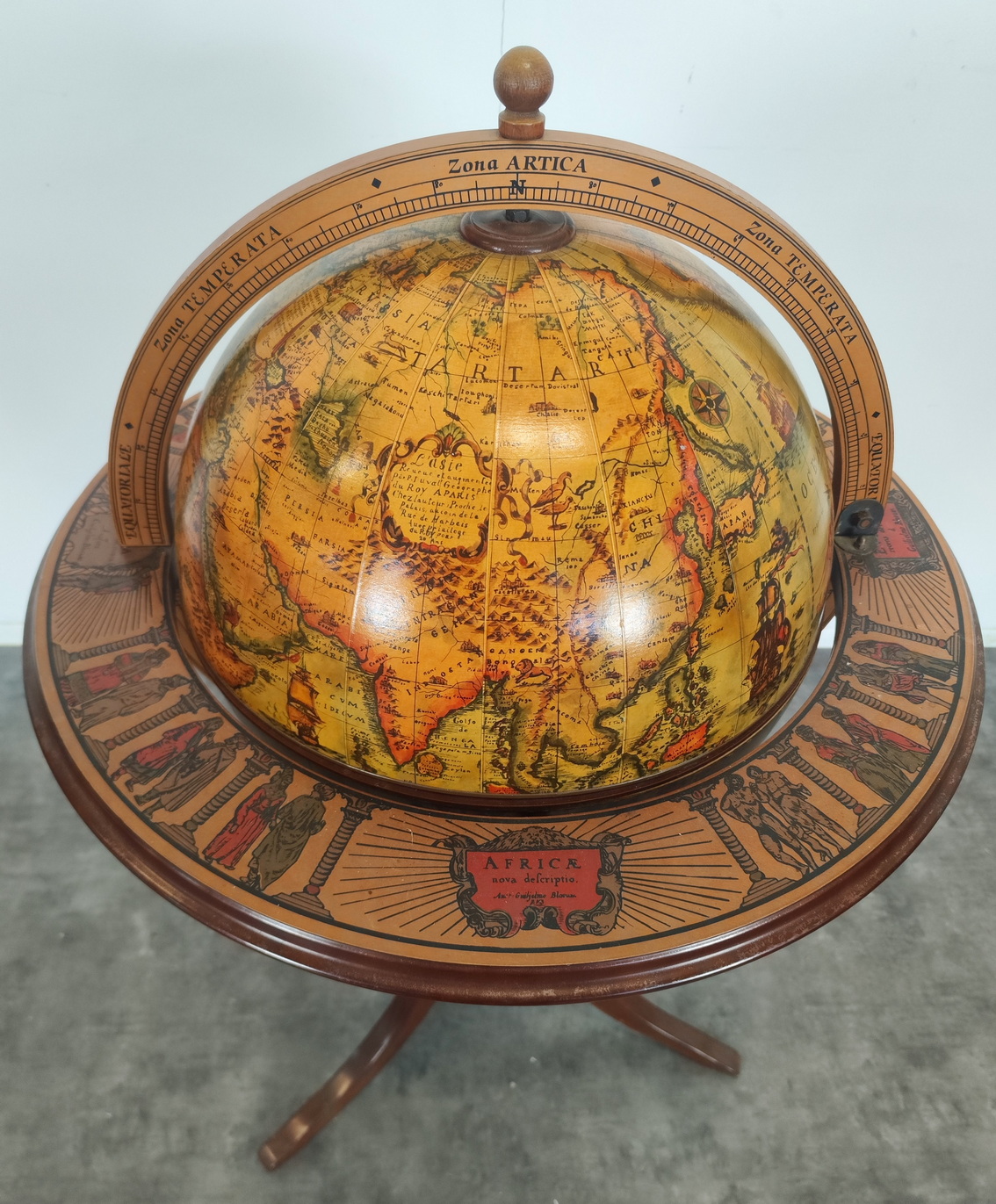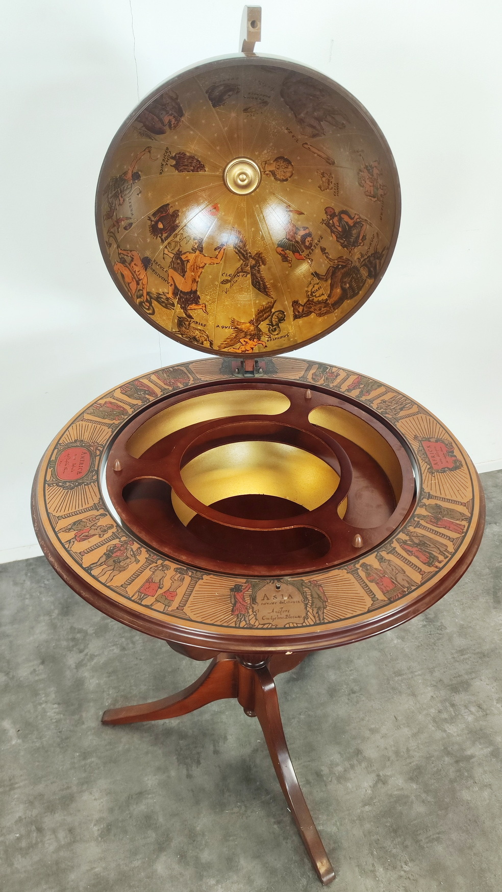 A vintage, mid 20th century French bar-cabinet in the shape of a floor-standing and rotating Atlas globe, decorated with applied prints of old maps, Latin inscriptions and figures of people in traditional dress. The globe opens up to reveal a rotating internal shelf with compartments for bottles and glasses. Area of Paris, circa 1960.