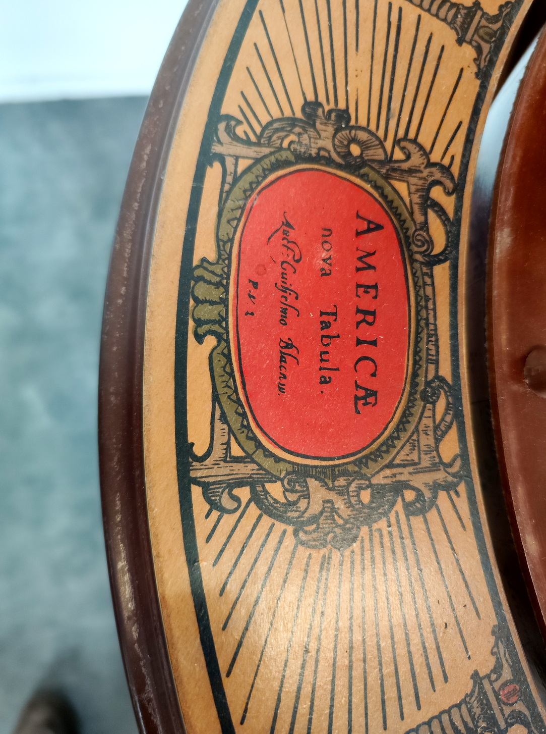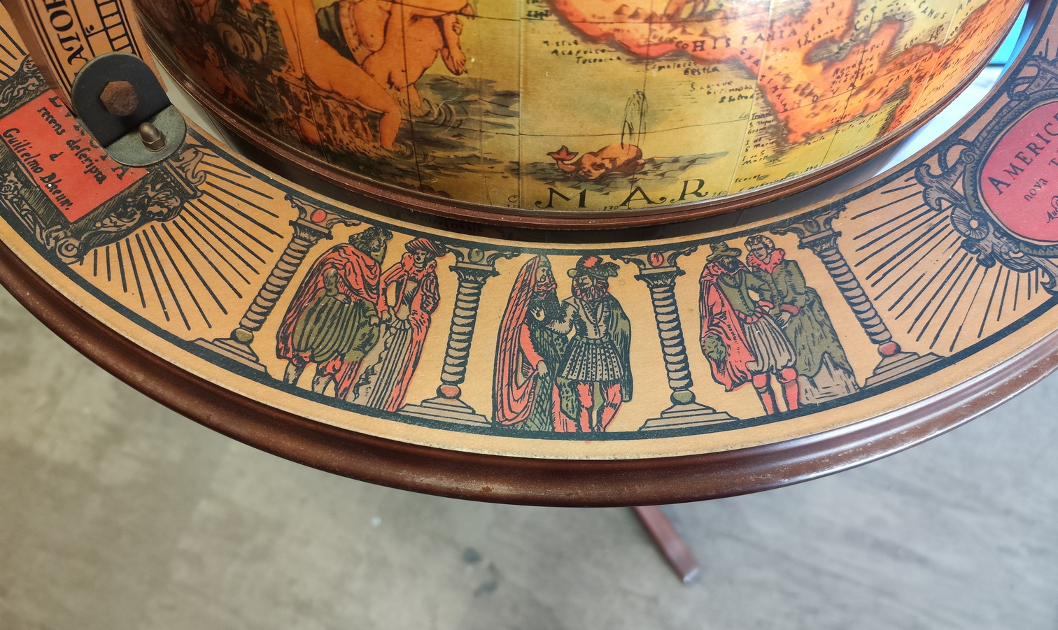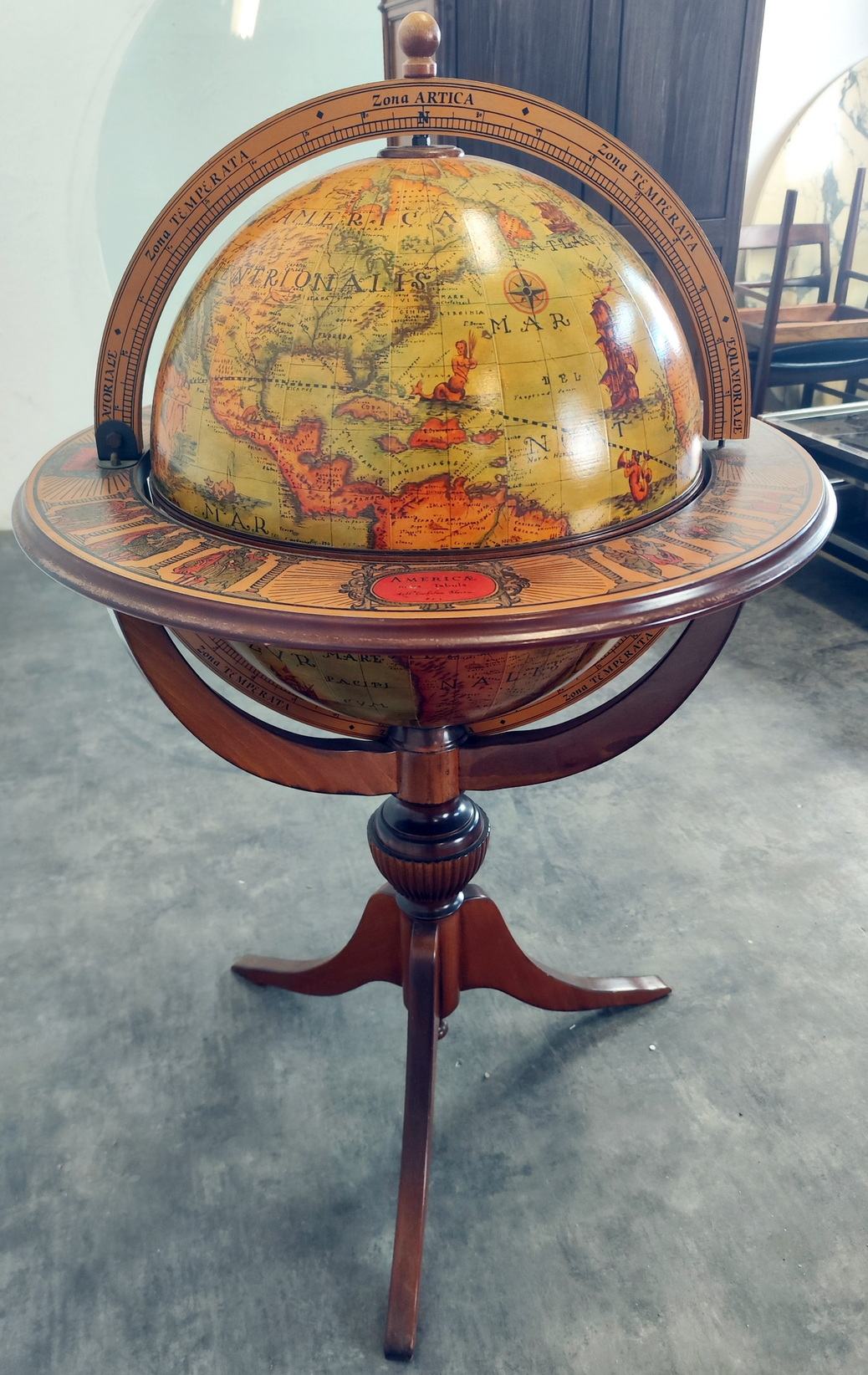 A vintage, mid 20th century French bar-cabinet in the shape of a floor-standing and rotating Atlas globe, decorated with applied prints of old maps, Latin inscriptions and figures of people in traditional dress. The globe opens up to reveal a rotating internal shelf with compartments for bottles and glasses. Area of Paris, circa 1960.