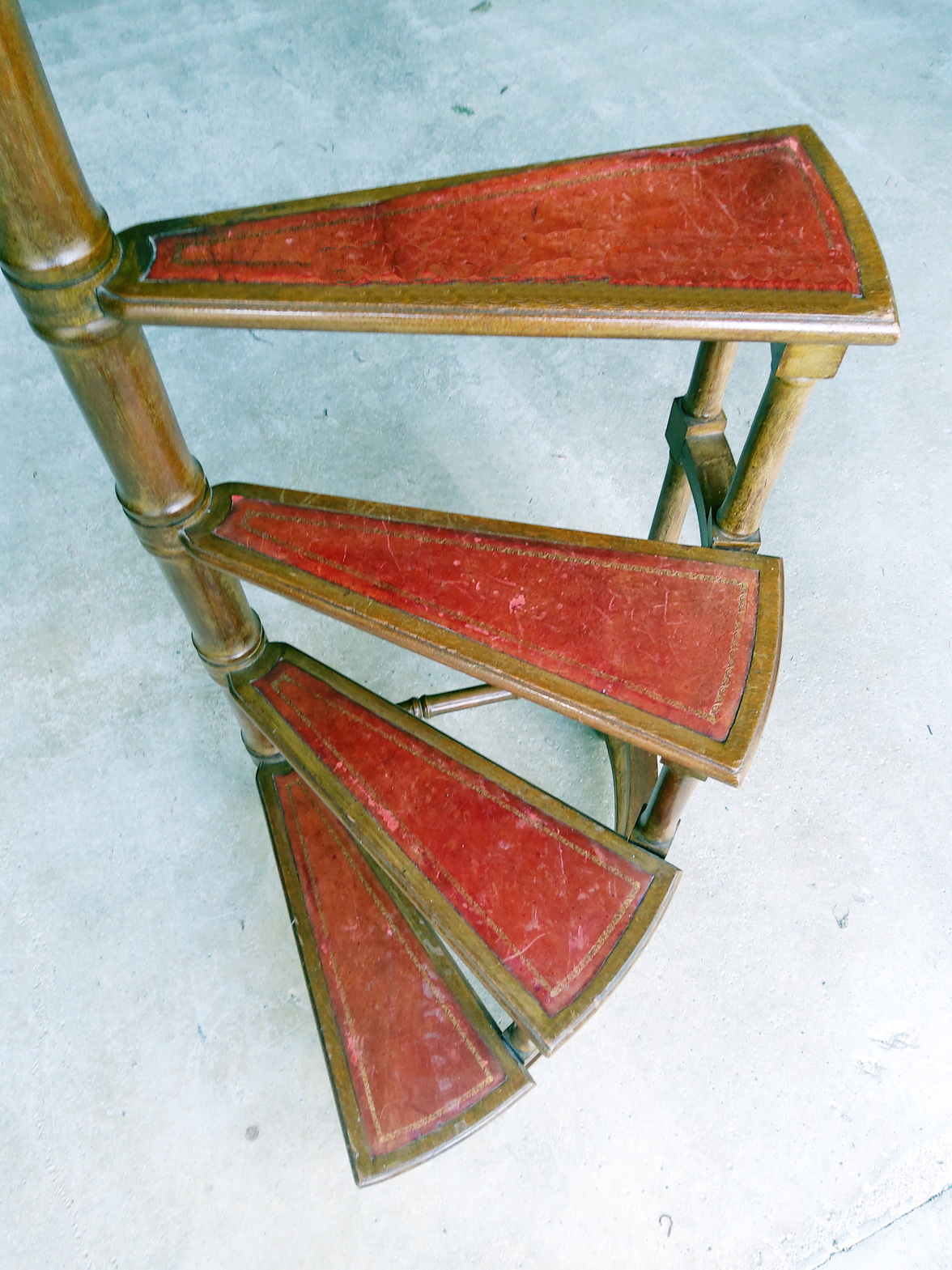 A tall and elegant, quarter-spiral solid beechwood library stepladder, each tread fitted with a gilt-edge leather insert, a tall upright with a turned timber finial as a handrail. Lightweight and robust. Area of Paris, circa 1930.