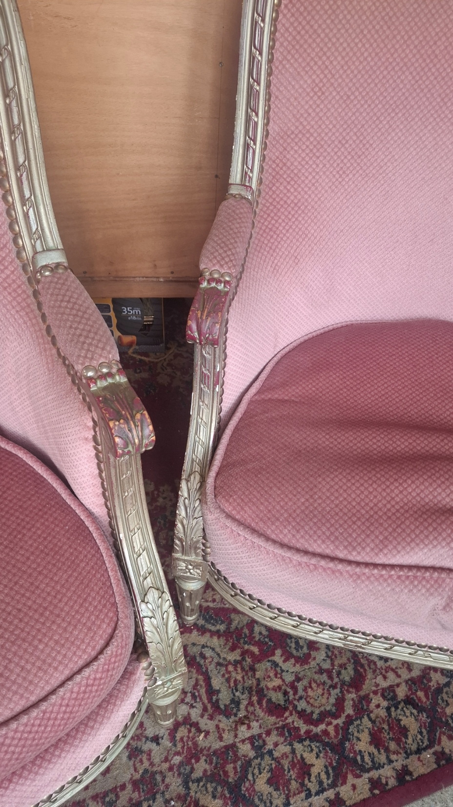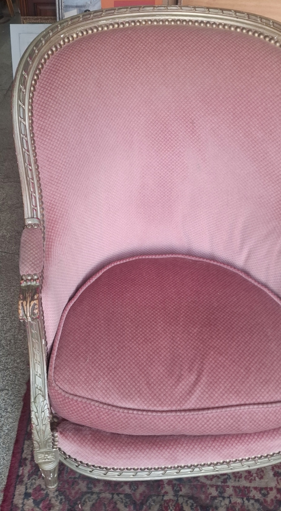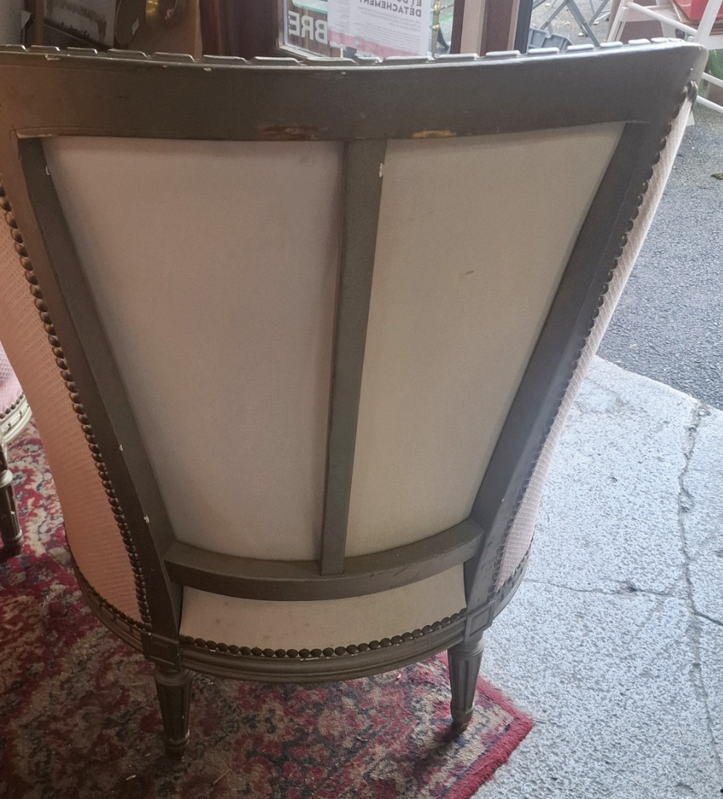 A pair of large sized 19th century French Louis XVI style 'Bergères en Gondole' tub armchairs, the solid beechwood frames decorated with finely carved mouldings and with restrained Neoclassical haut relief-carved decorations. These armchairs are very comfortable to sit in. Area of Paris, circa 1880.