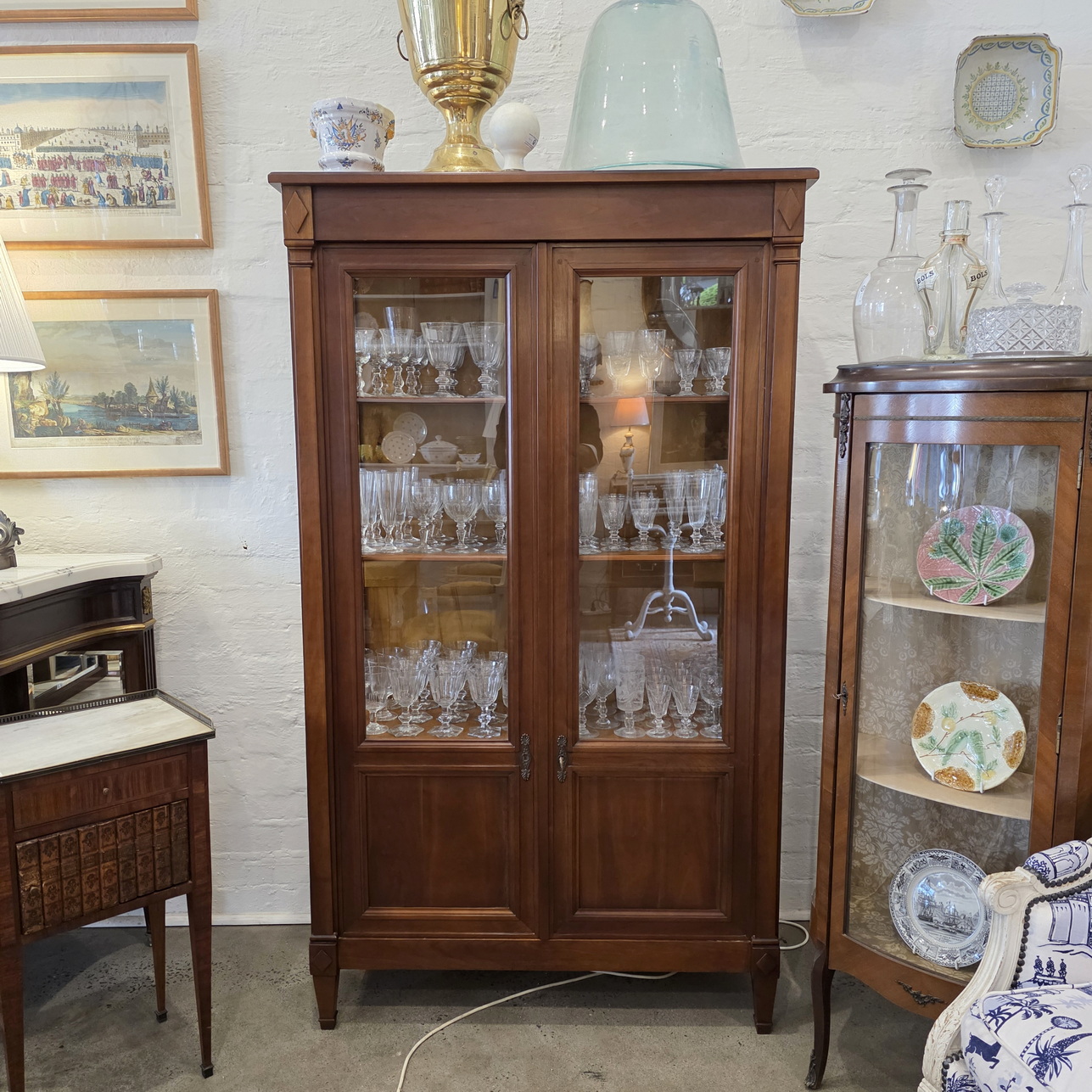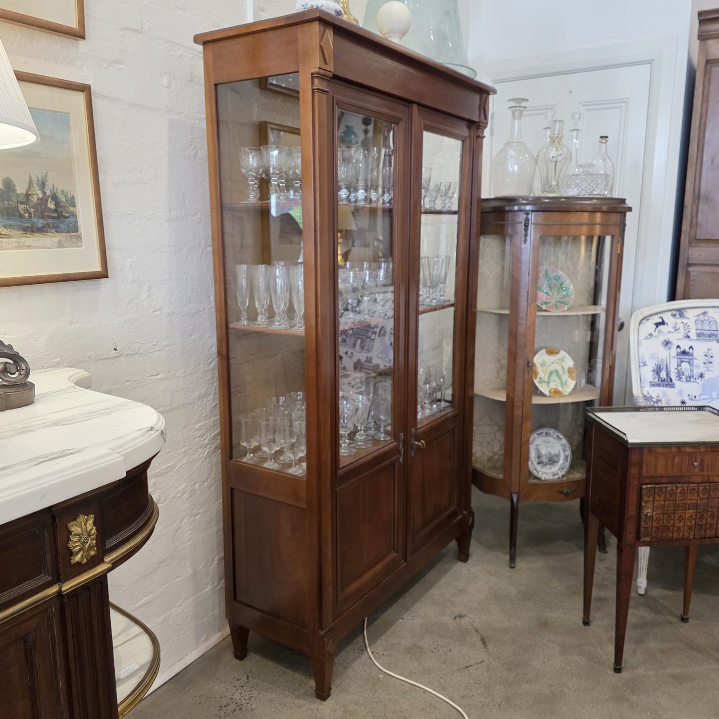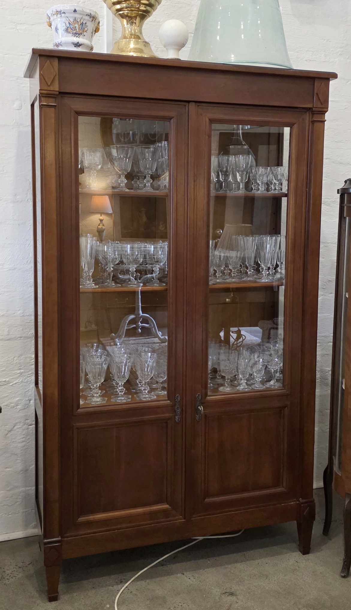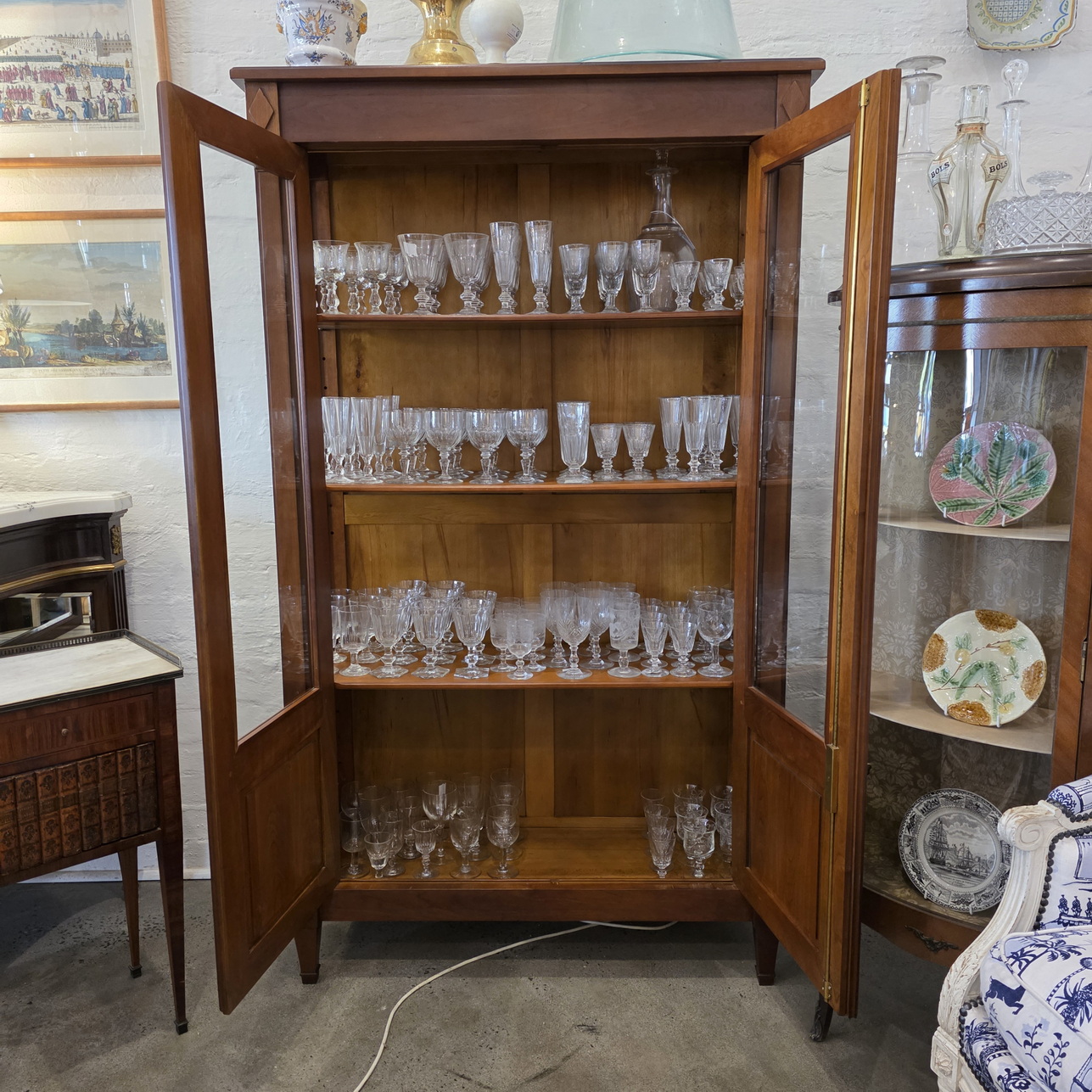 A French Louis XVI style two-door bookcase of good, shallow proportions, the restrained, masculine façade decorated with flat pilasters and diamond paterae. Fitted with clear glass side panels and front door panels and internally fitted with the original, adjustable-height shelves. Retaining the original escutcheons, lock and key. Please note the fine workmanship typical of a cabinetmaking workshop of the Parisian 'Faubourg Saint Antoine'. Area of Paris, circa 1960.