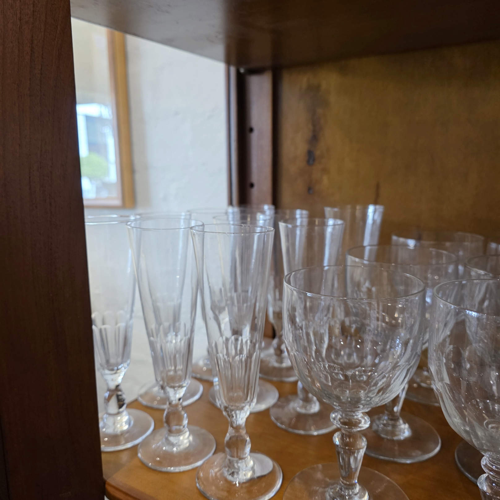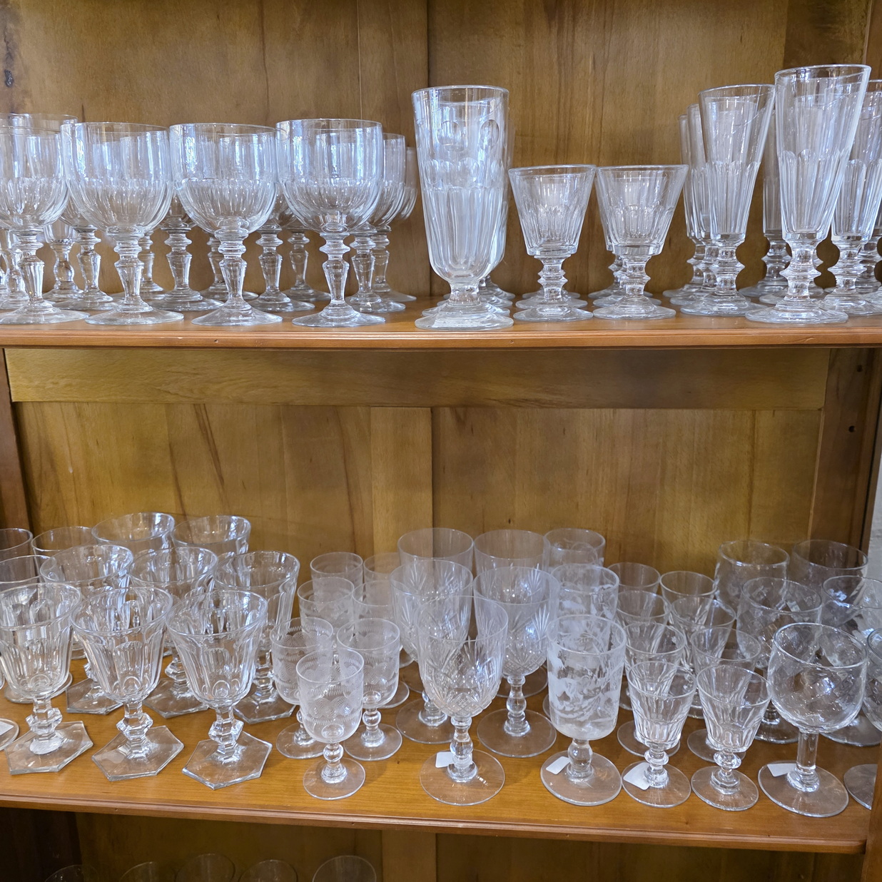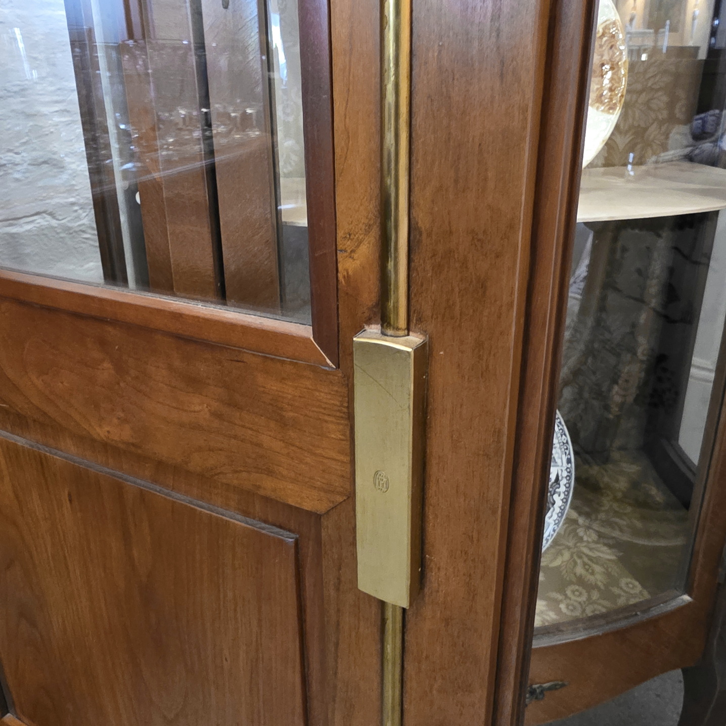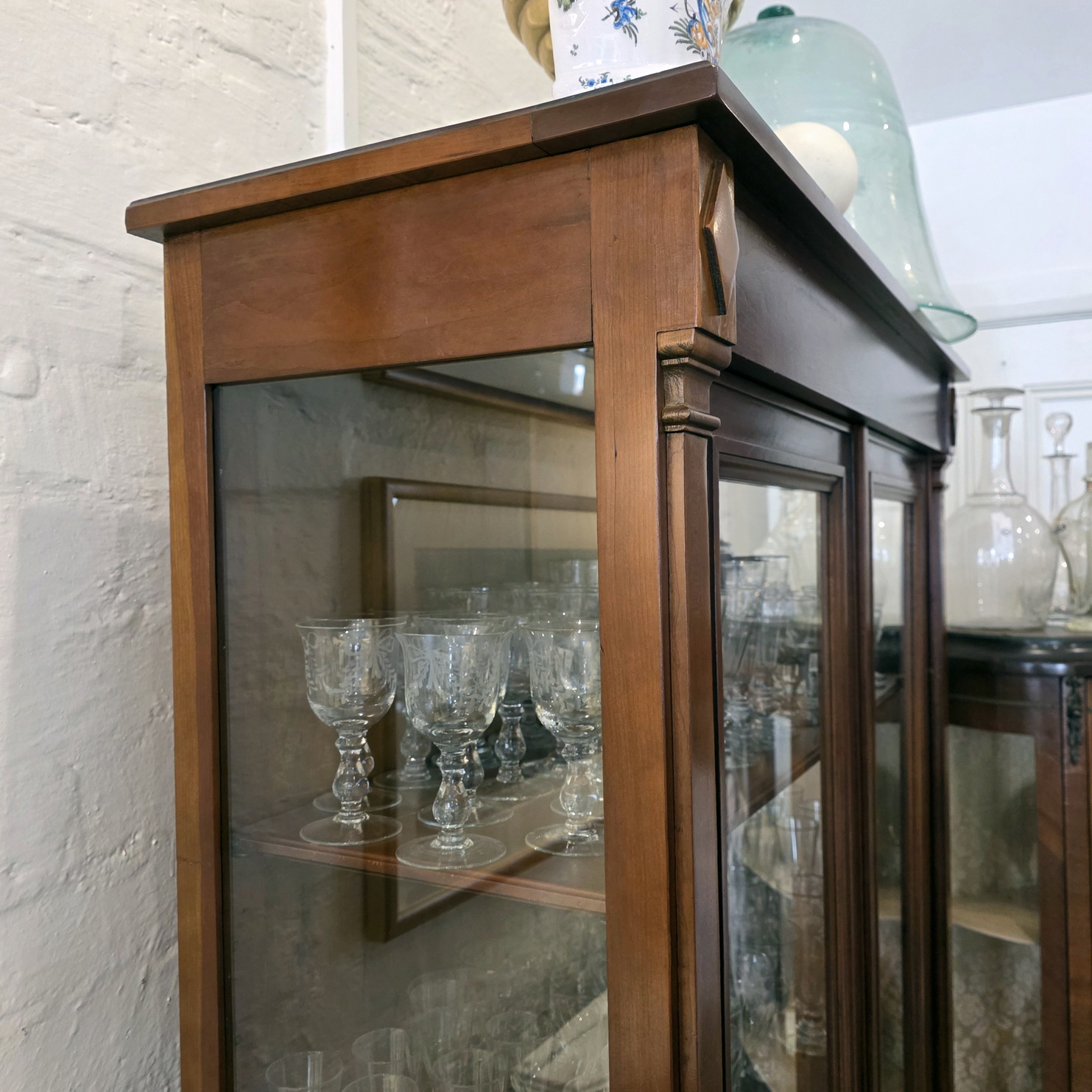 A French Louis XVI style two-door bookcase of good, shallow proportions, the restrained, masculine façade decorated with flat pilasters and diamond paterae. Fitted with clear glass side panels and front door panels and internally fitted with the original, adjustable-height shelves. Retaining the original escutcheons, lock and key. Please note the fine workmanship typical of a cabinetmaking workshop of the Parisian 'Faubourg Saint Antoine'. Area of Paris, circa 1960.