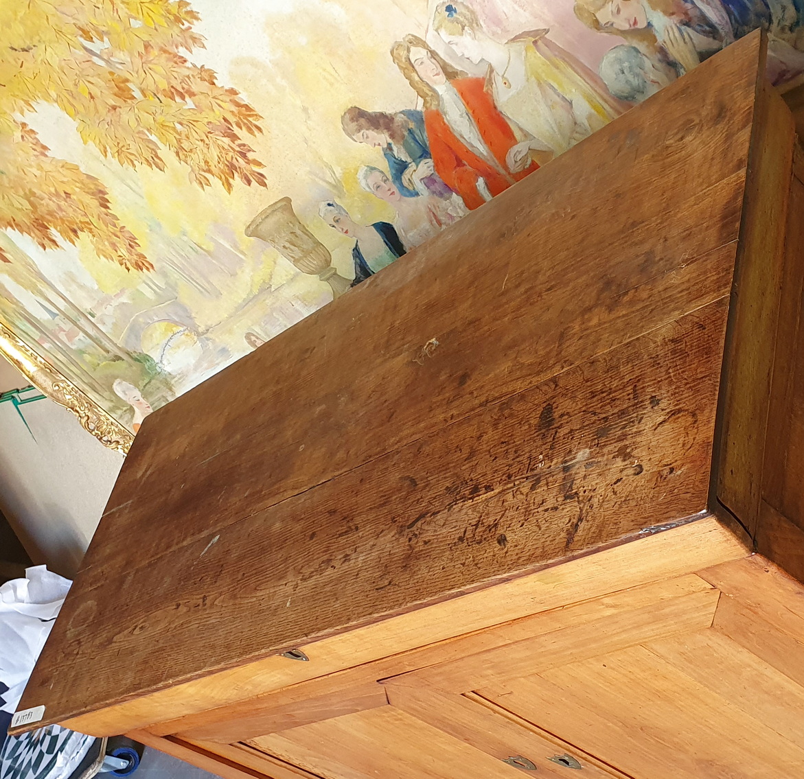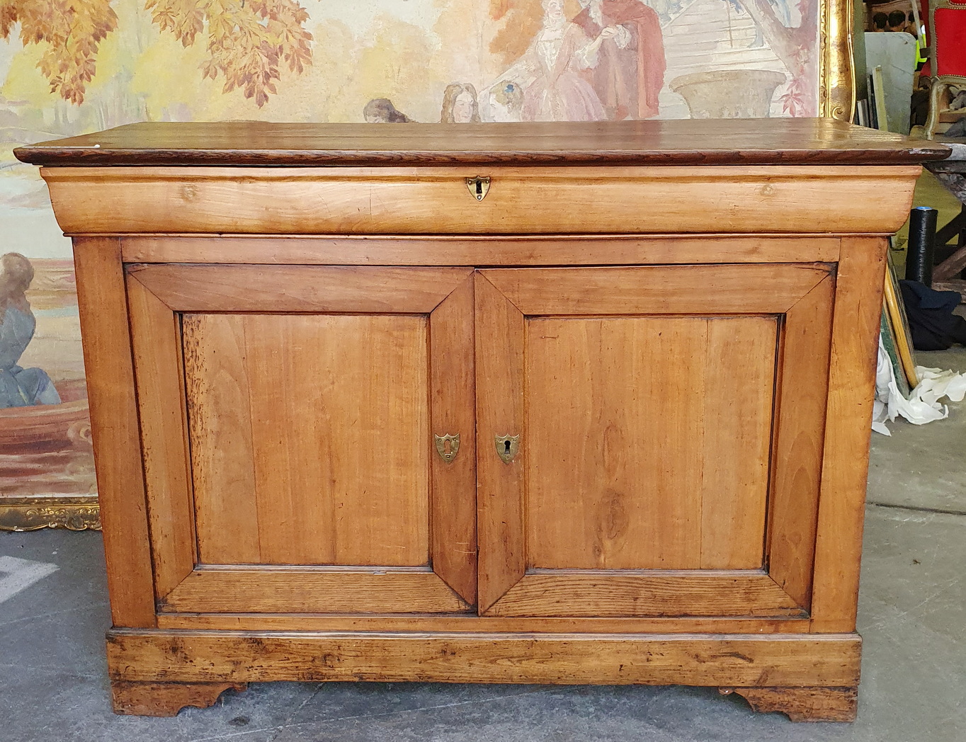 An early 19th century French Louis Philippe period solid cherrywood buffet, the understated façade with two panelled doors and a drawer shaped as a wide ogee moulding. Fitted with the original oak top, locks and key escutcheons. Internally fitted with a sturdy oak shelf. Area of Greater Paris (Isle de France), circa 1830.