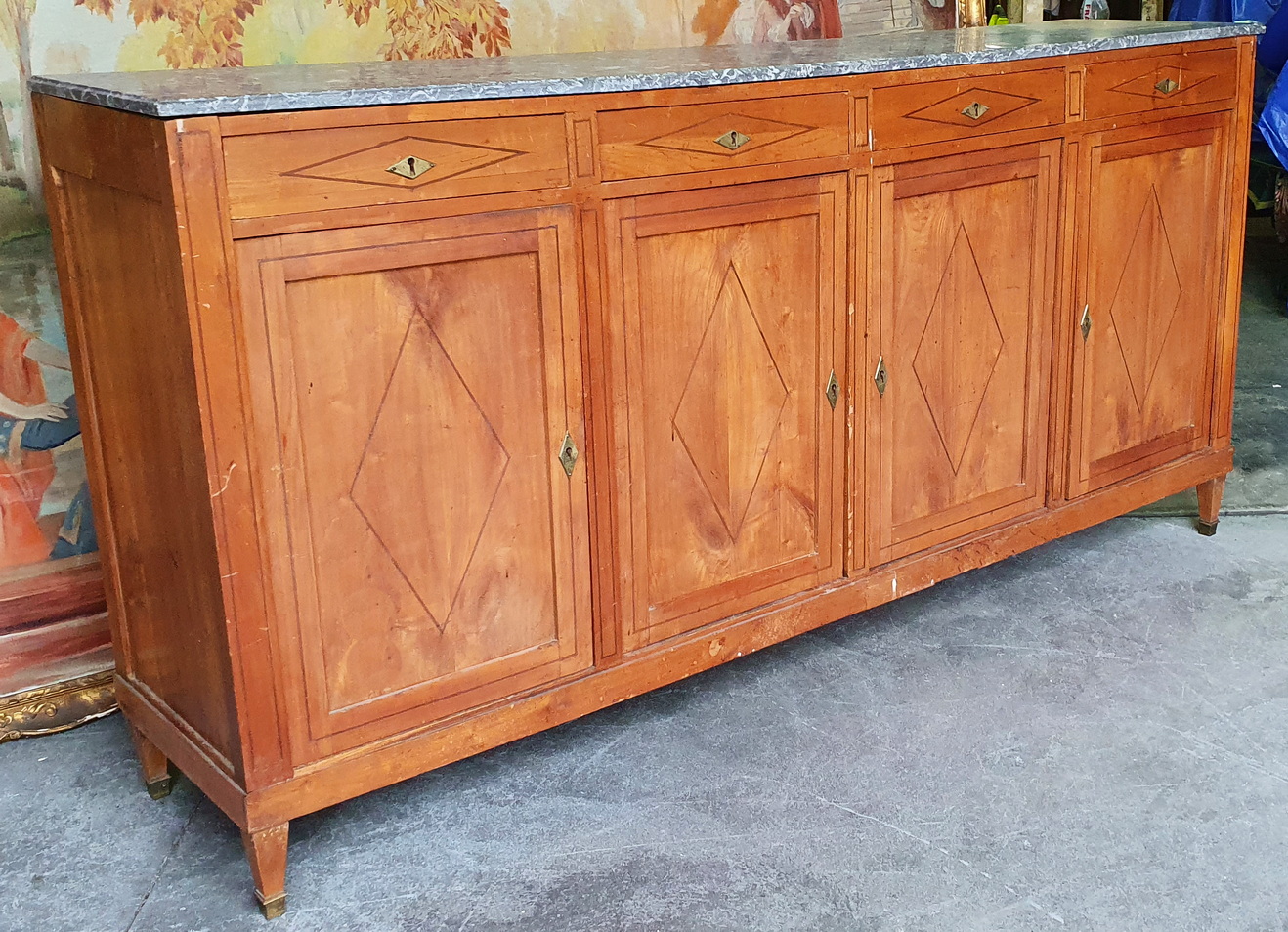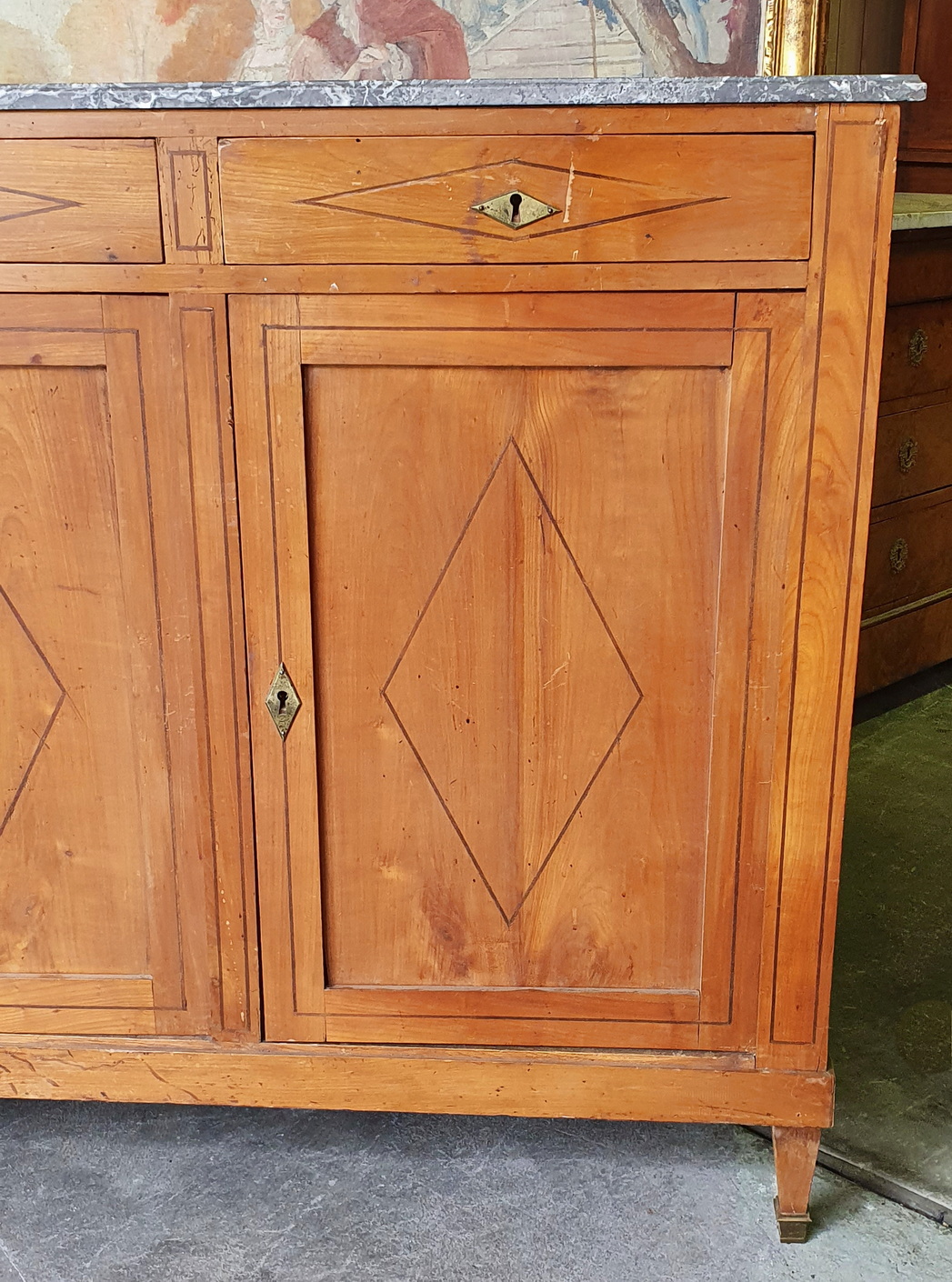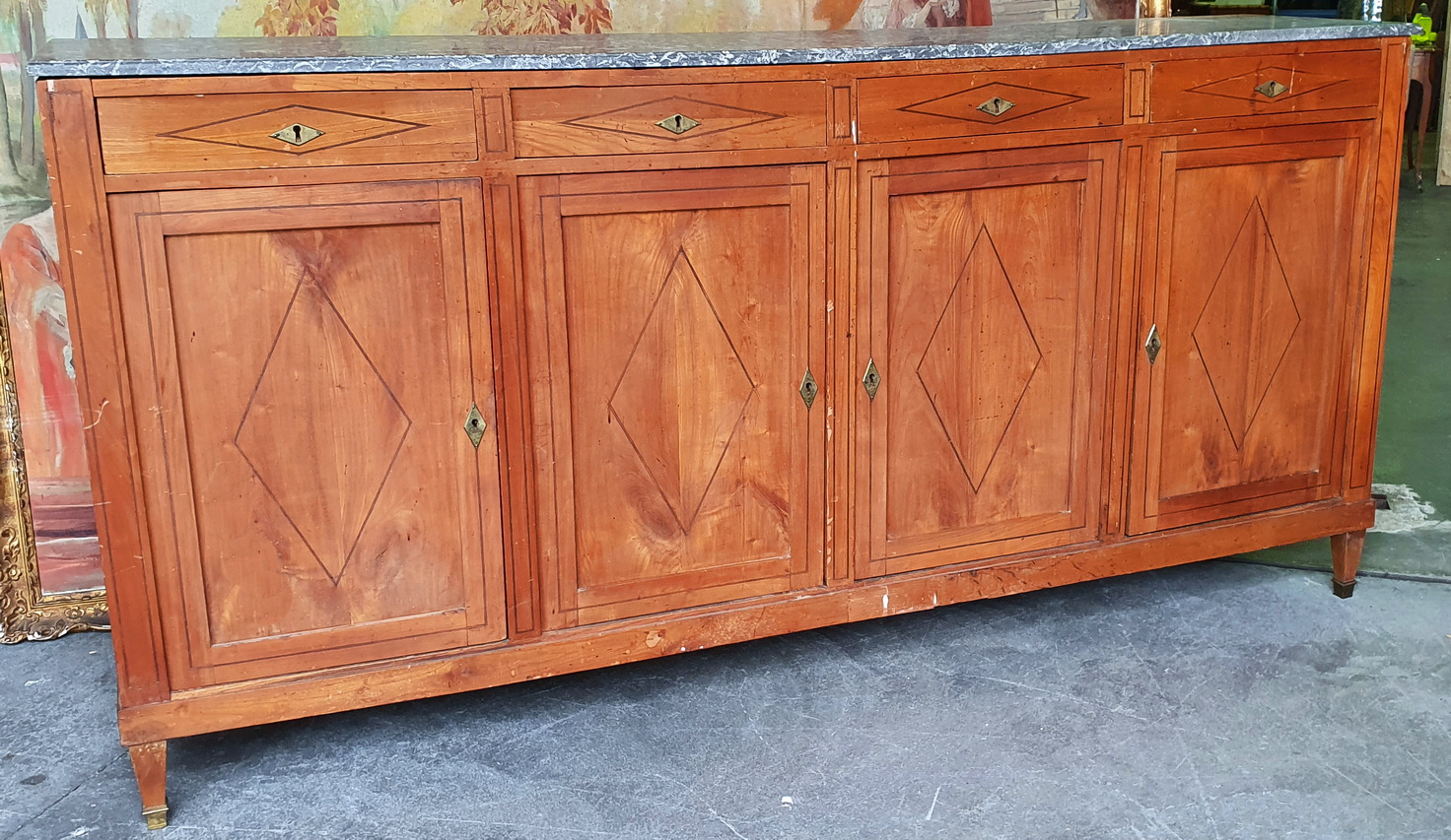 An early 19th century French Directoire period solid cherrywood four door, four drawer Buffet d'Enfilade, decorated with finely inlaid ebony stringing in geometric patterns, retaining its original, moulded-edge gery and white veined Breche marble top. Standing on tapering, square section legs with gilt brass finials. The solid timbers are well-burnished and retain a wonderful, pale patina. The rear showing the early construction bow-saw marks. Area of Isle de France (Greater Paris) circa 1810.